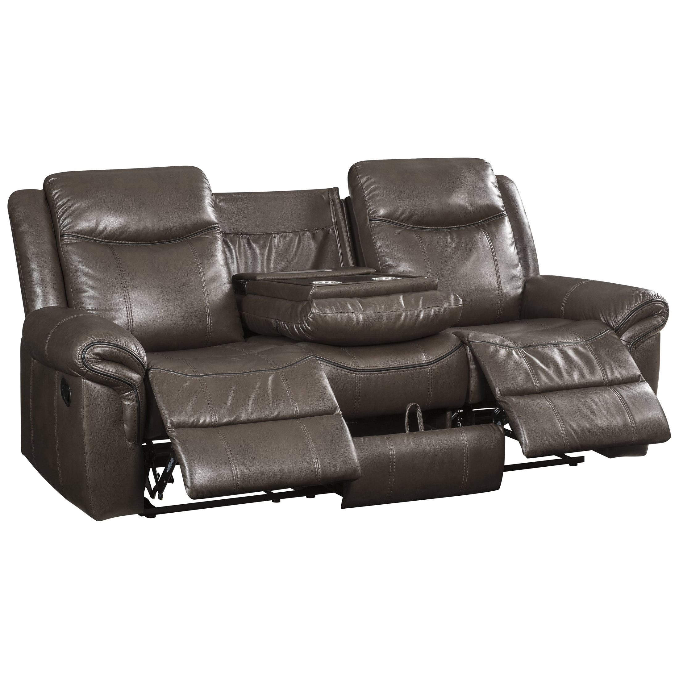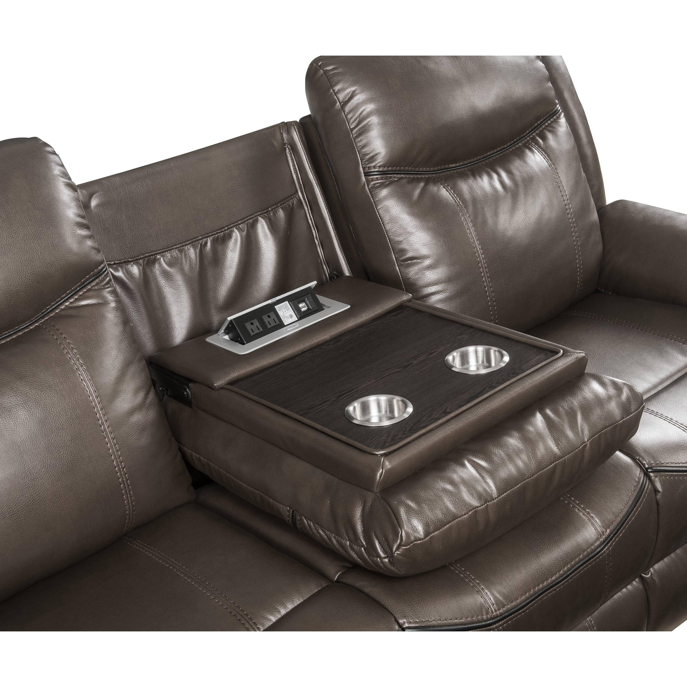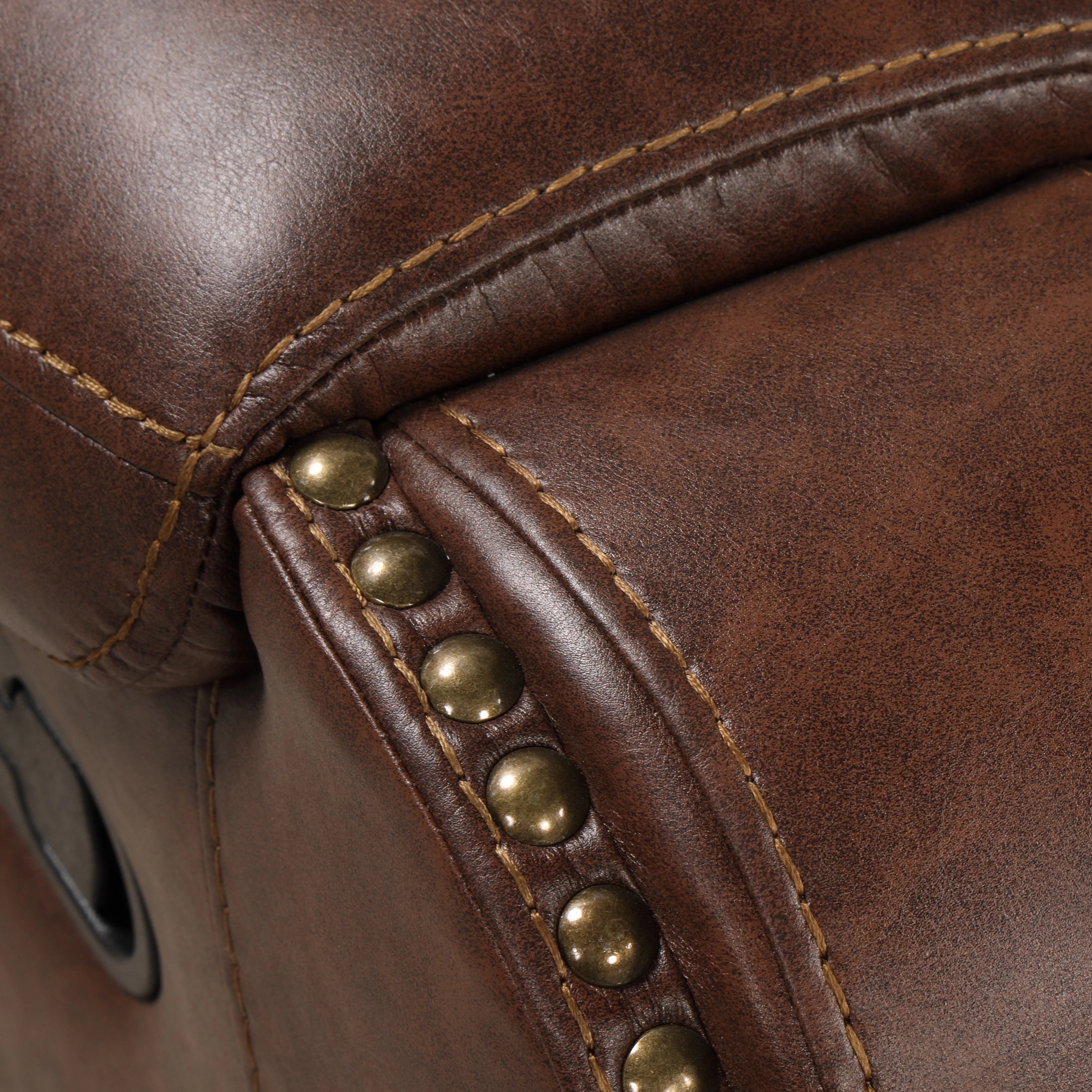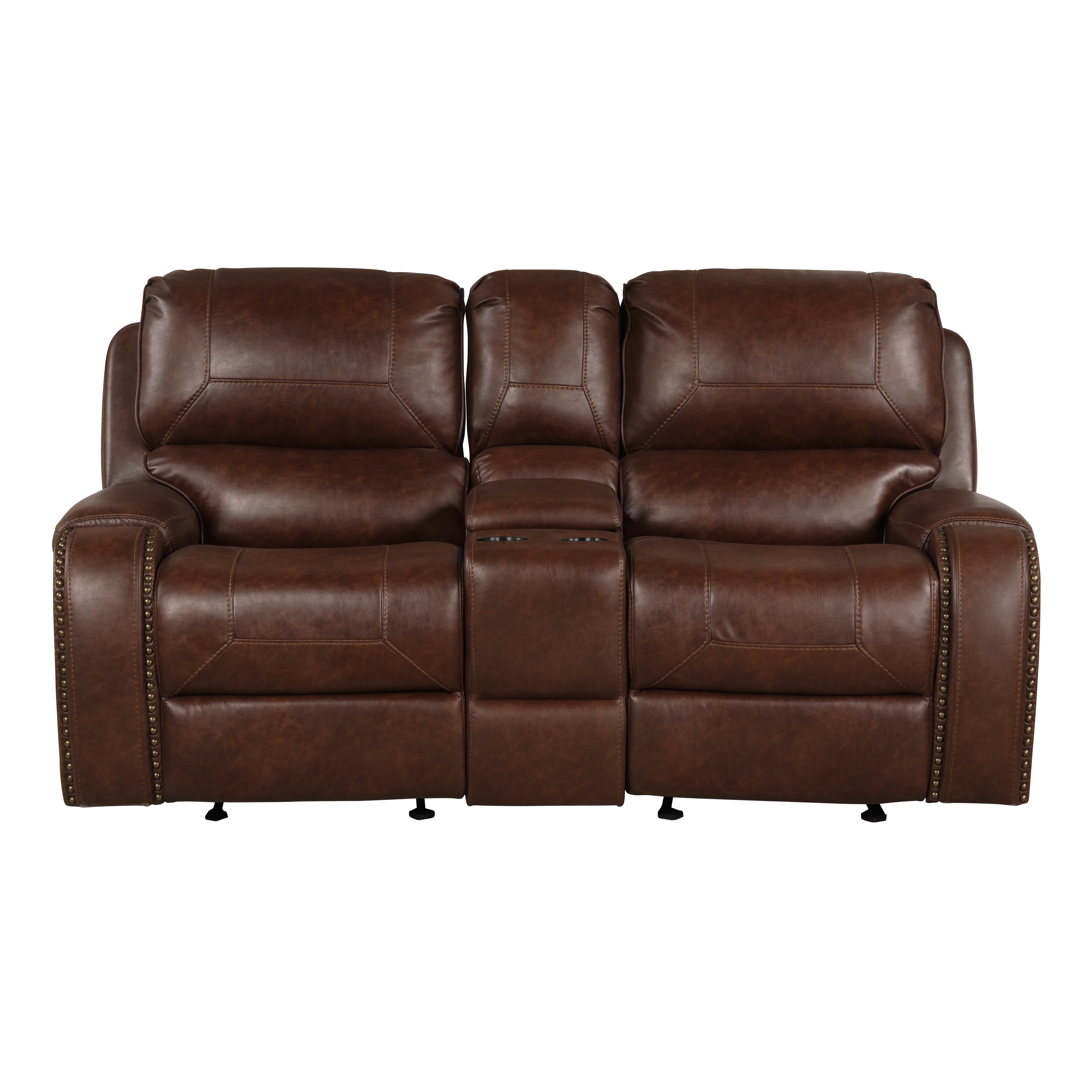 Roundhill Furniture Achern Brown Leather-Air Nailhead Manual Reclining Sofa and Loveseat with Storage Console and USB Port