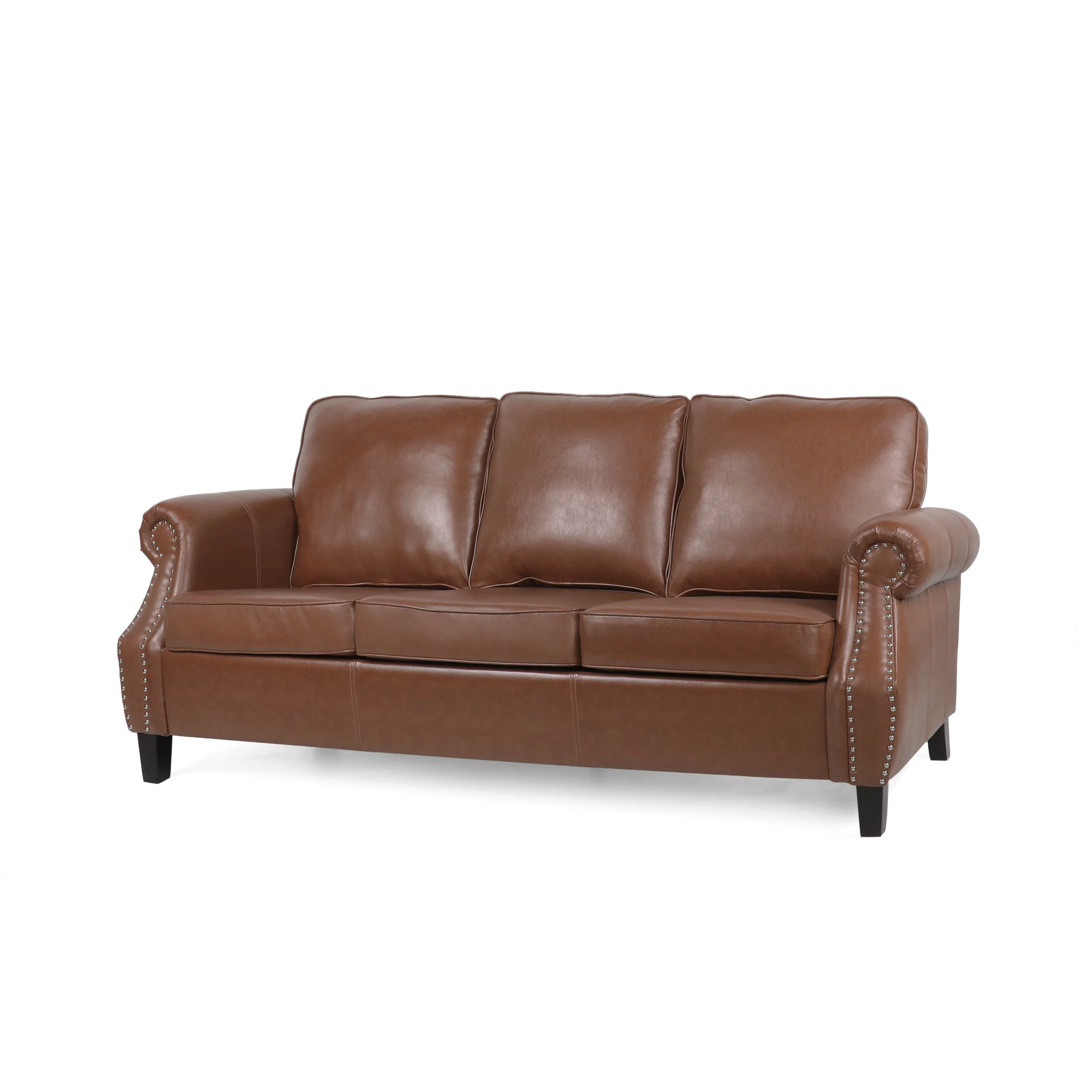 Burkehaven Contemporary Faux Leather 3 Seater Sofa with Nailhead Trim, Cognac Brown and Dark Brown