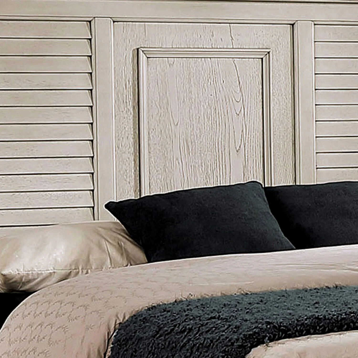 Benjara 2 Drawer Storage Shutter Headboard Eli Queen Size Platform Bed, Antique White & Nickel