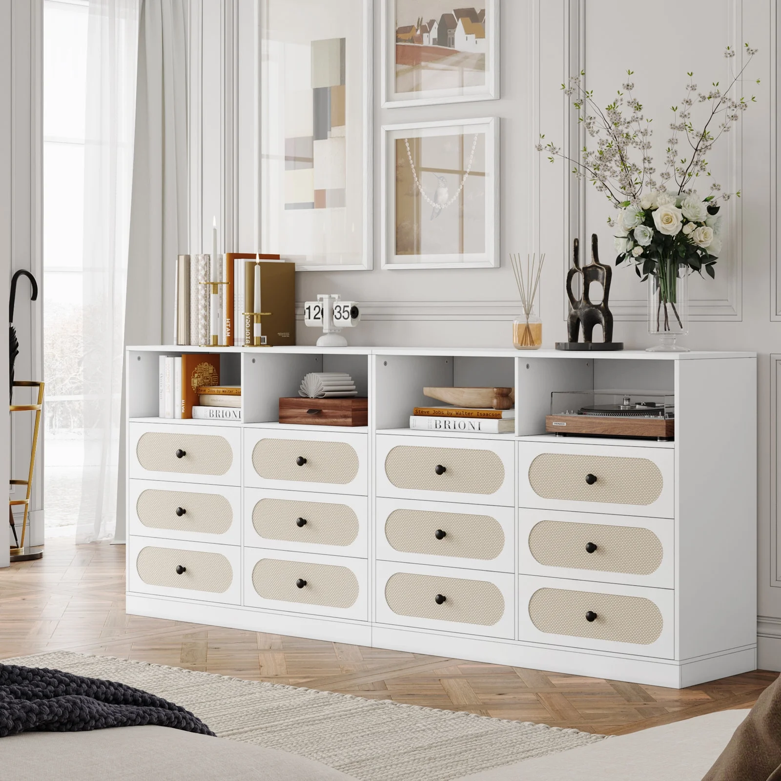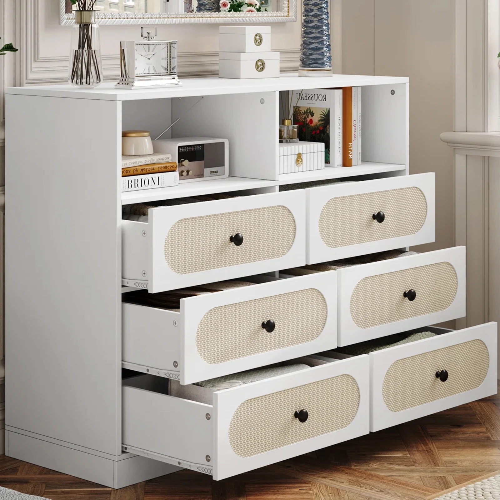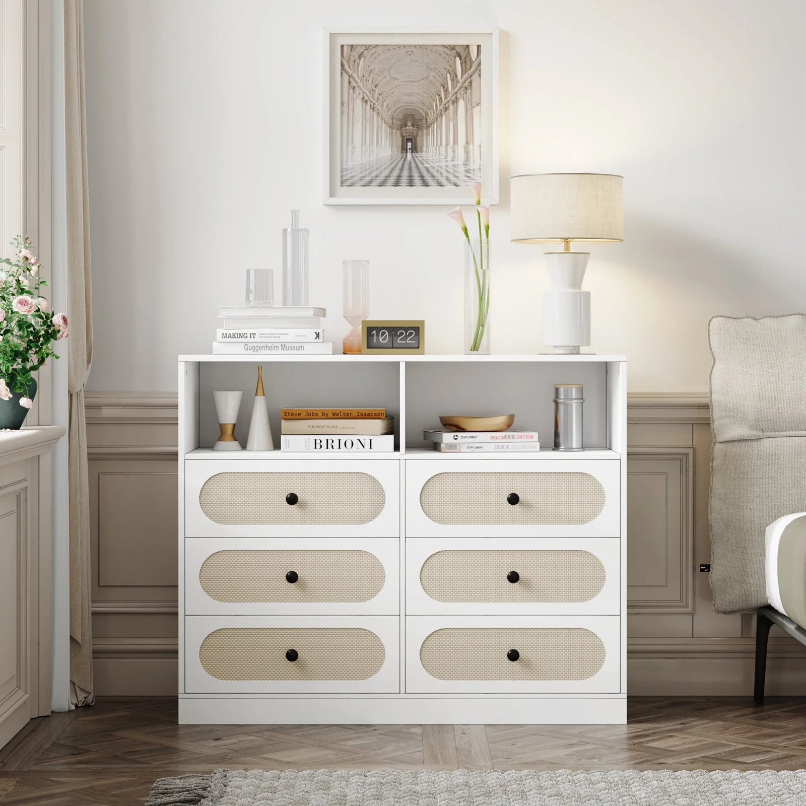 Homfa 6 Drawer Rattan Dresser with Shelves, Modern Wicker Chest Storage Cabinet for Bedroom Living Room, White