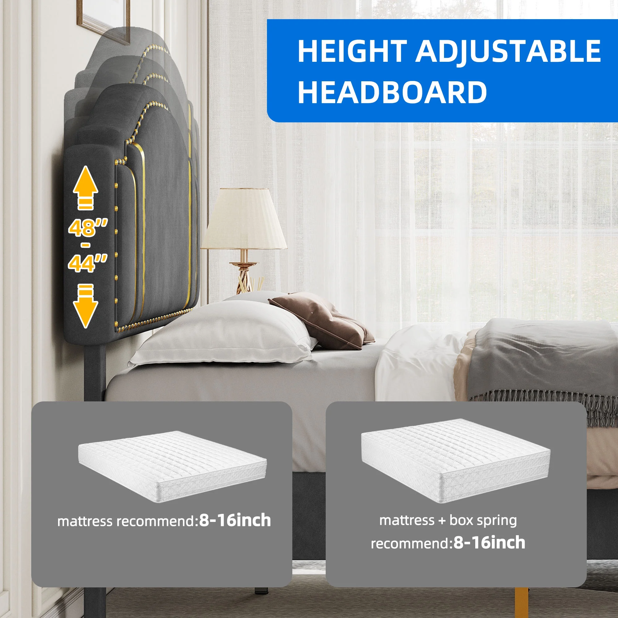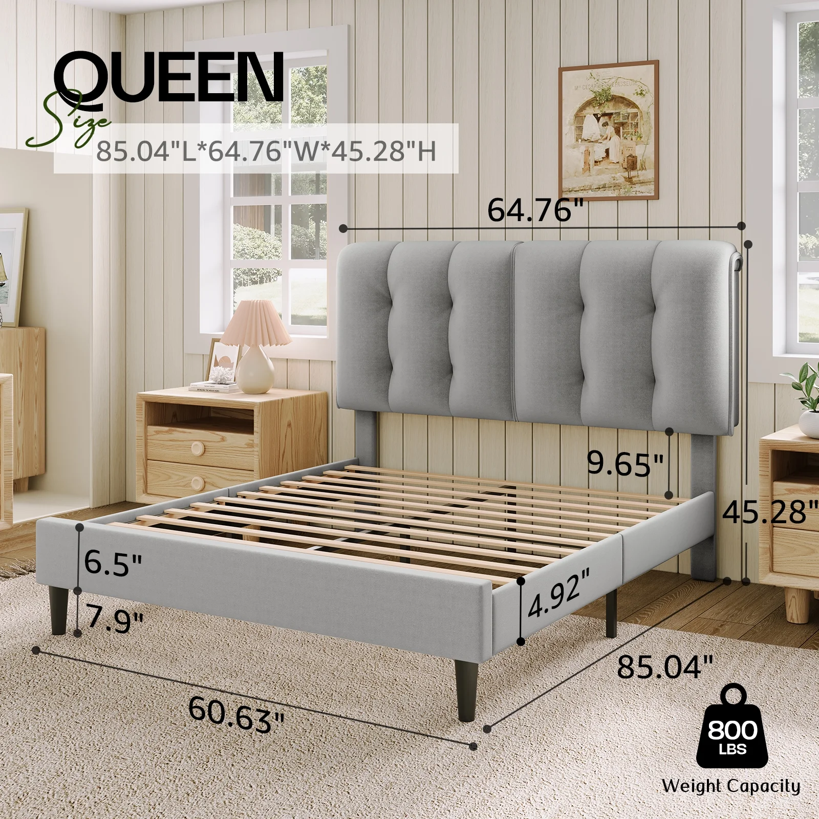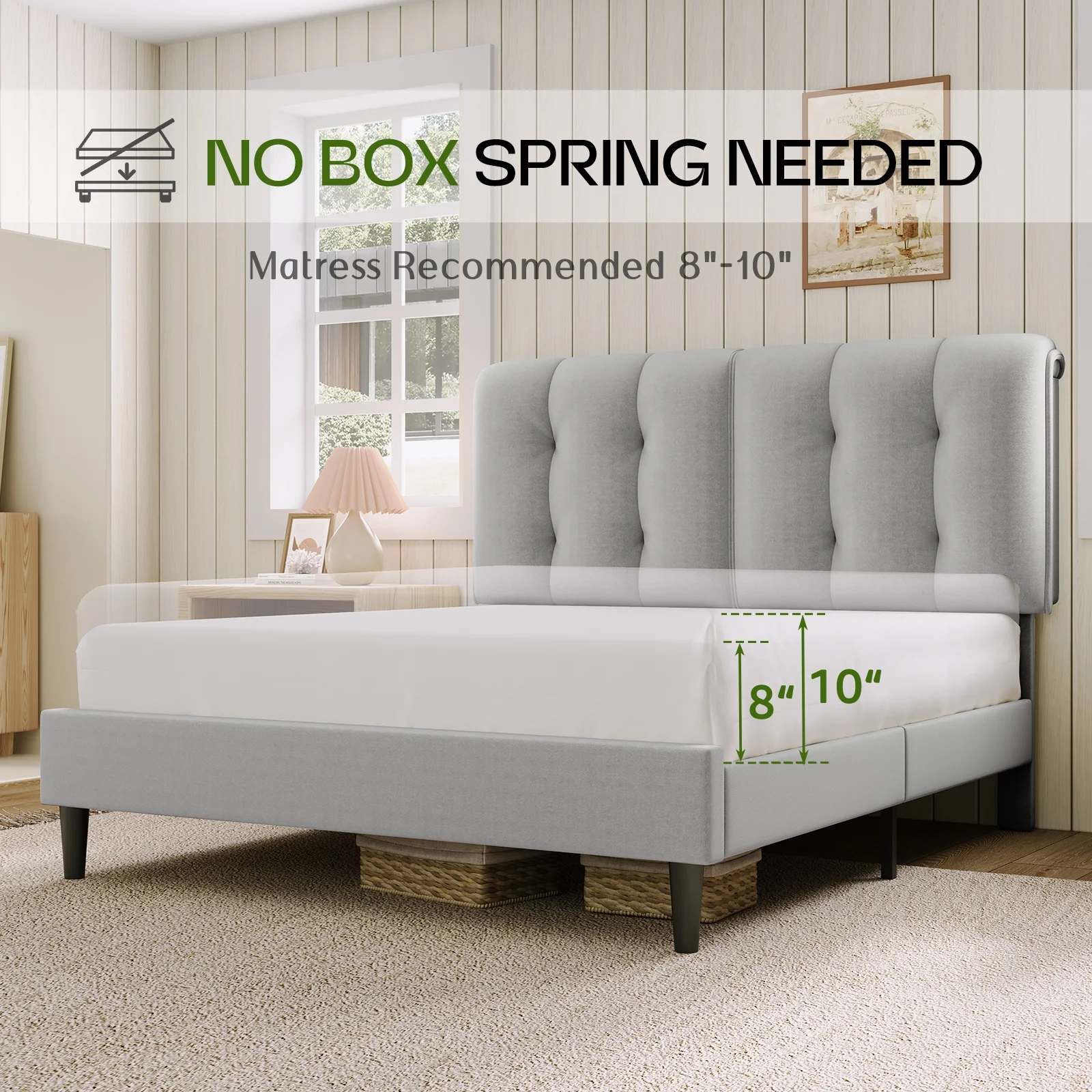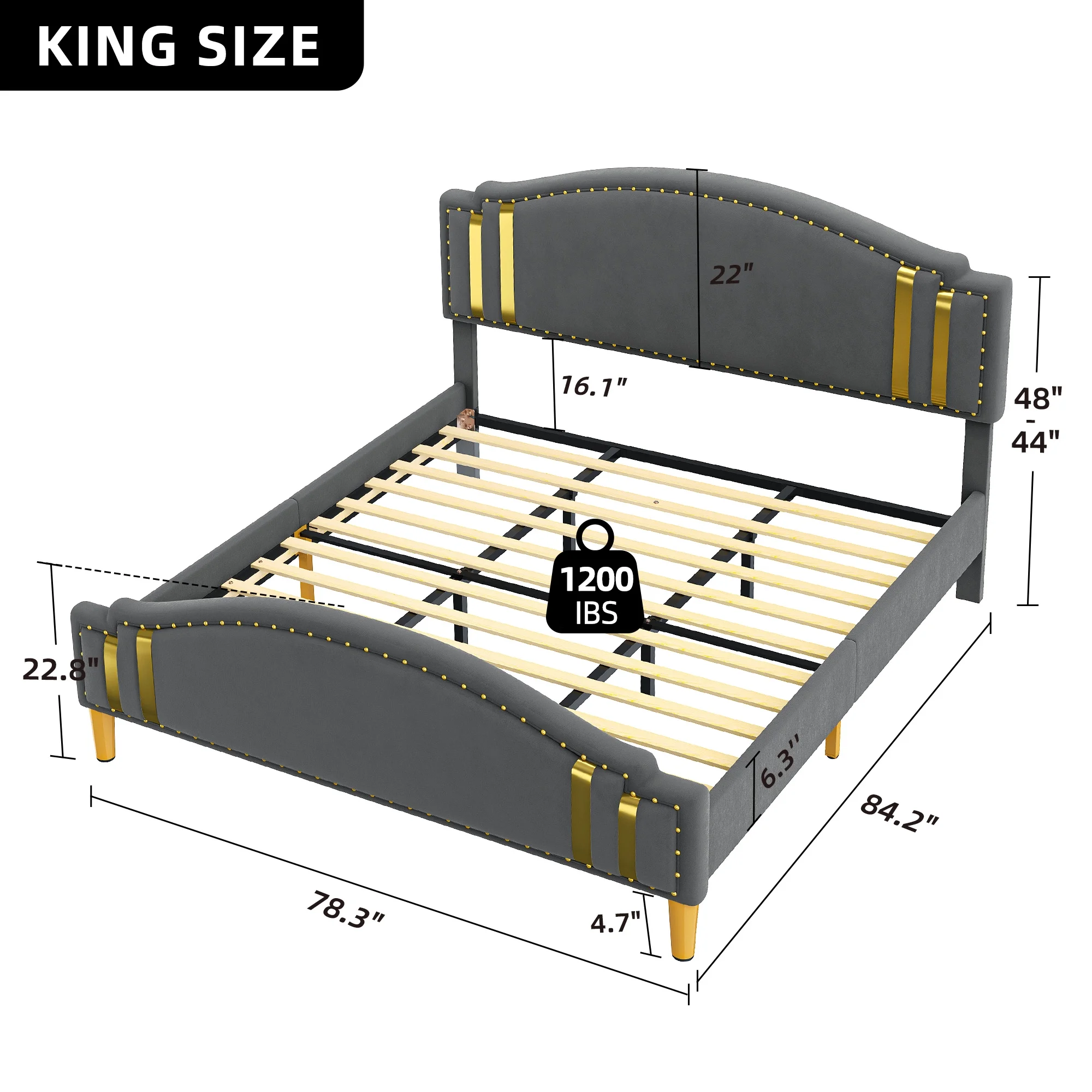 Dextrus Upholstered Wingback Bed Frame, King Platform Bed with Wood Slat, No Box Spring Needed, Gray