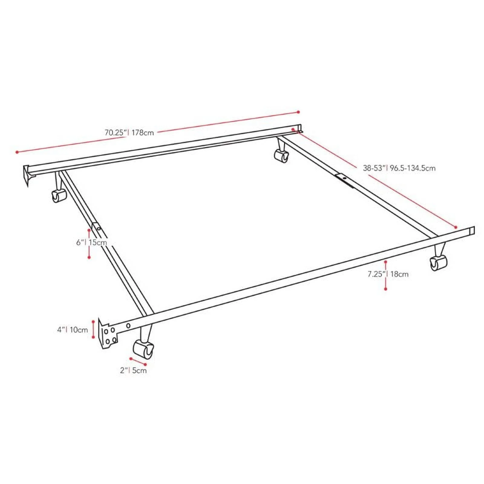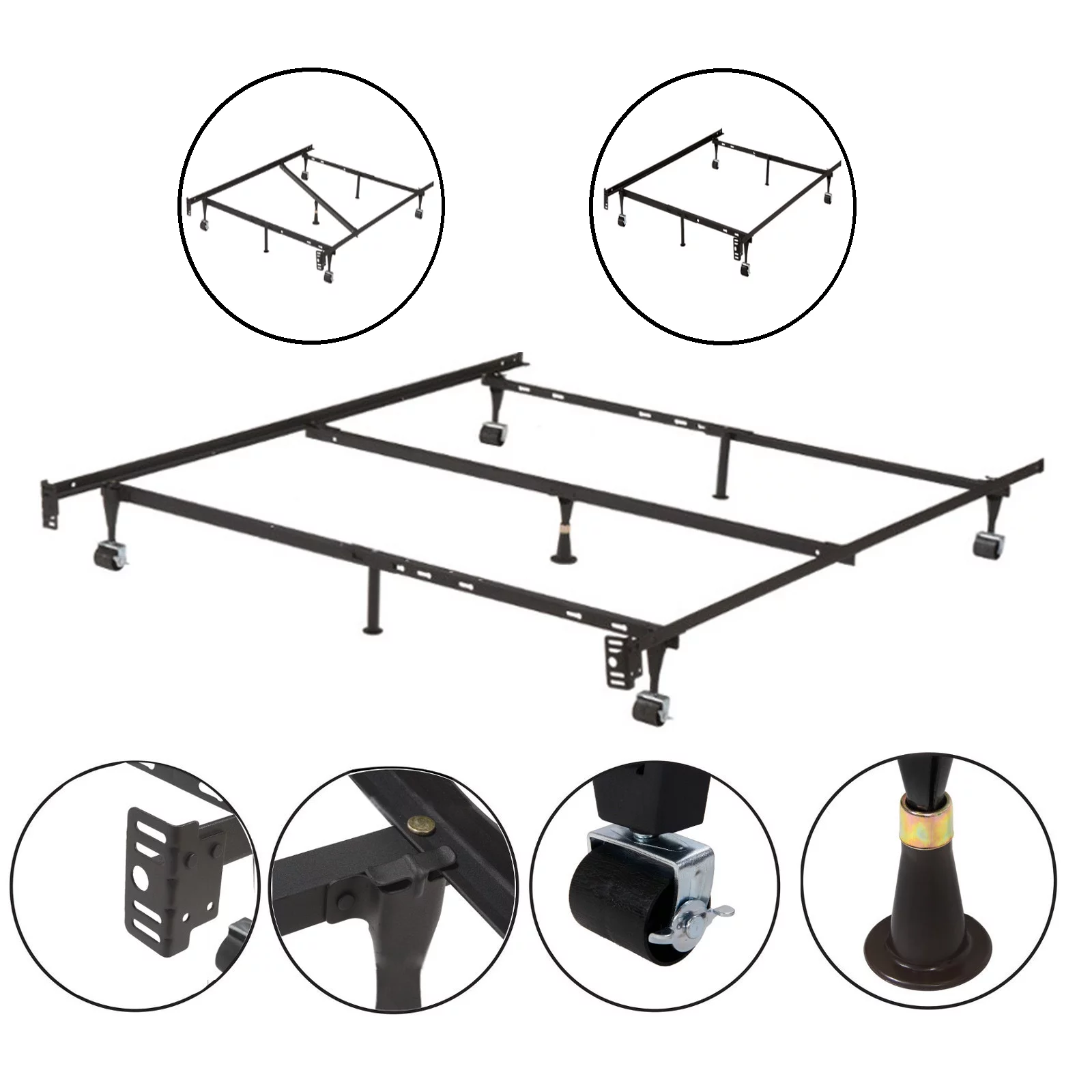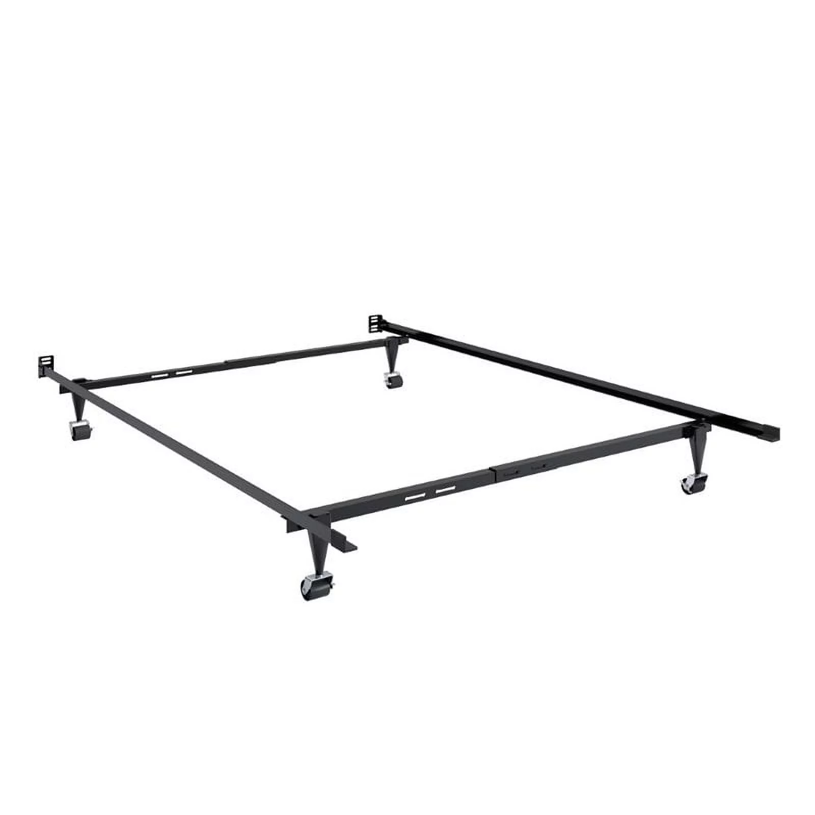 Nico Adjustable Metal Bed Frame with Center Support Rail, Support Legs & Casters