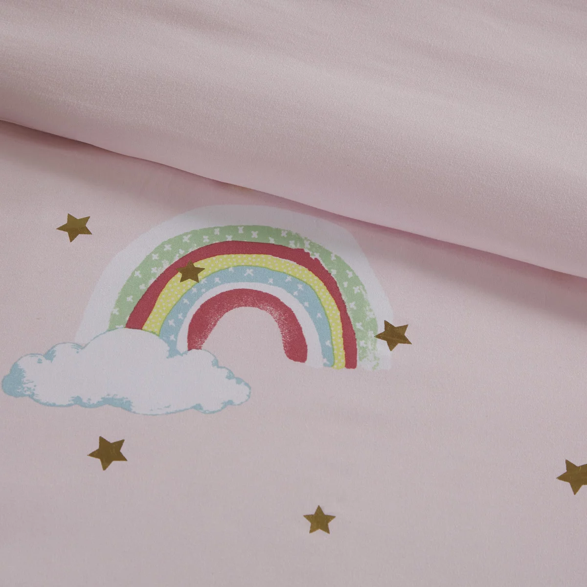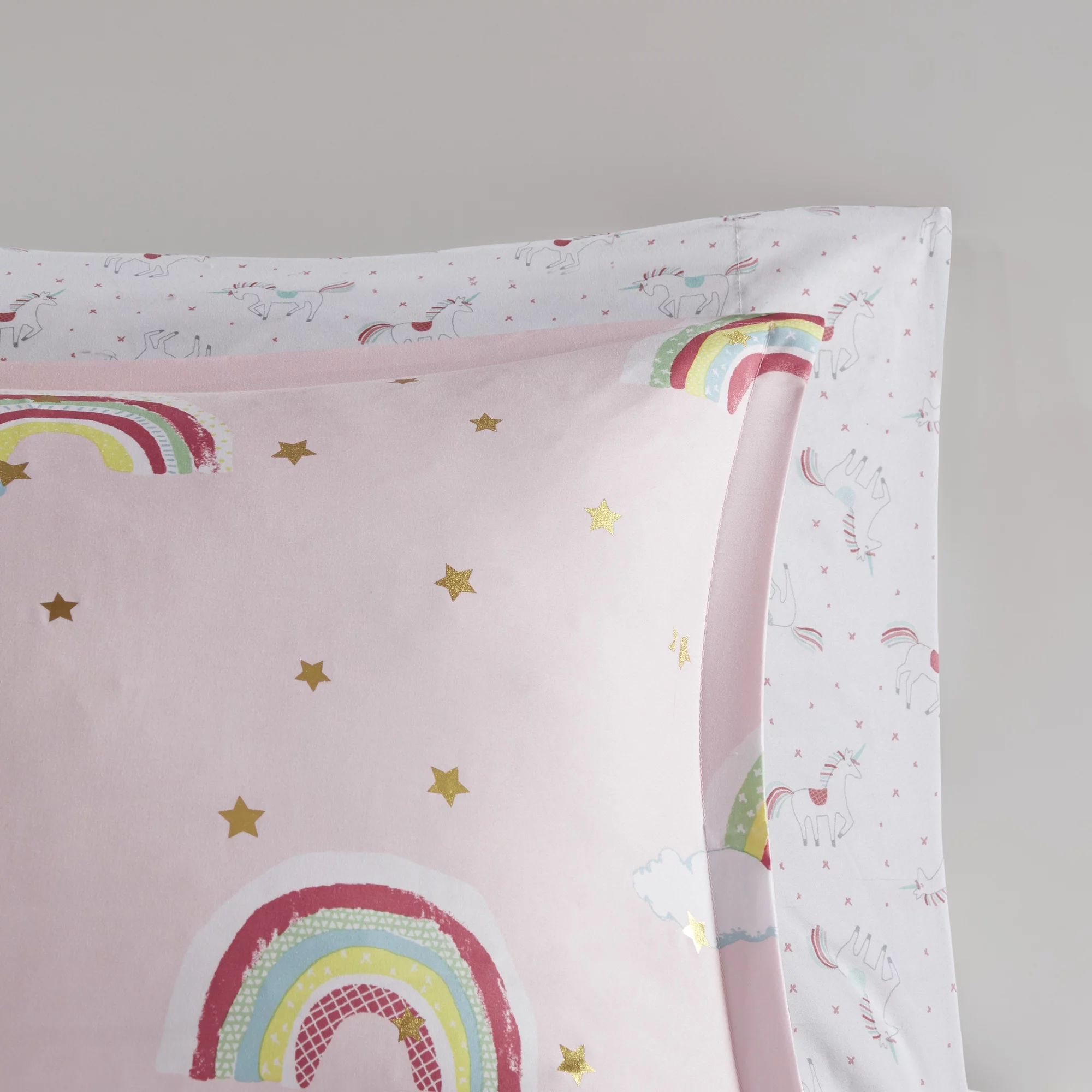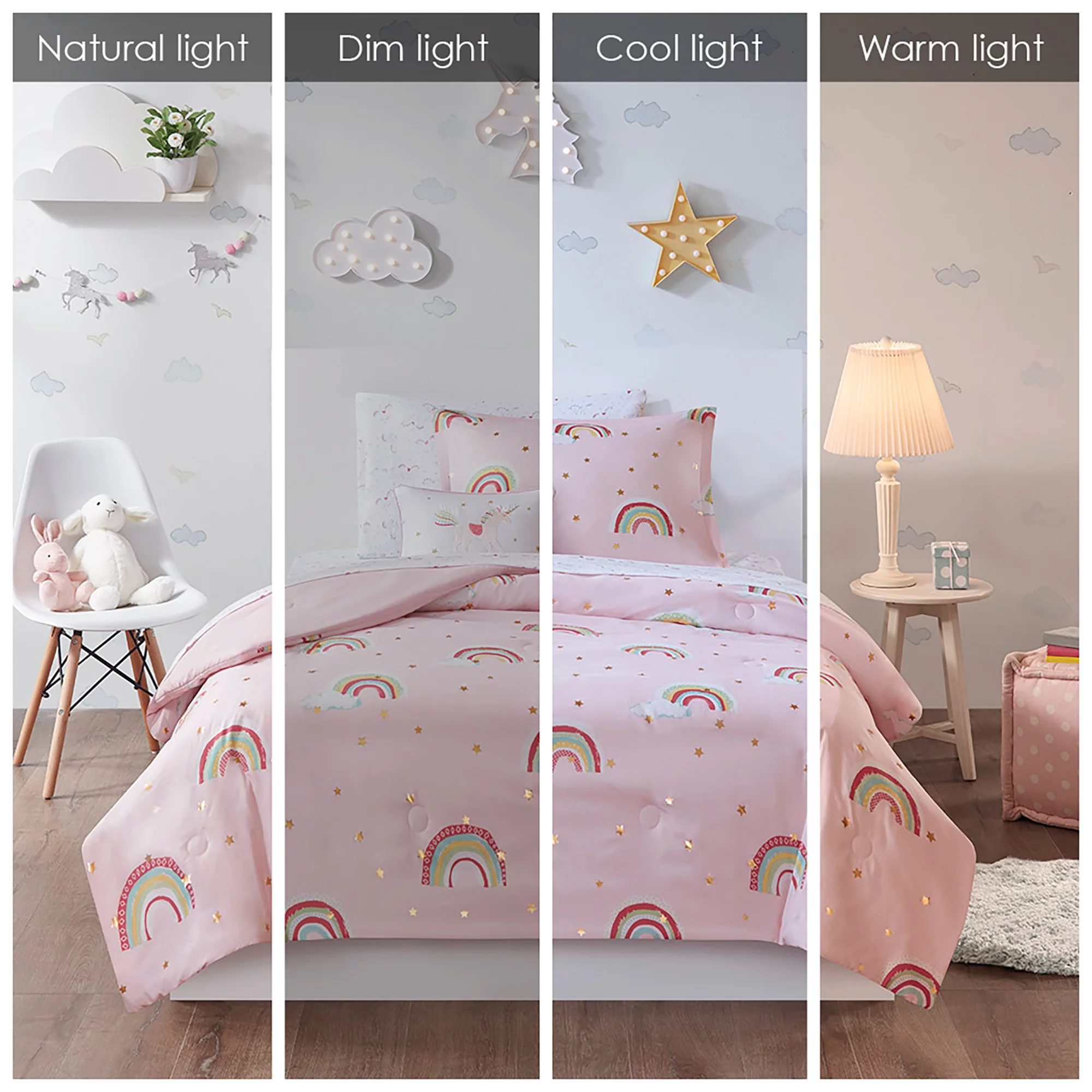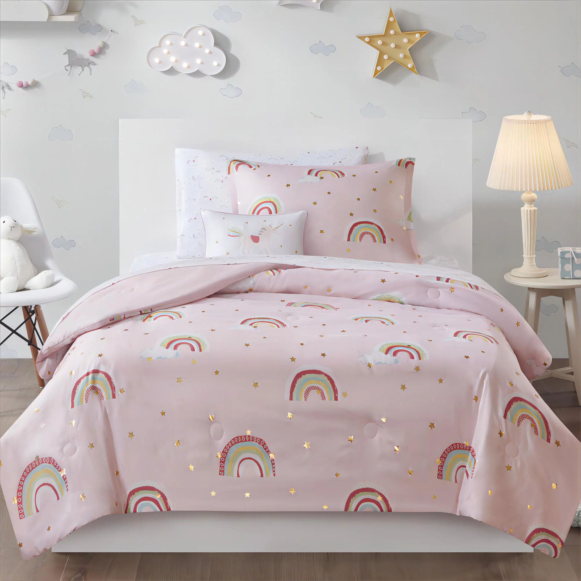 Mi Zone Kids Twin Comforter Set with Bed Sheets 6-Piece Rainbow and Metallic Stars Bed in a Bag Pink