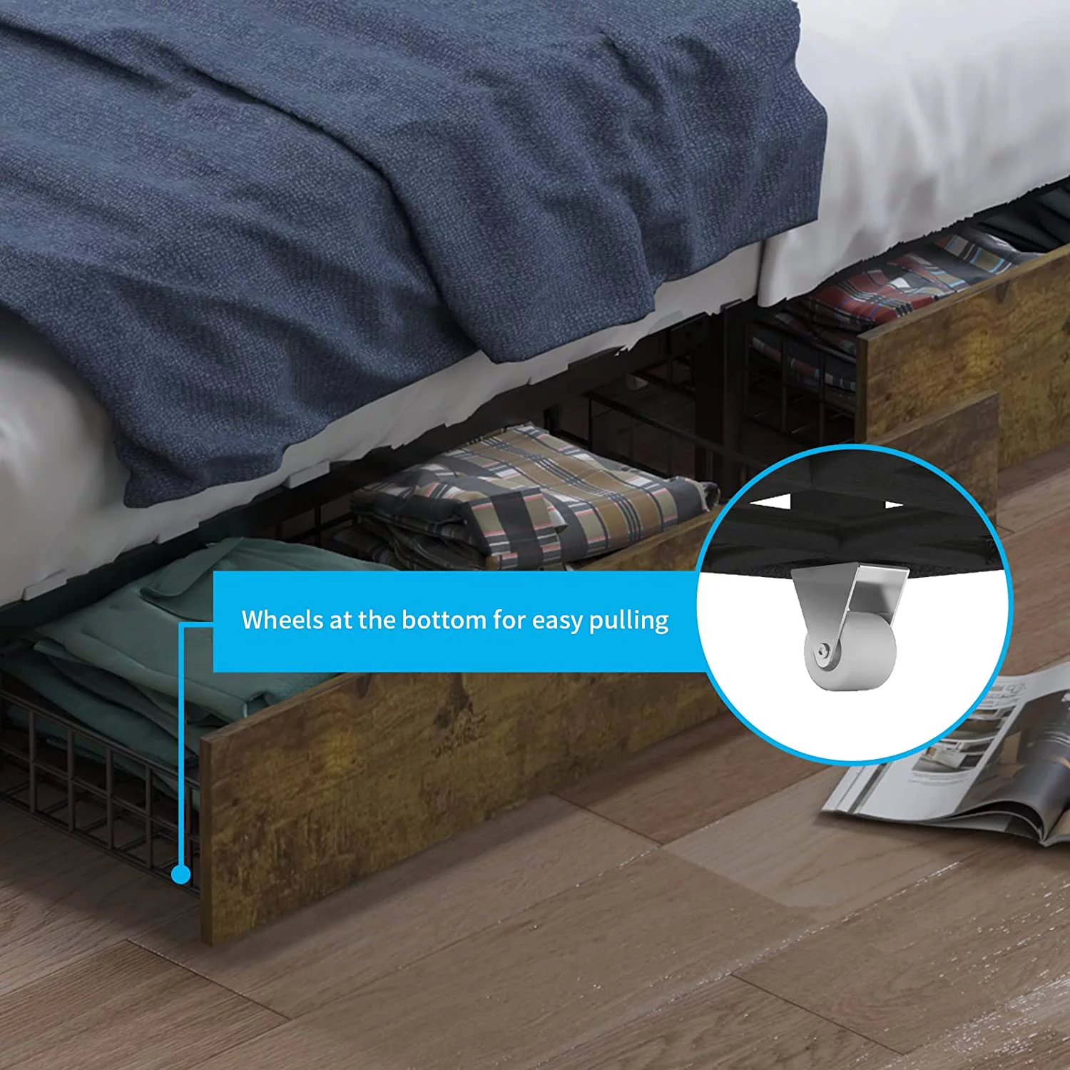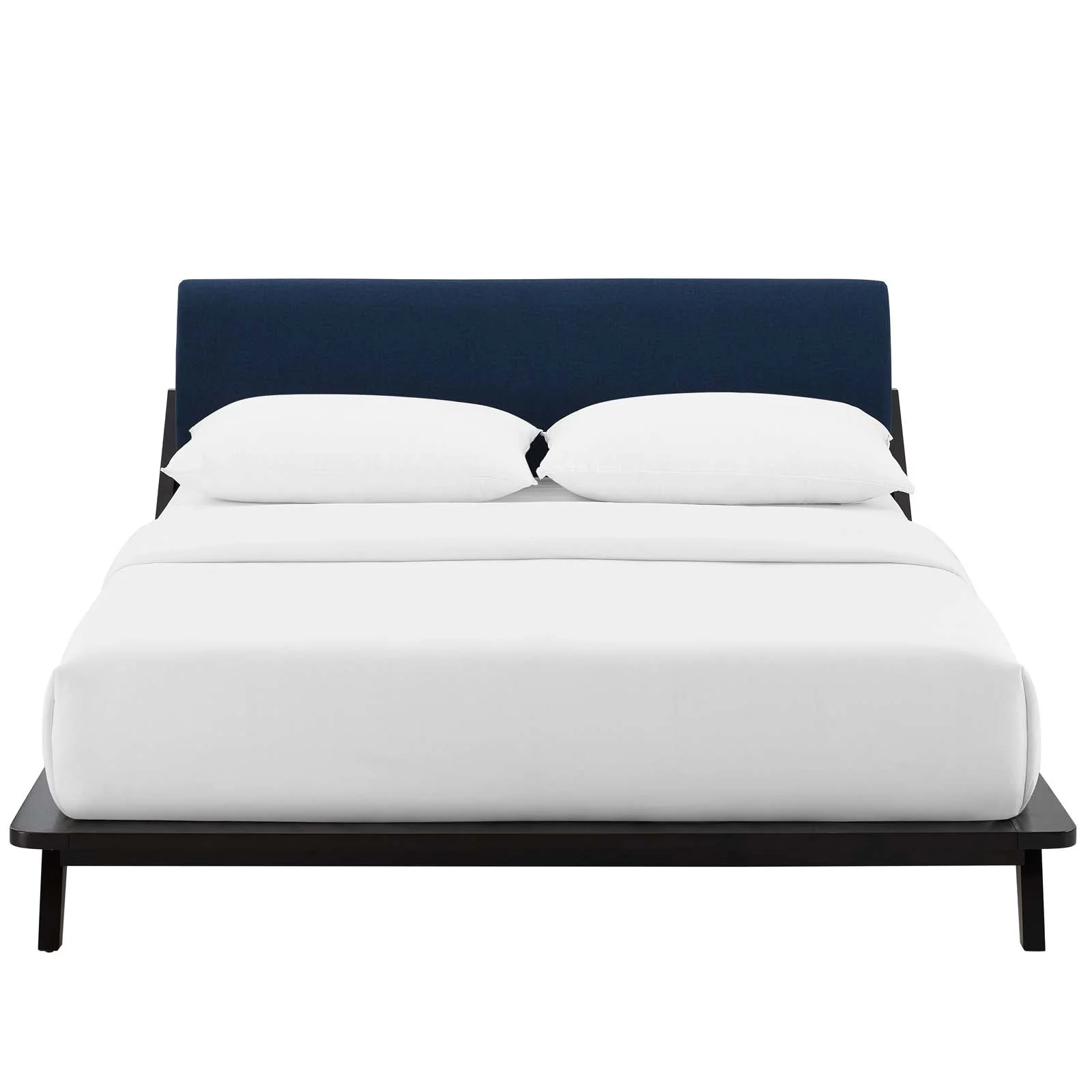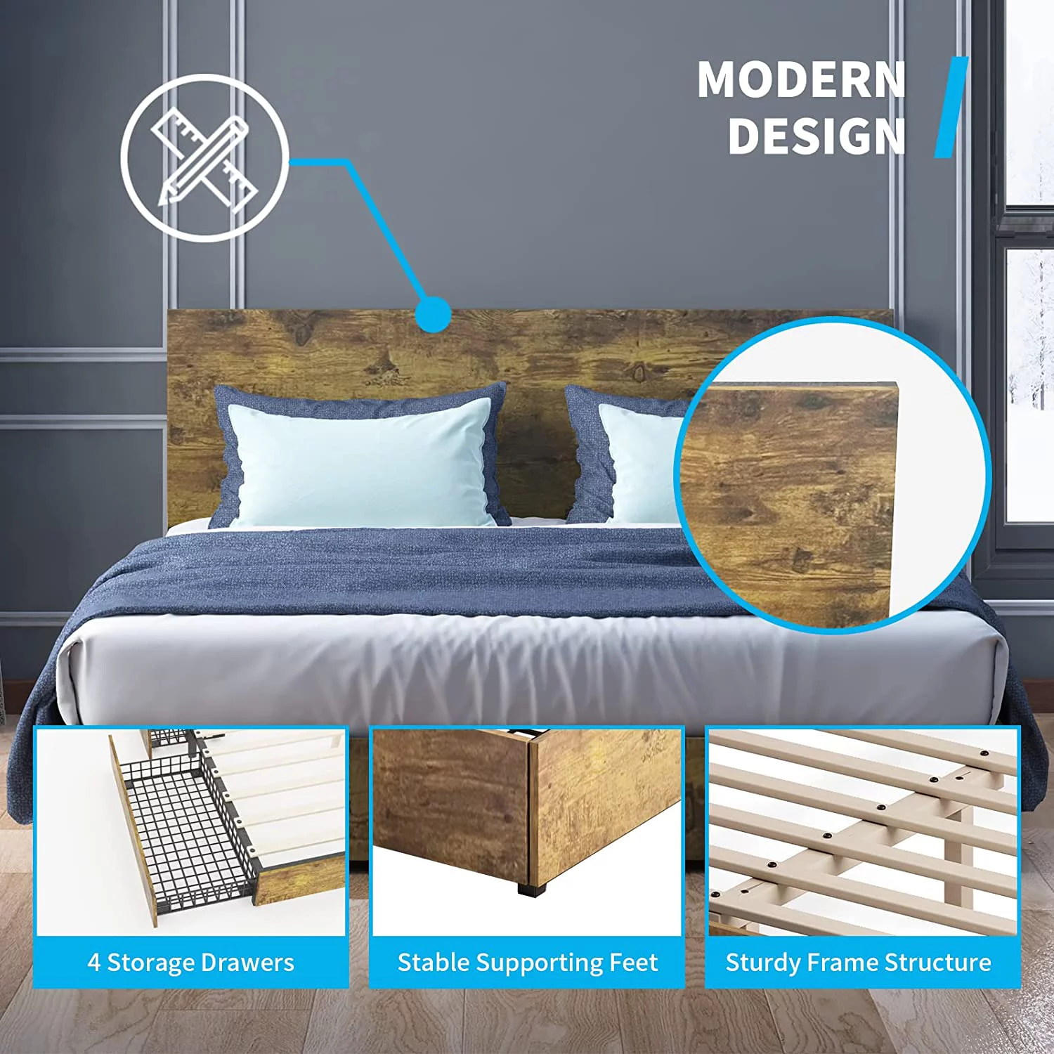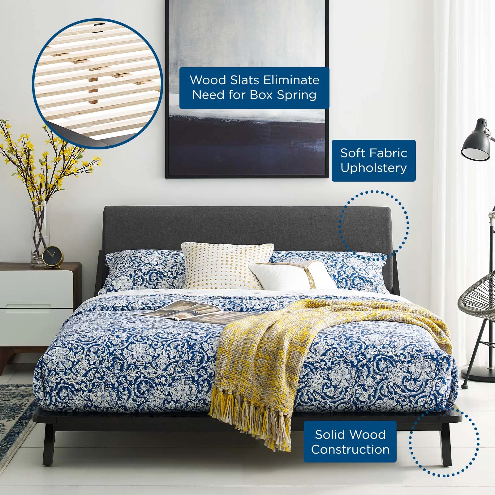 Modern Contemporary Urban Design Bedroom Queen Size Platform Bed Frame, Wood Fabric, Blue Brown Natural