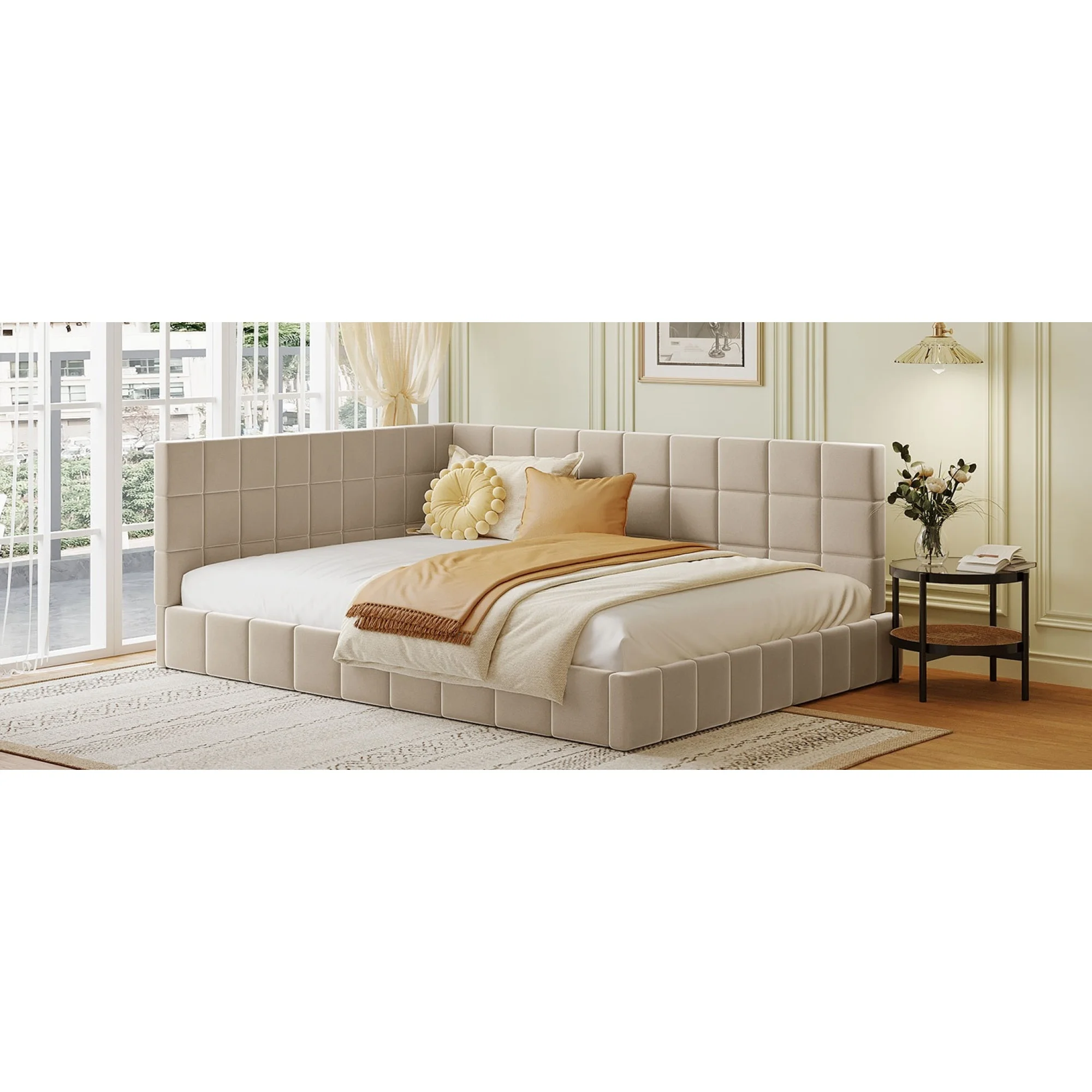 "Full-Size Beige Velvet Upholstered Daybed/Sofa Bed Frame: Elegant & Versatile Design"