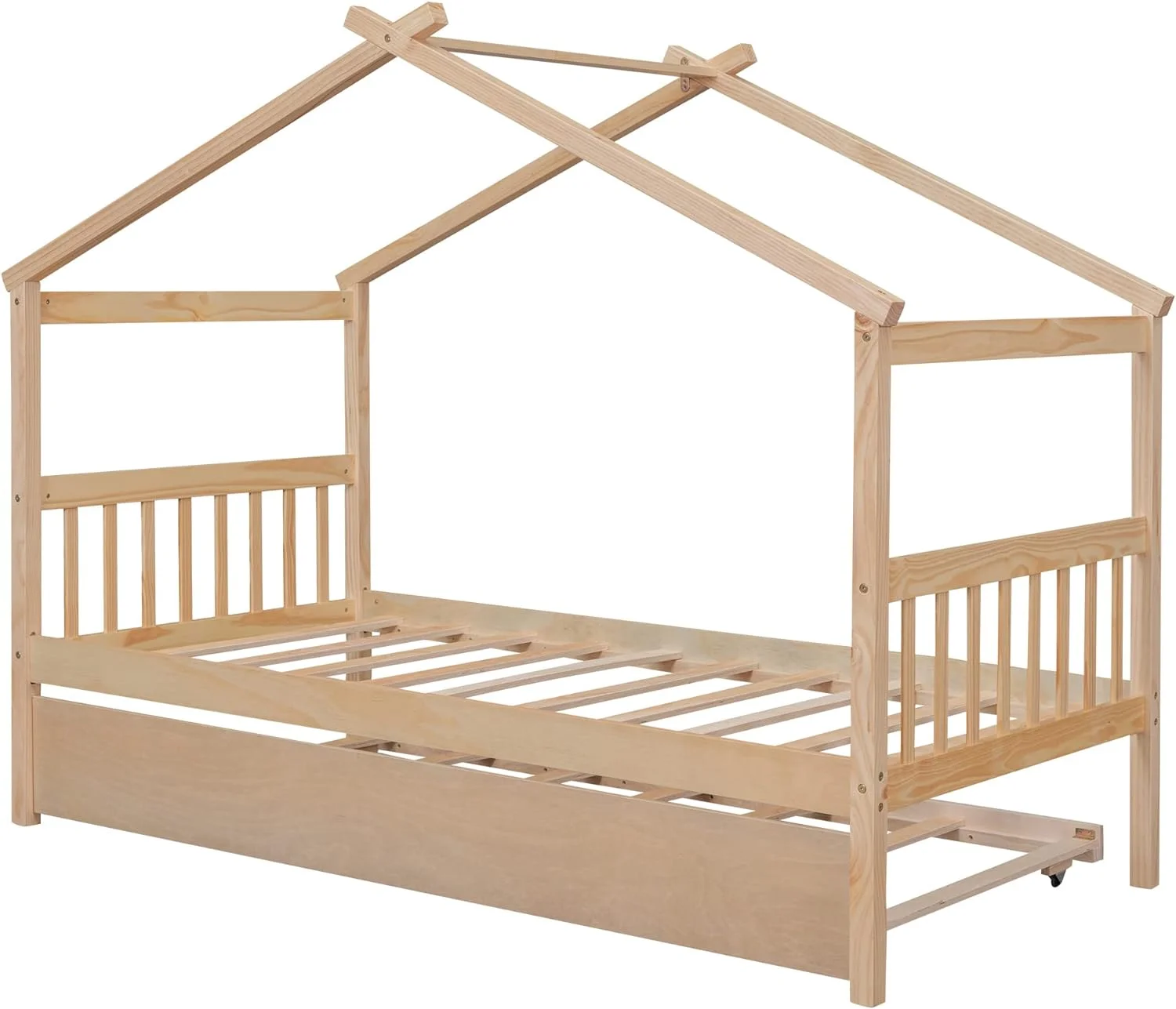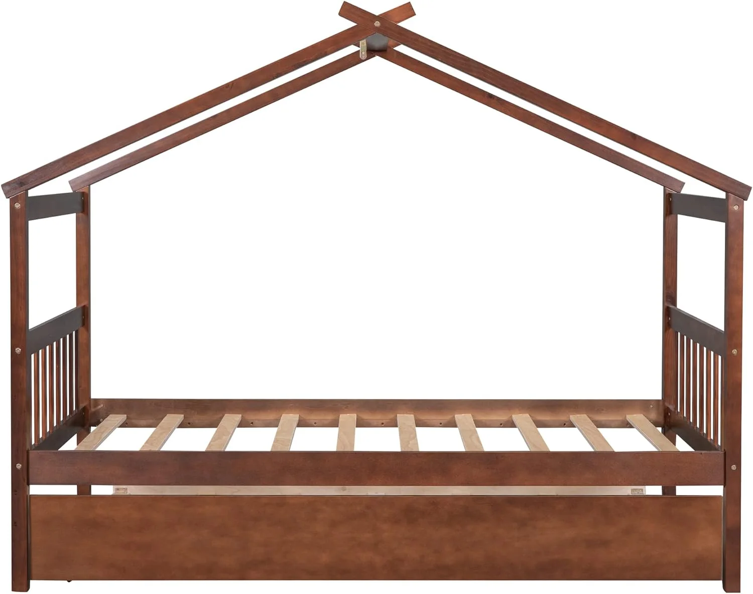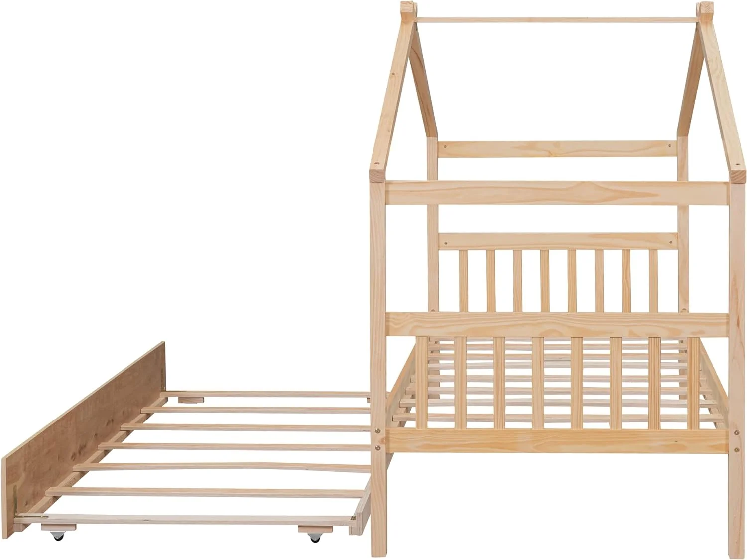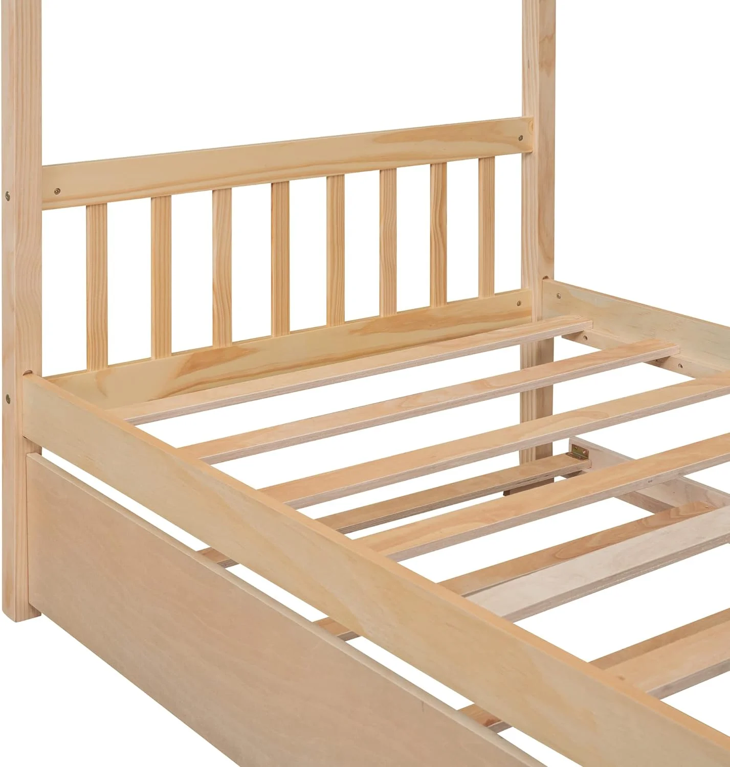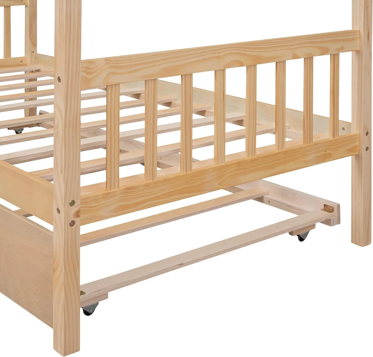 House Bed Frame With Trundle Solid Wood Bed With Roof For Boys And Girls