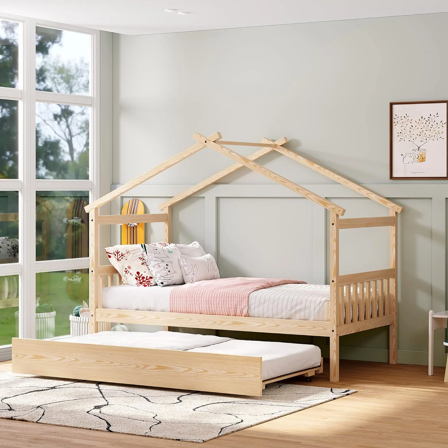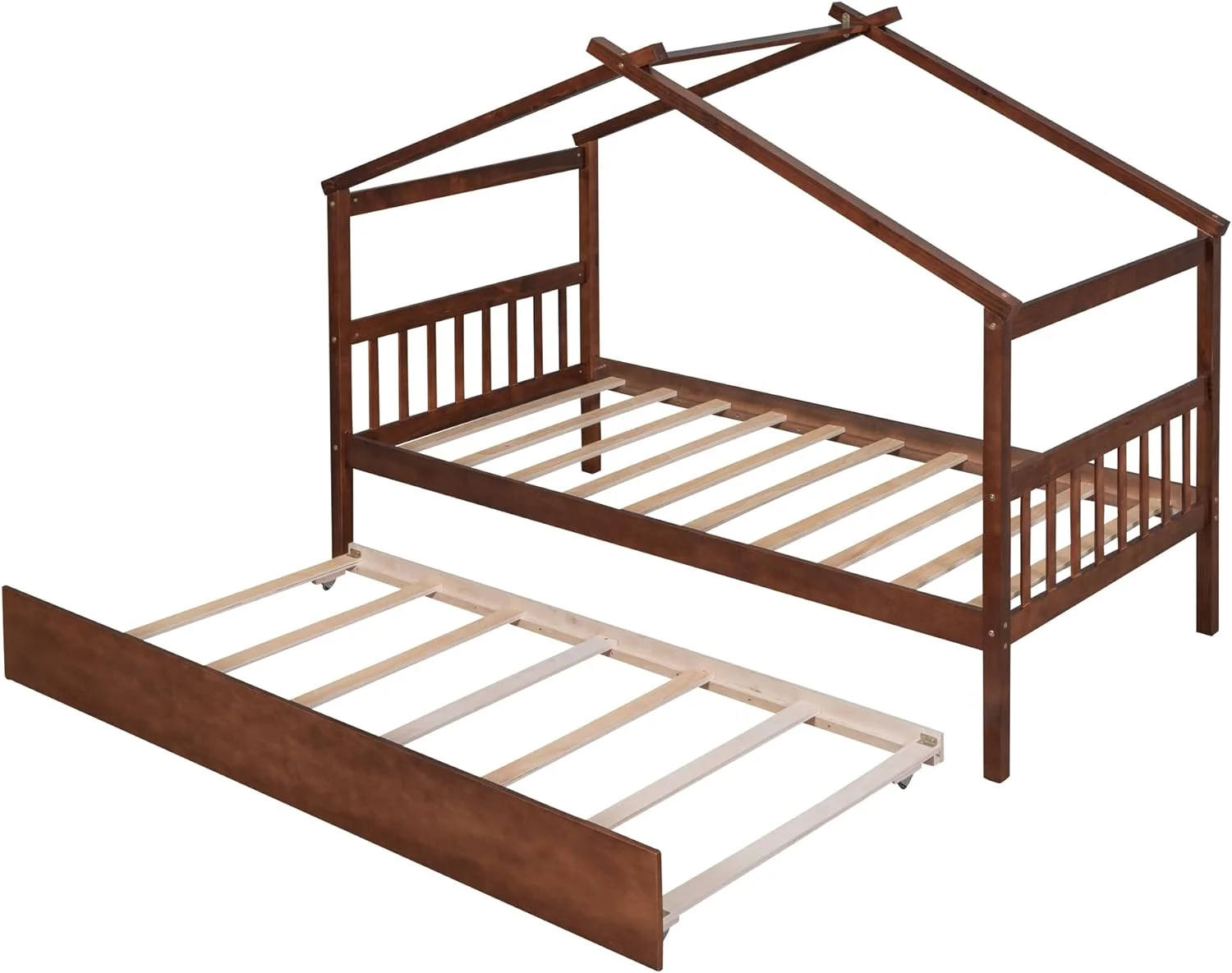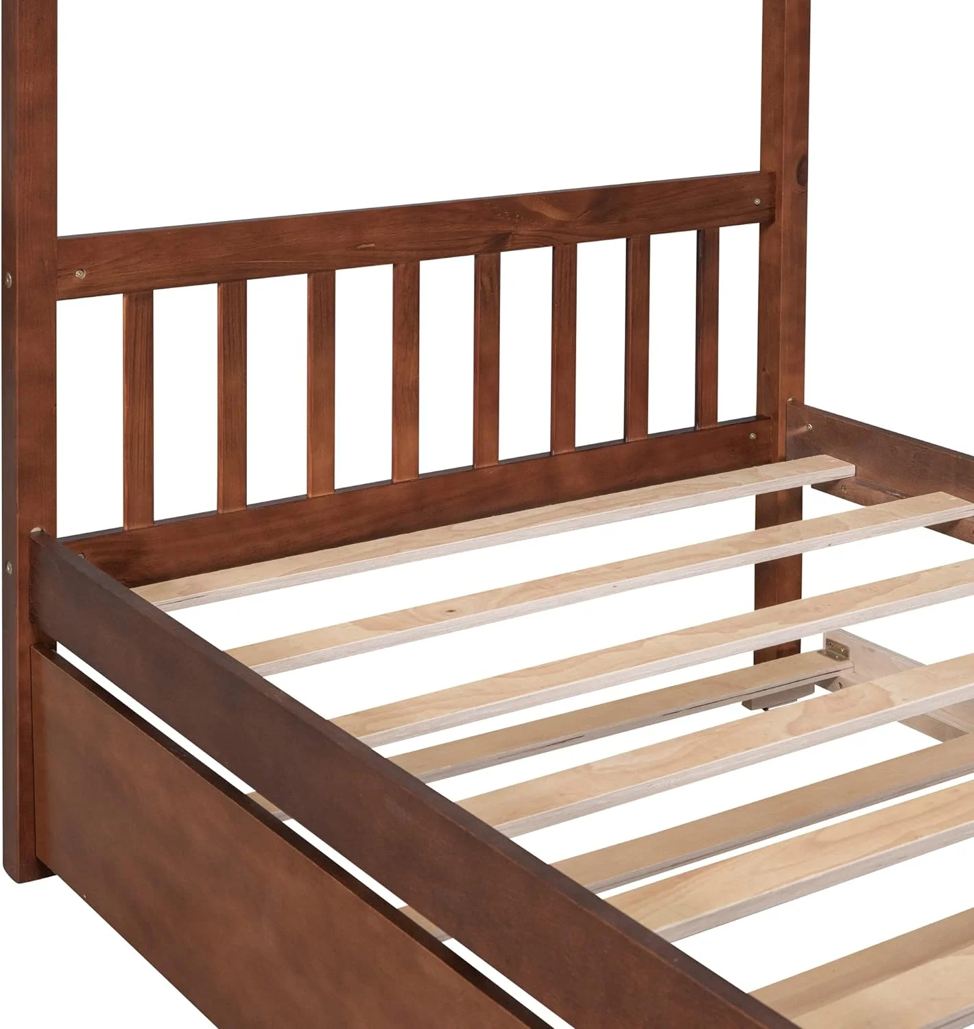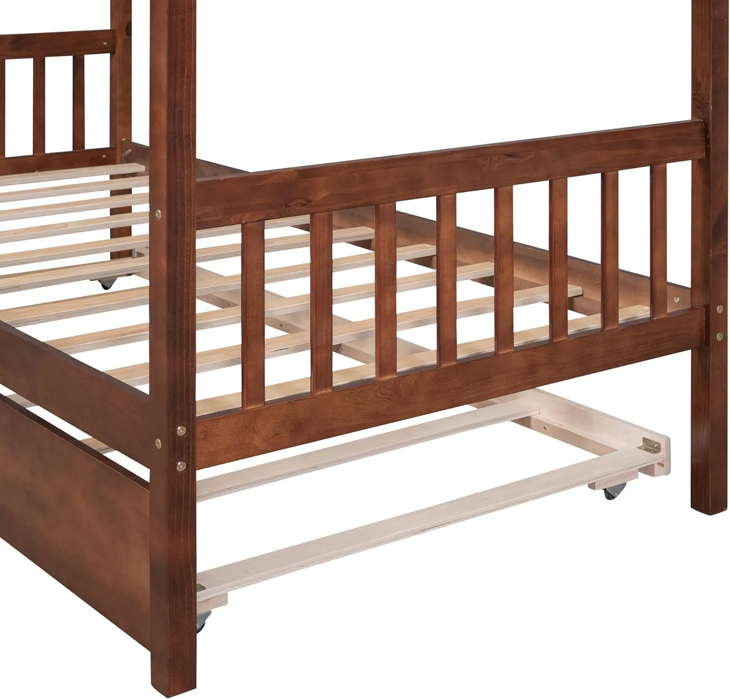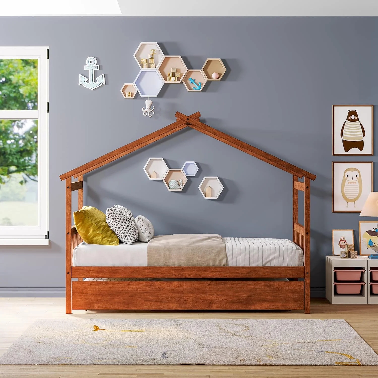 House Bed Frame With Trundle Solid Wood Bed With Roof For Boys And Girls