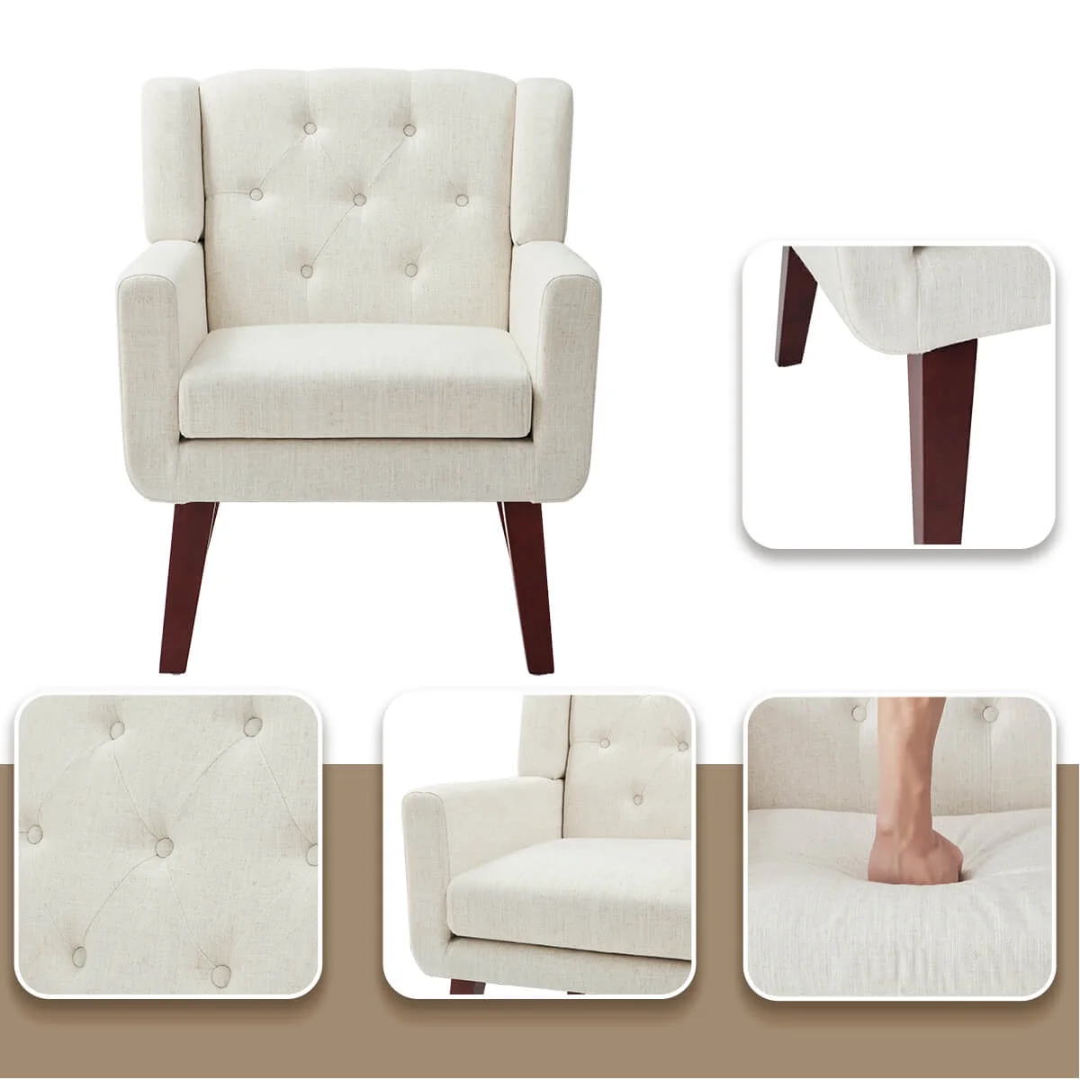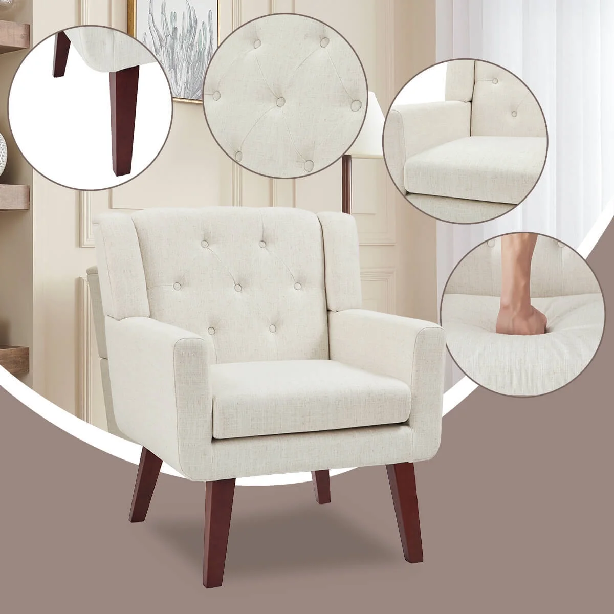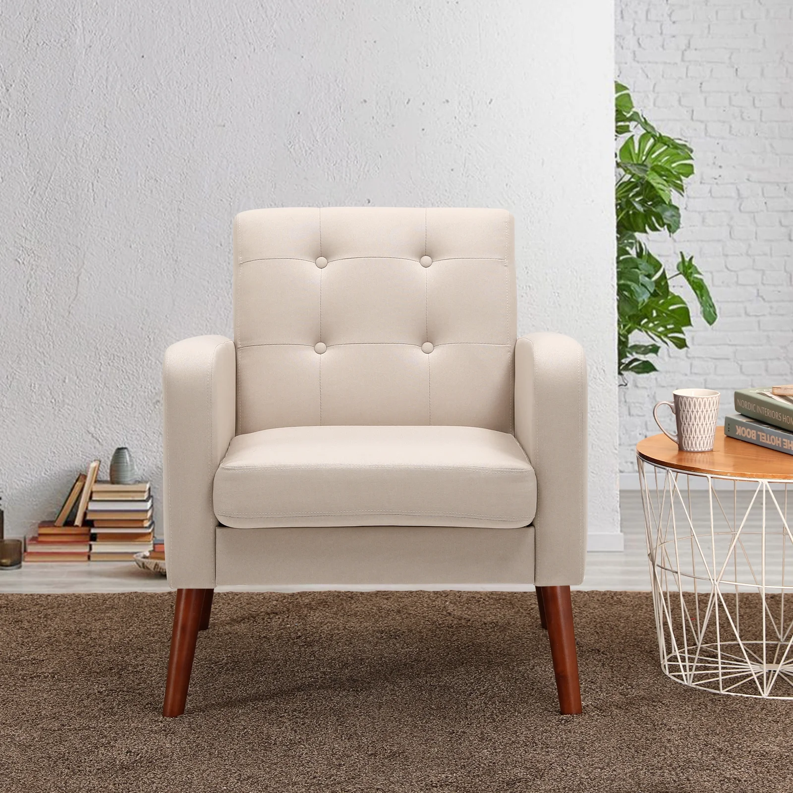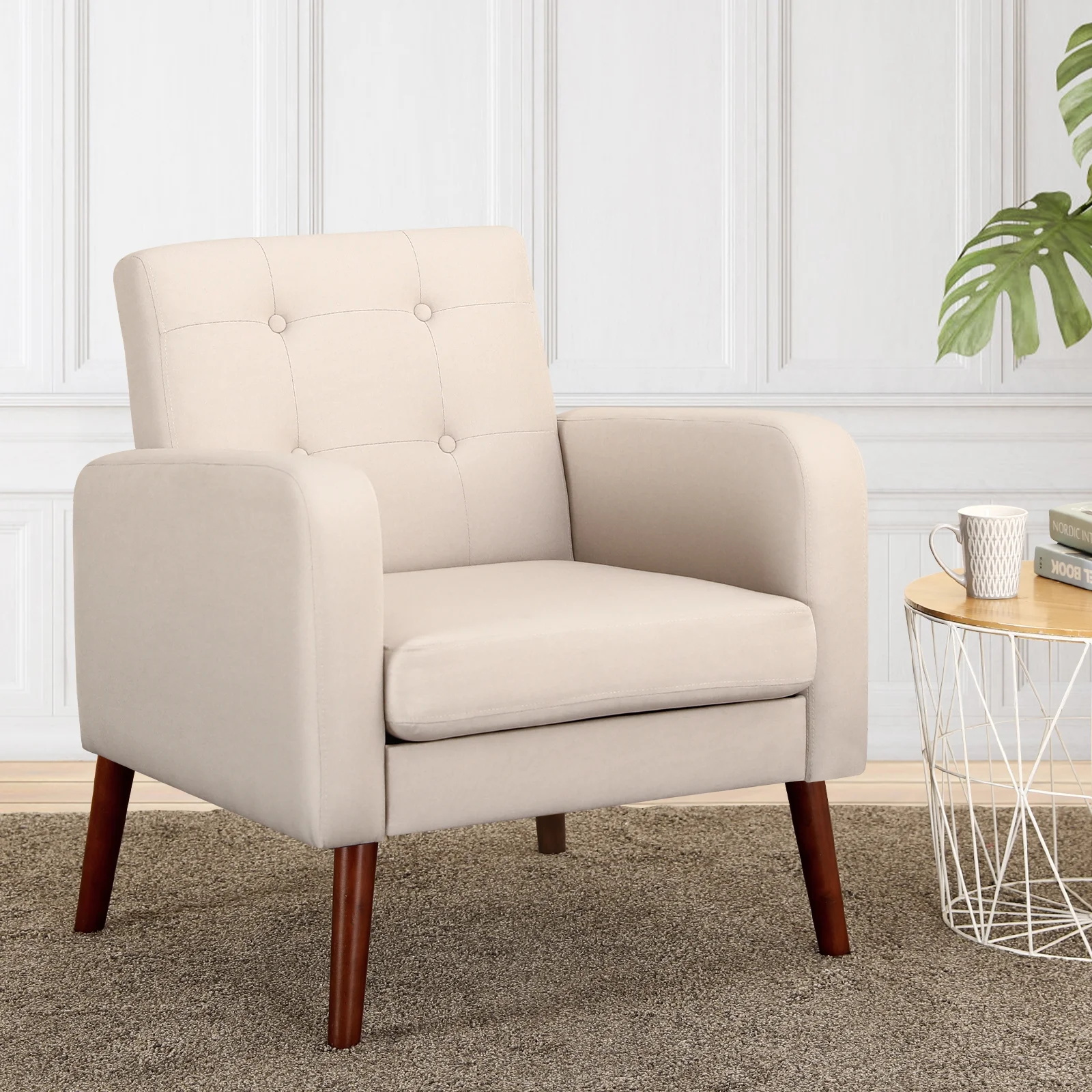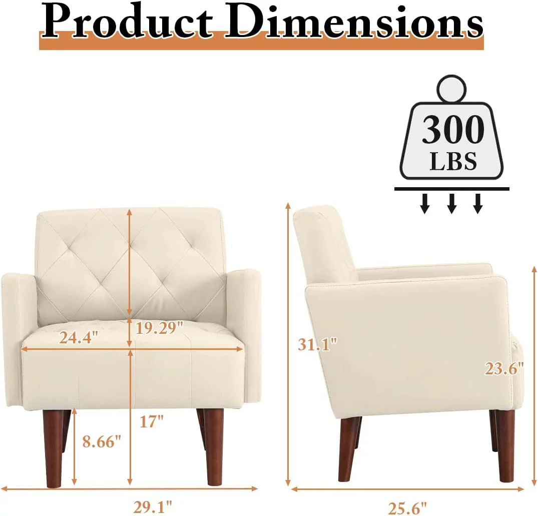 HUIMO Accent Chair, Upholstered Button Tufted Armchair, Mid-Century Modern Reading Comfy Arm Chair(Beige)