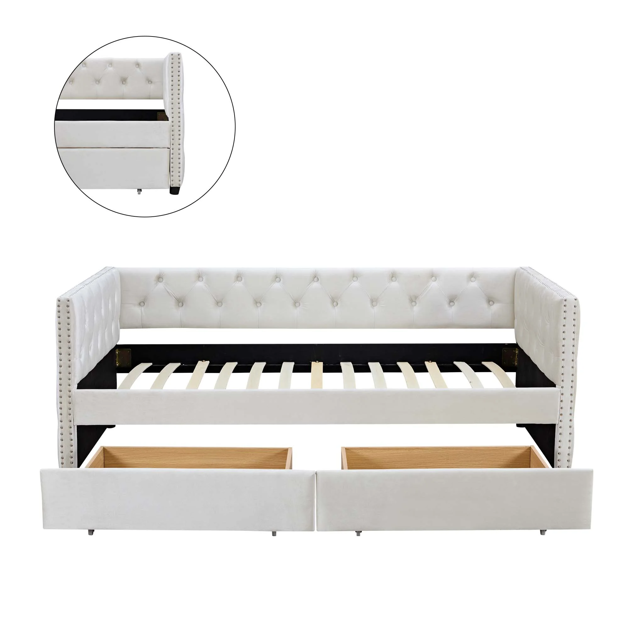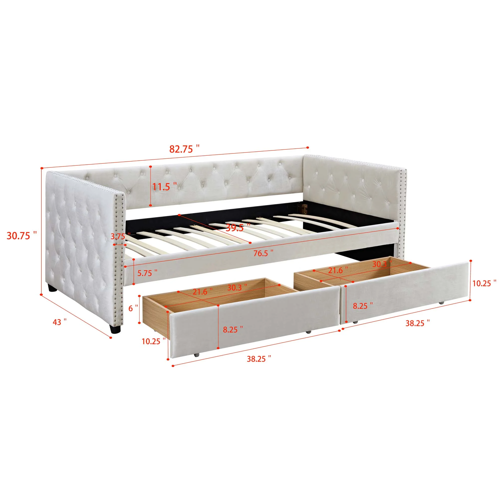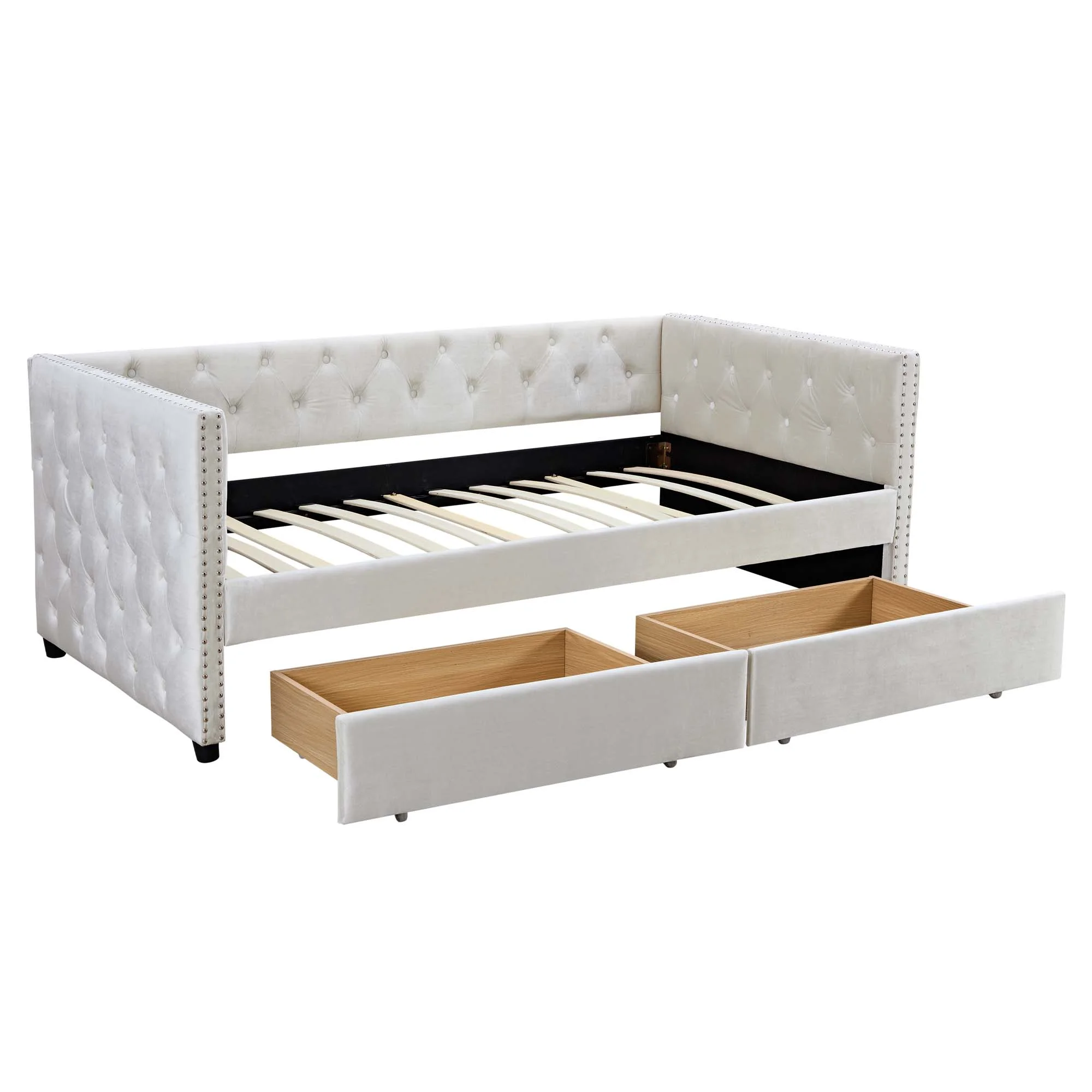 Aukfa Upholstered Twin Daybed with Storage Drawers, Bed Frame with Button Tufted and Nailhead Trim - Beige