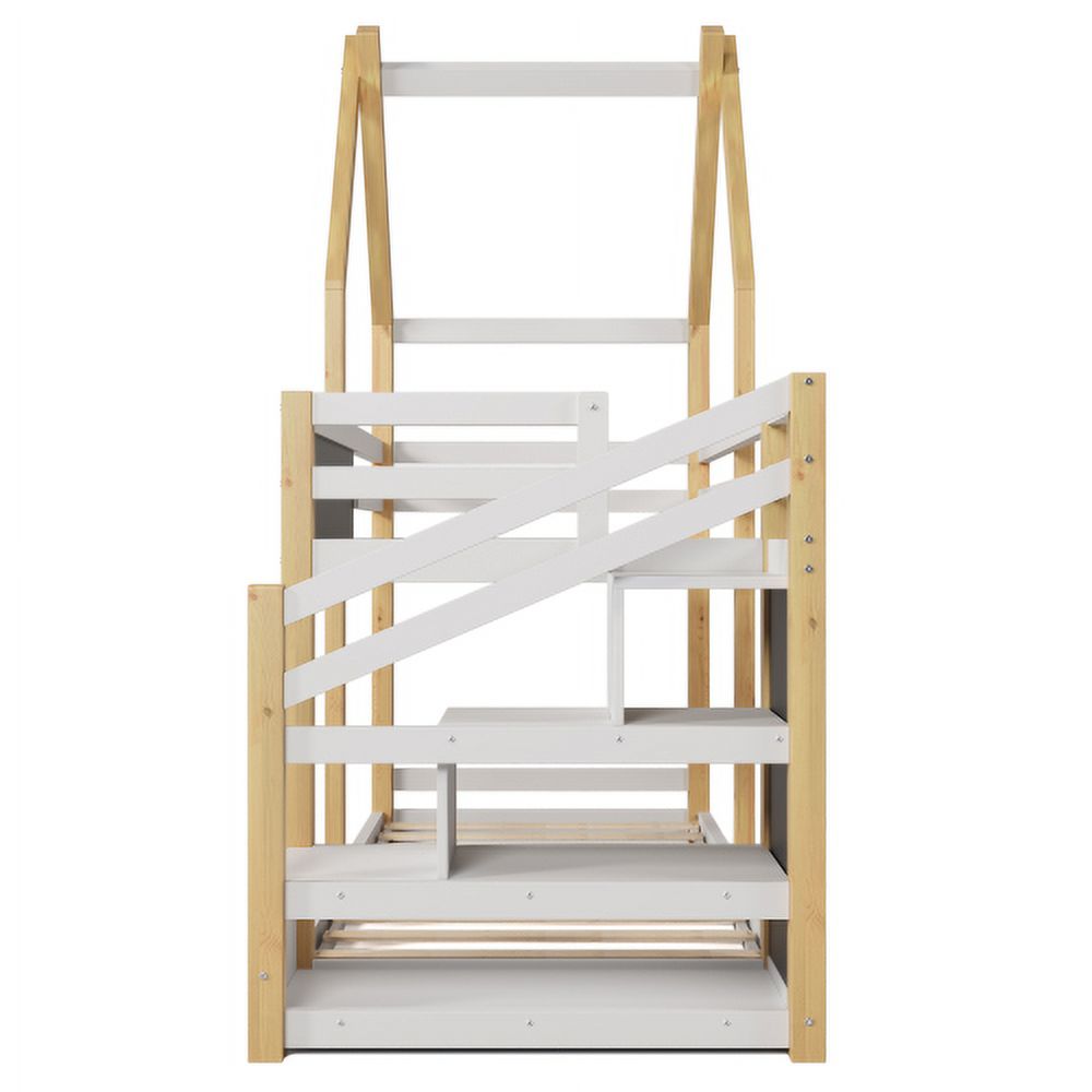 Twin Over Twin House Bunk Bed With White Storage Staircase And Blackboard, White And Natural