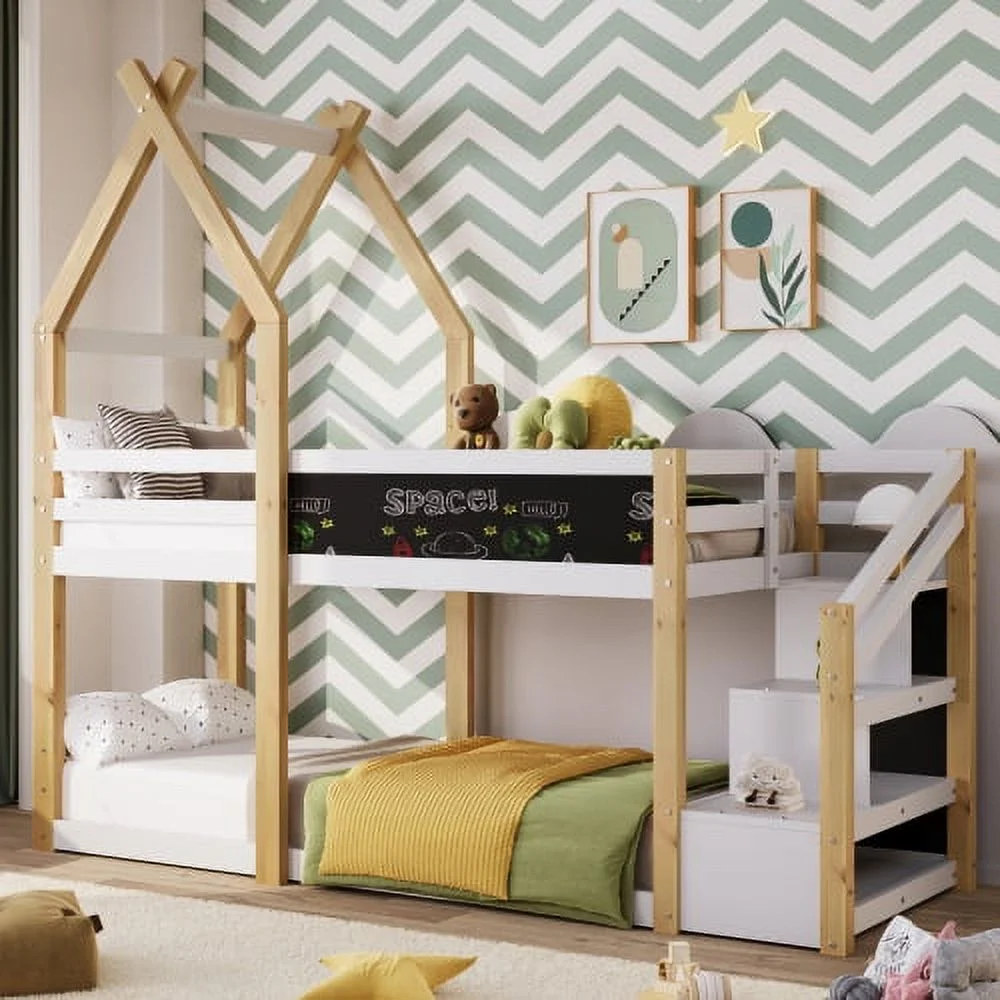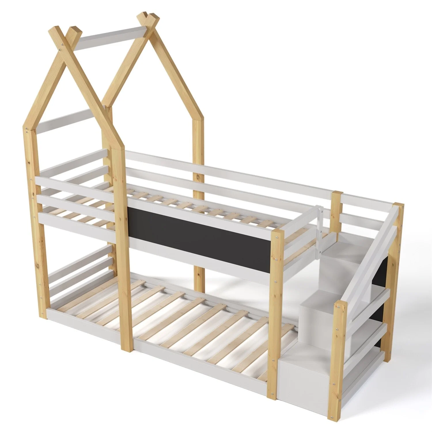 MERAX Twin over Twin House Bunk Bed with White Storage Staircase and 2 Blackboards