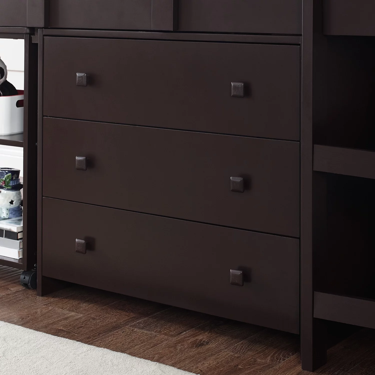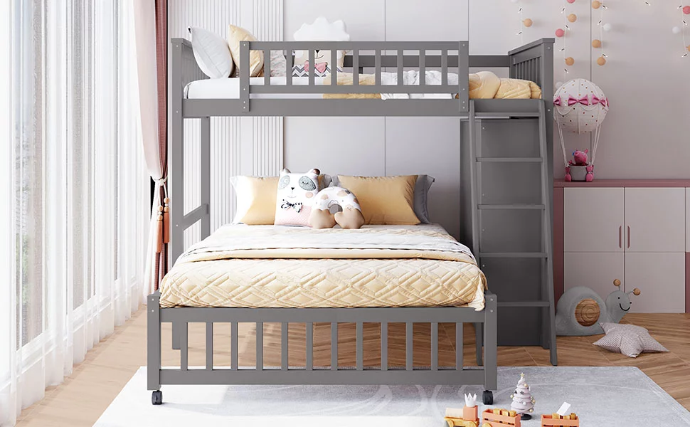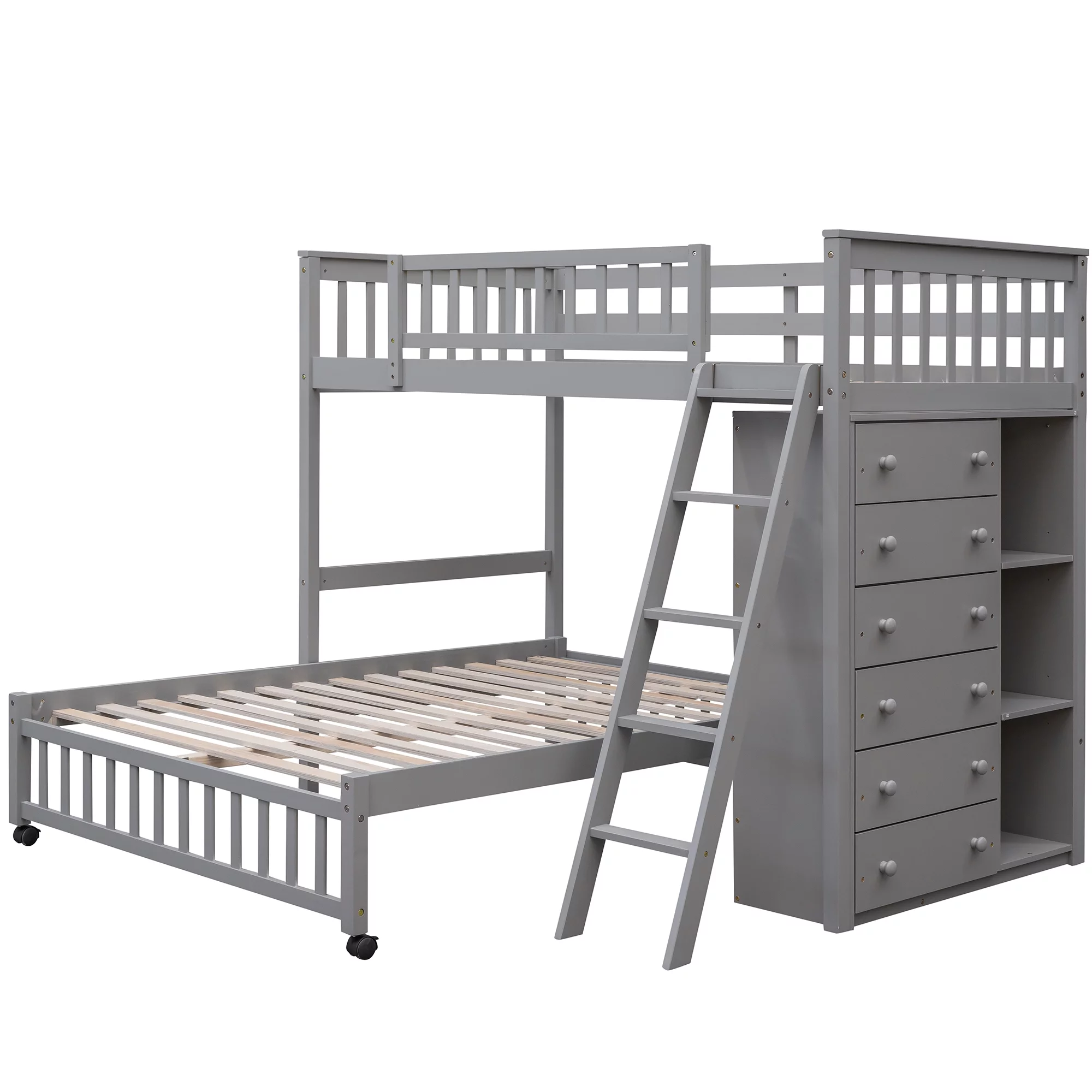 CoSoTower Wooden Twin Over Full Bunk Bed With Six Drawers And Flexible Shelves, Bottom Bed With Wheels, Gray