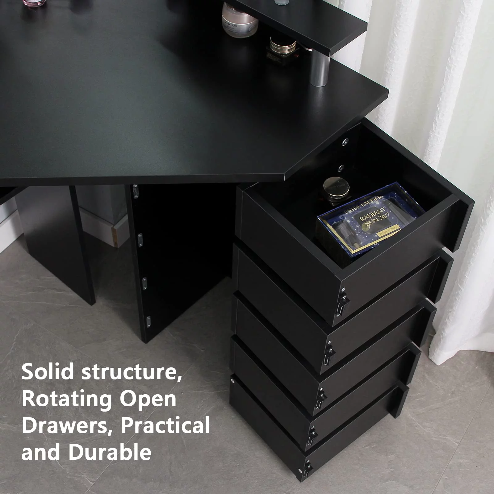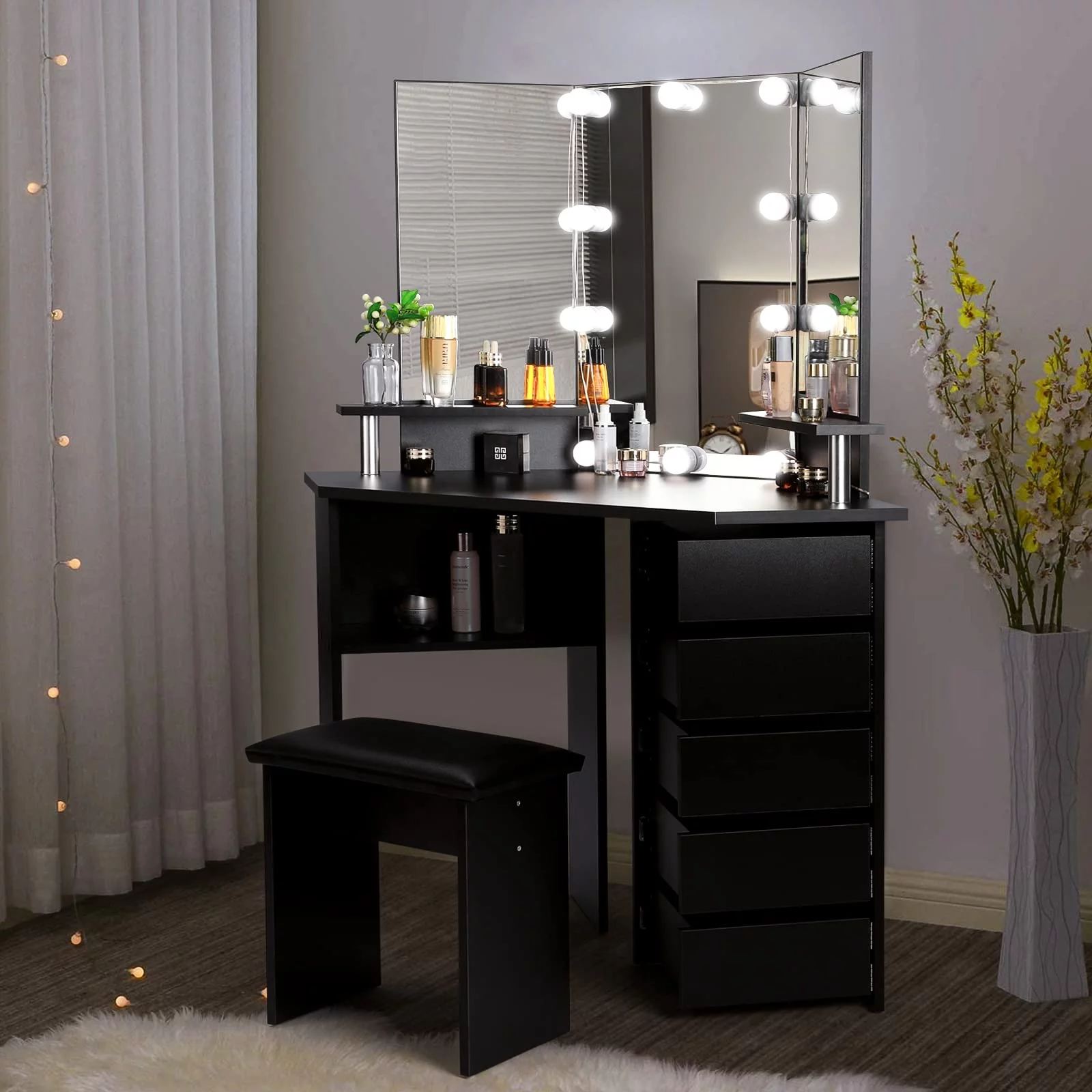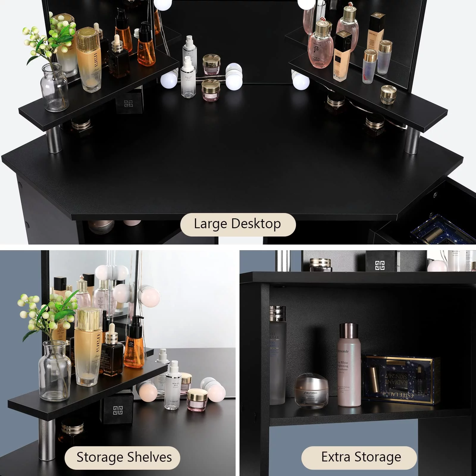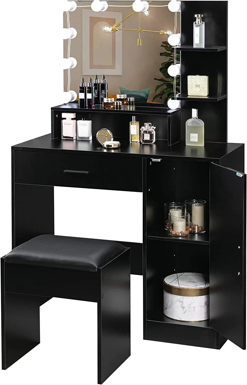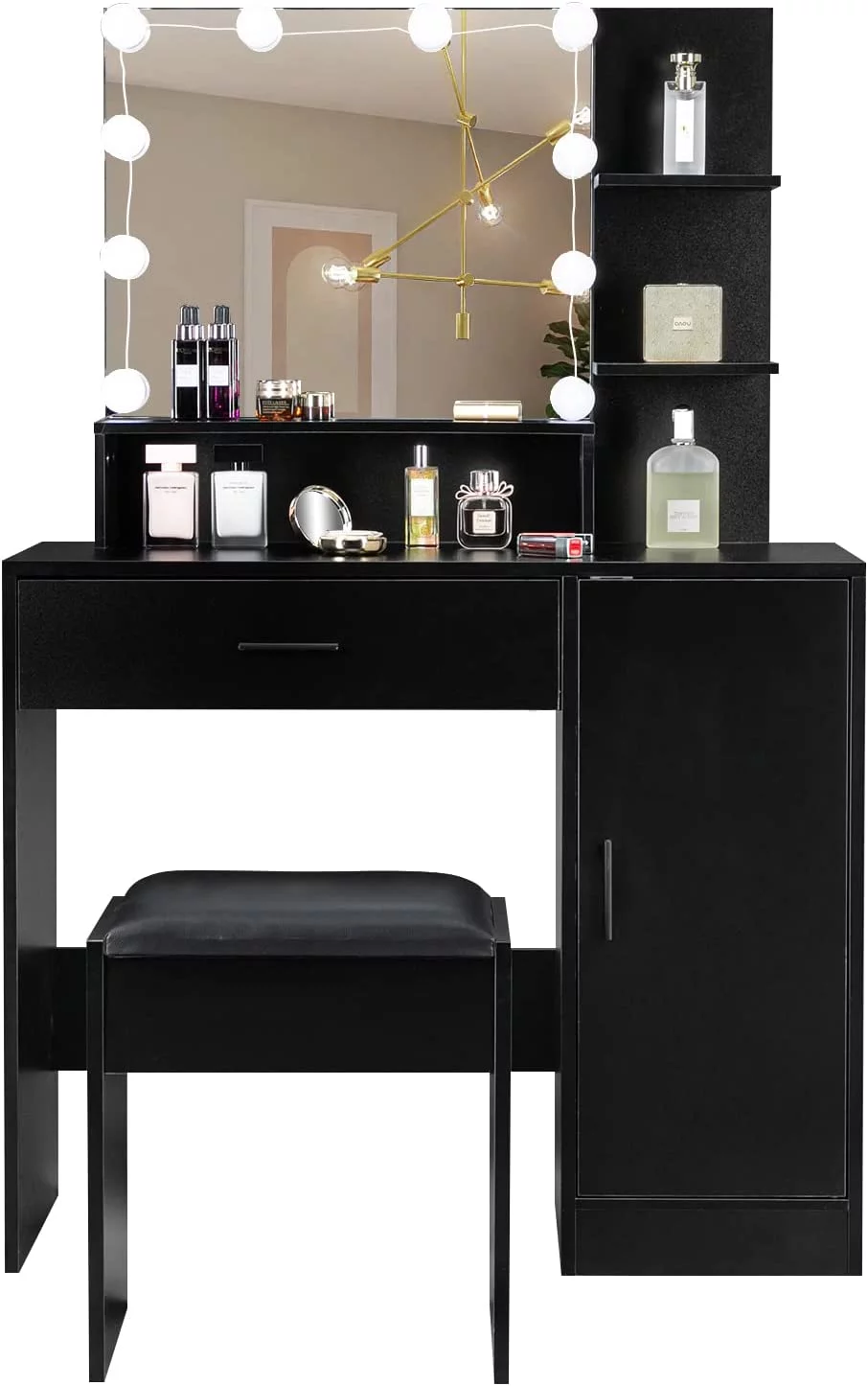 VINGLI Makeup Vanity Desk with Mirror and 10 LED Lights in 3 Colors,1 Drawer,3 Storage Shelves and 1 Cabinet,Black