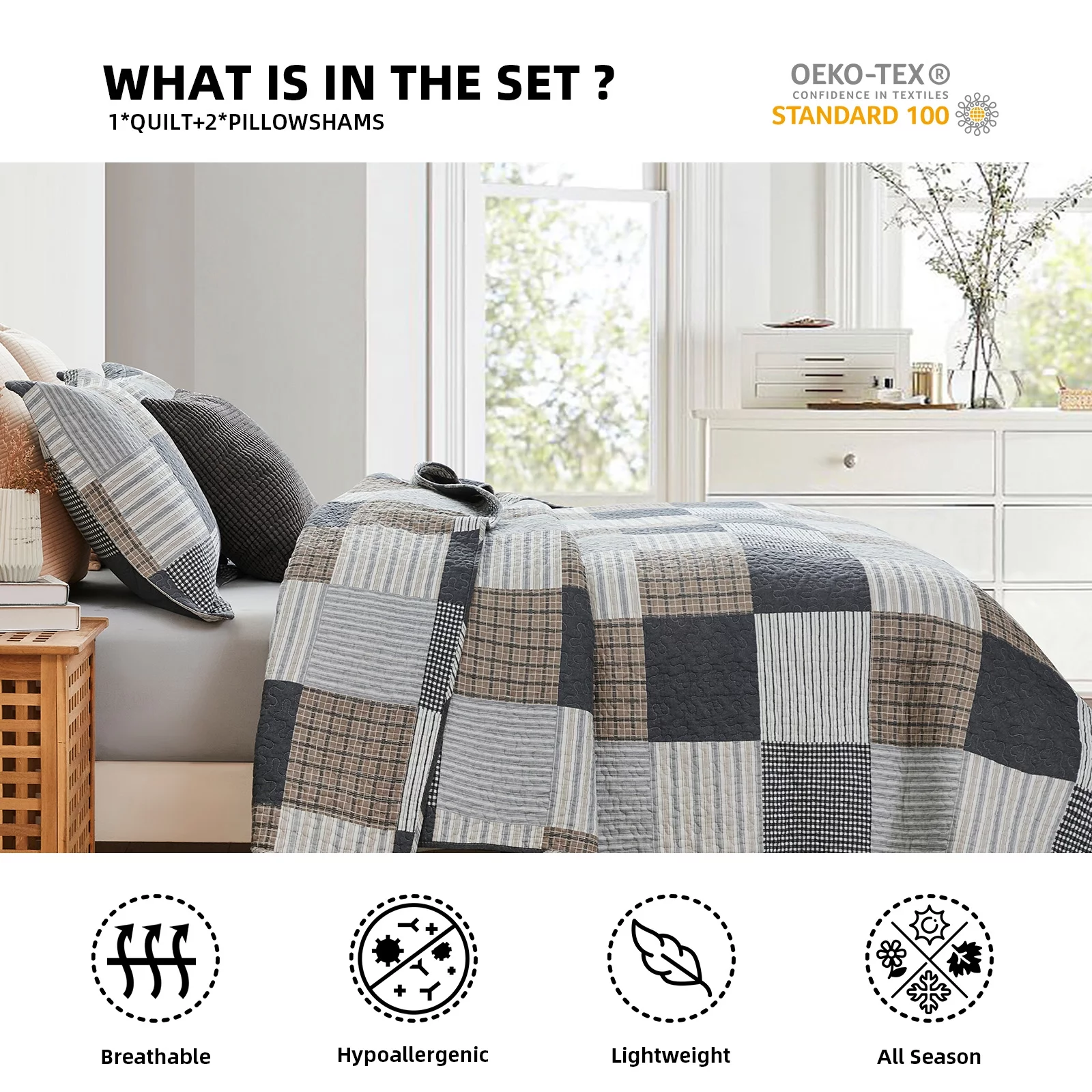 East West Furniture 2 Piece Fannin Queen Size Bedroom Set - Mist Beige, Black & White