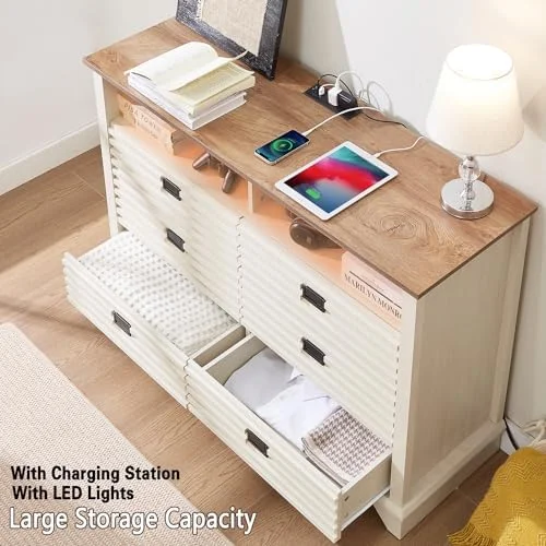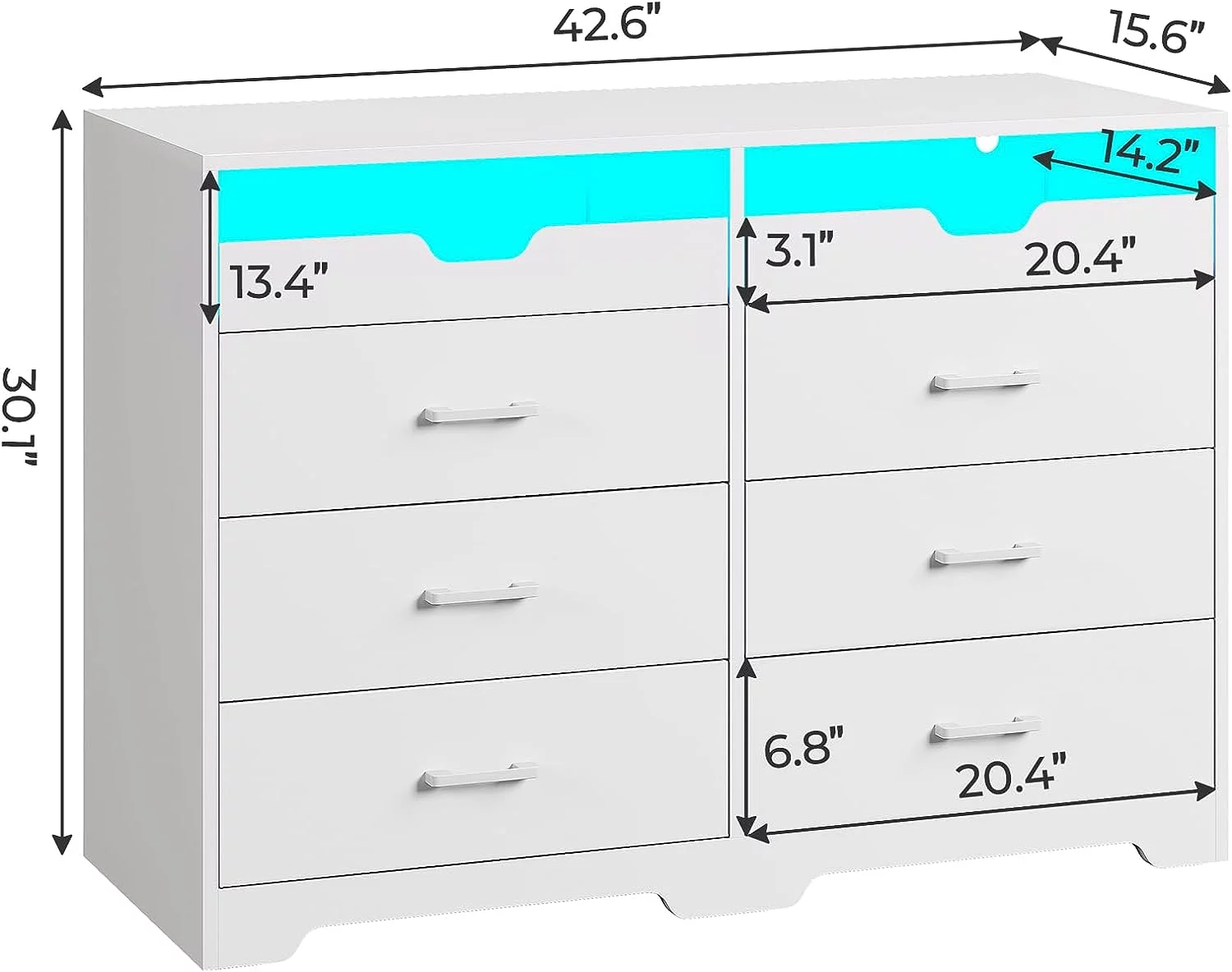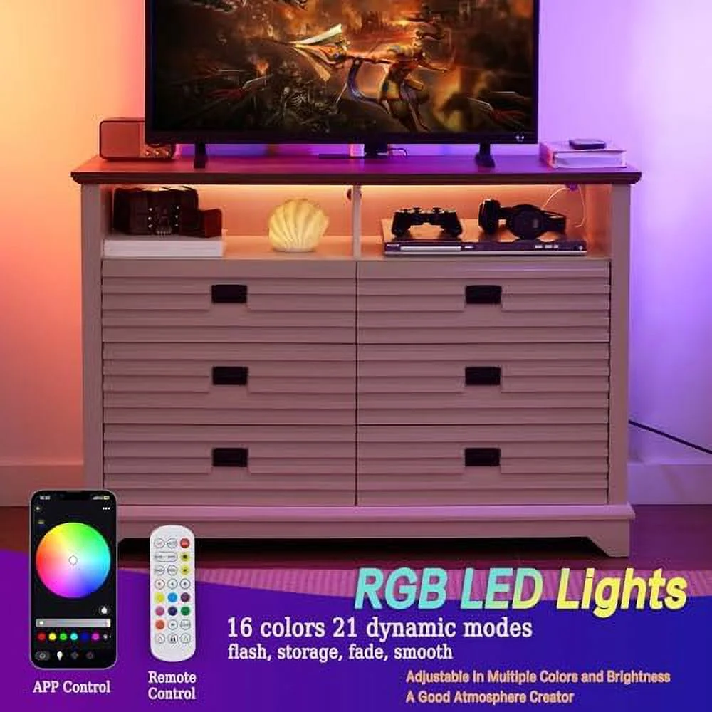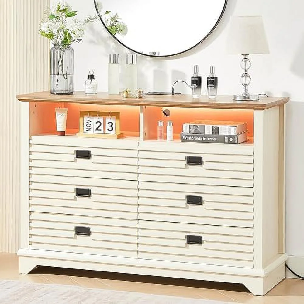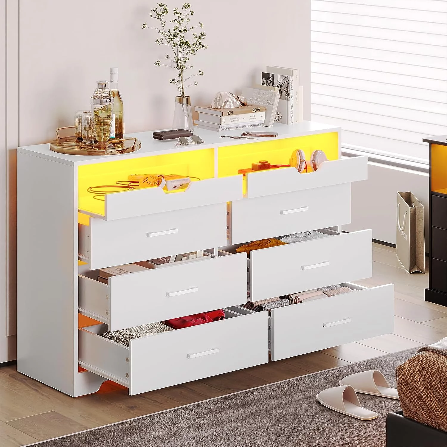Dresser with LED Lights for Bedroom, Double Dresser with 6 Drawers and Pull-Out Tray, White