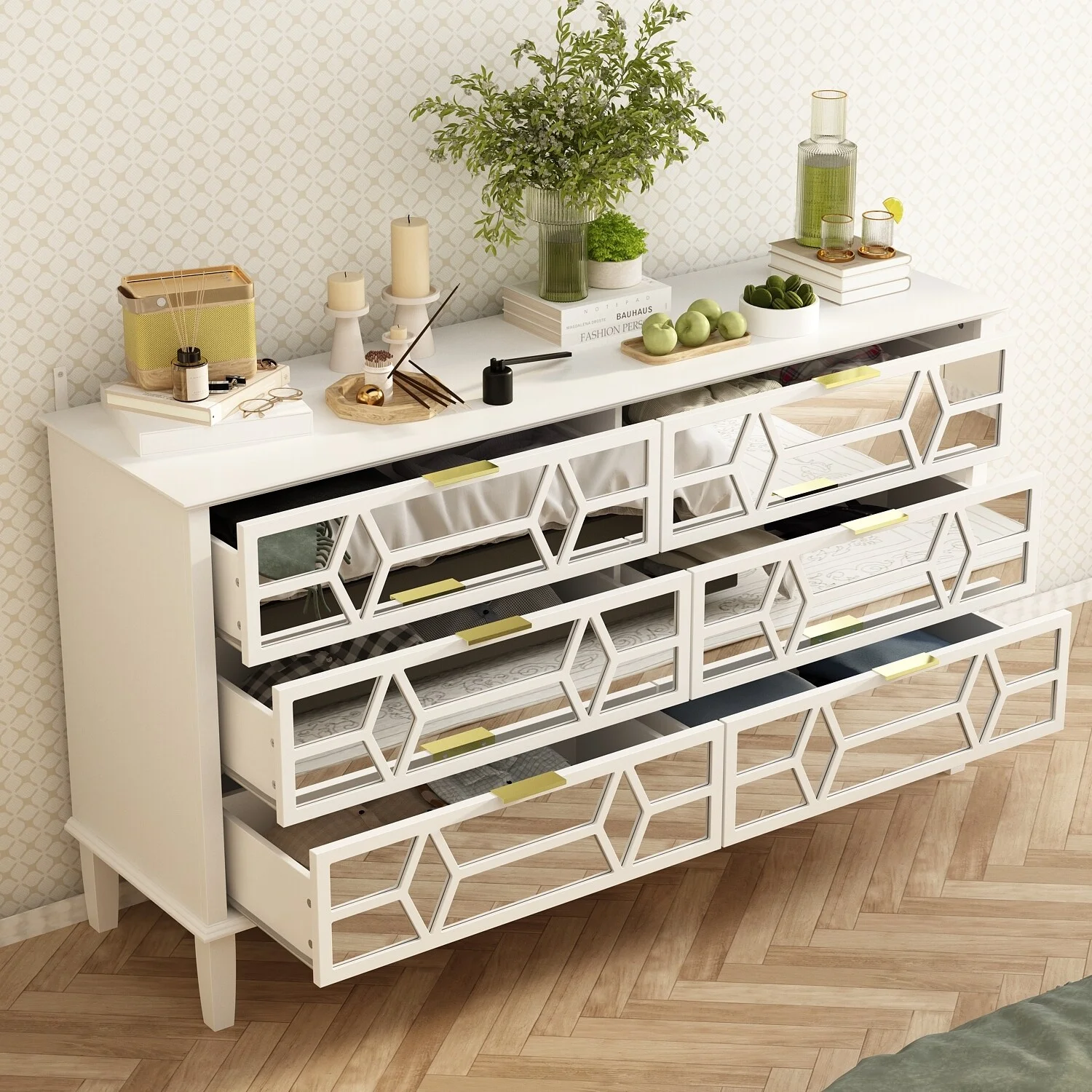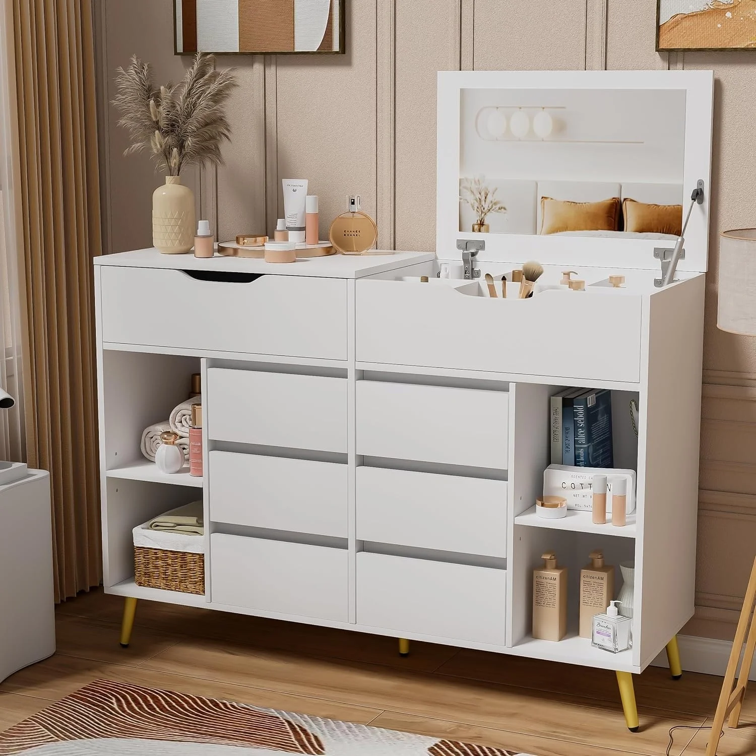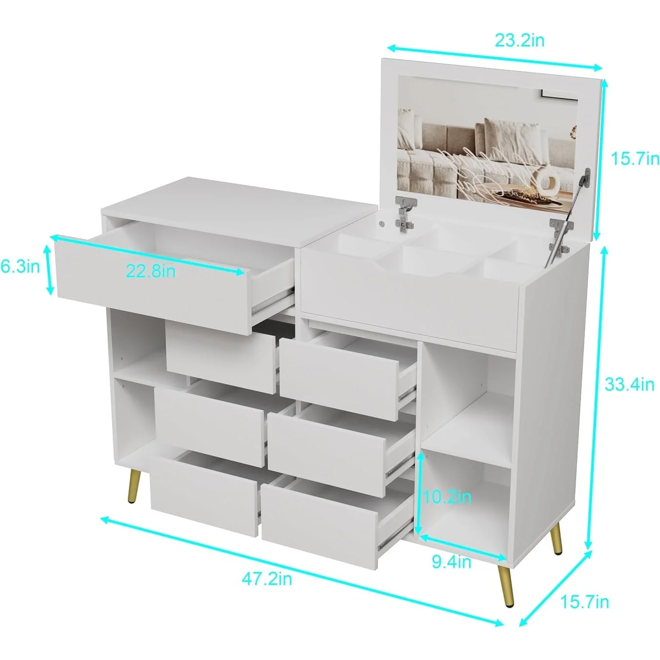 Bornmio Modern Concise 4-Drawer 360-Degree Rotation Removable Mirror Dresser White
