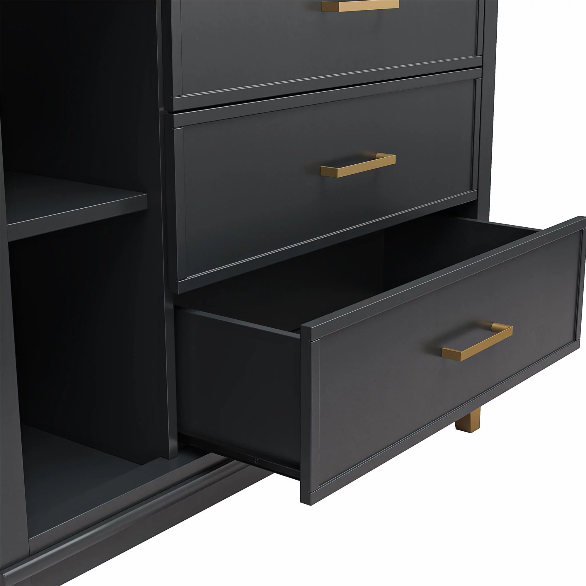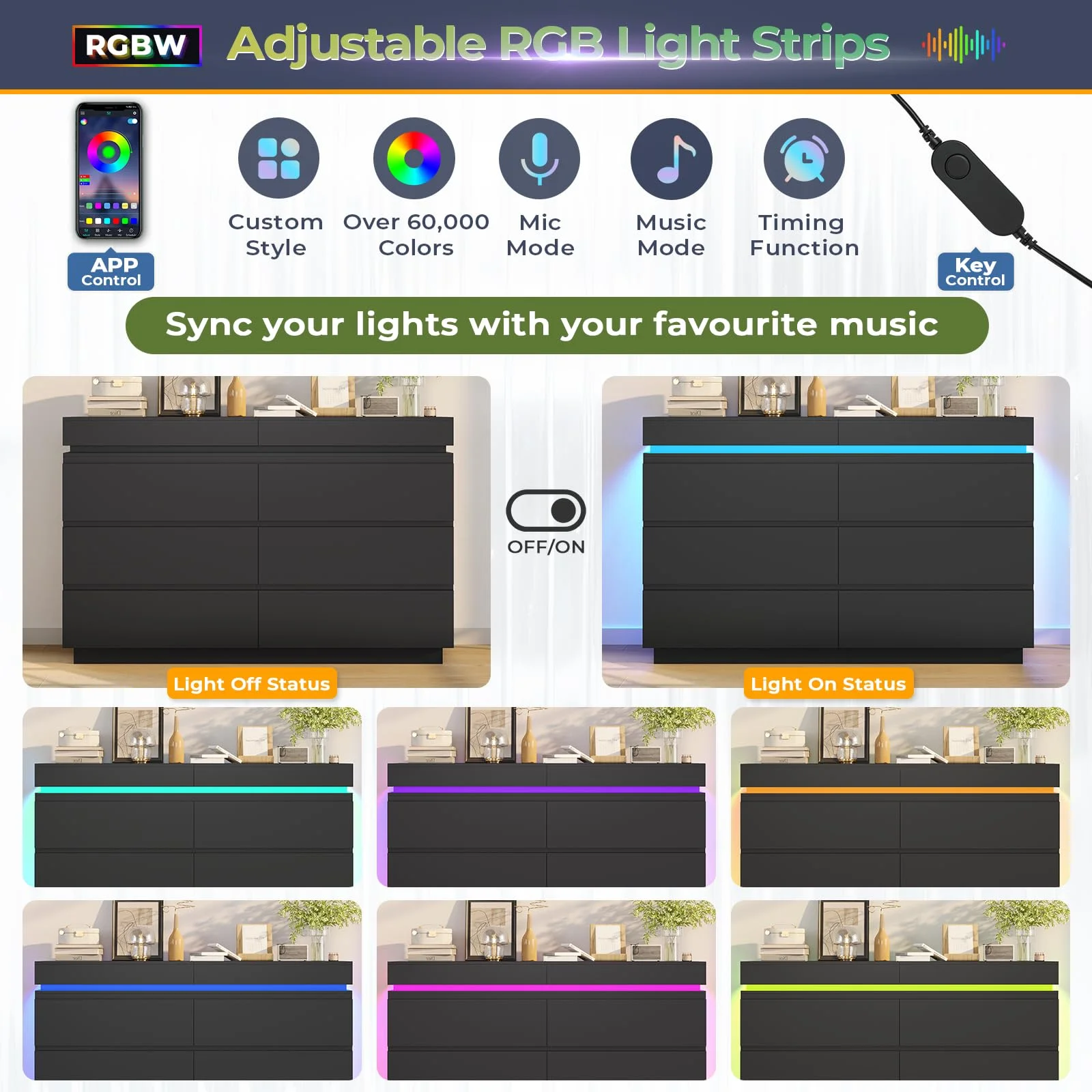 Afuhokles Dressers for Bedroom with Charging Station, Modern 6 Drawer Dresser with Sliding Desktop and LED Light, Black