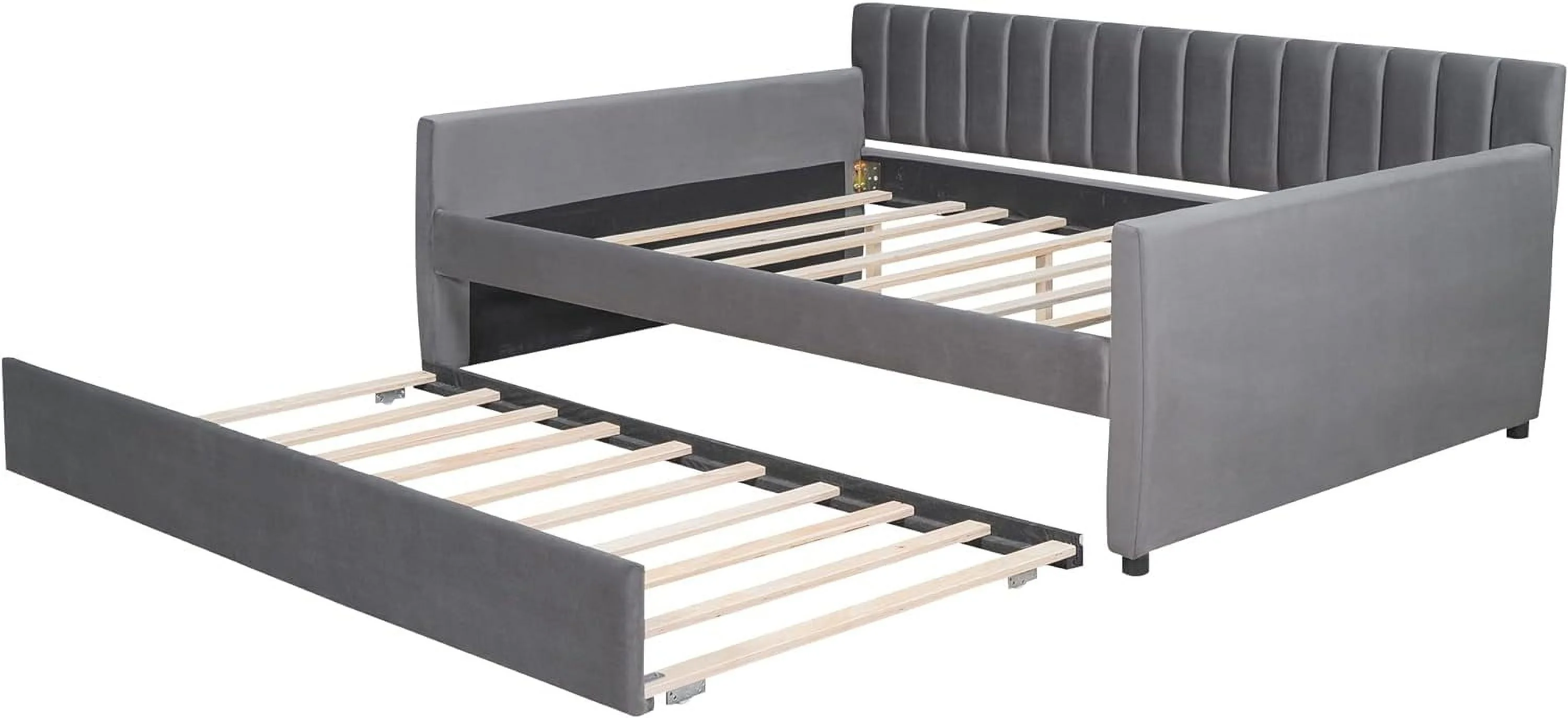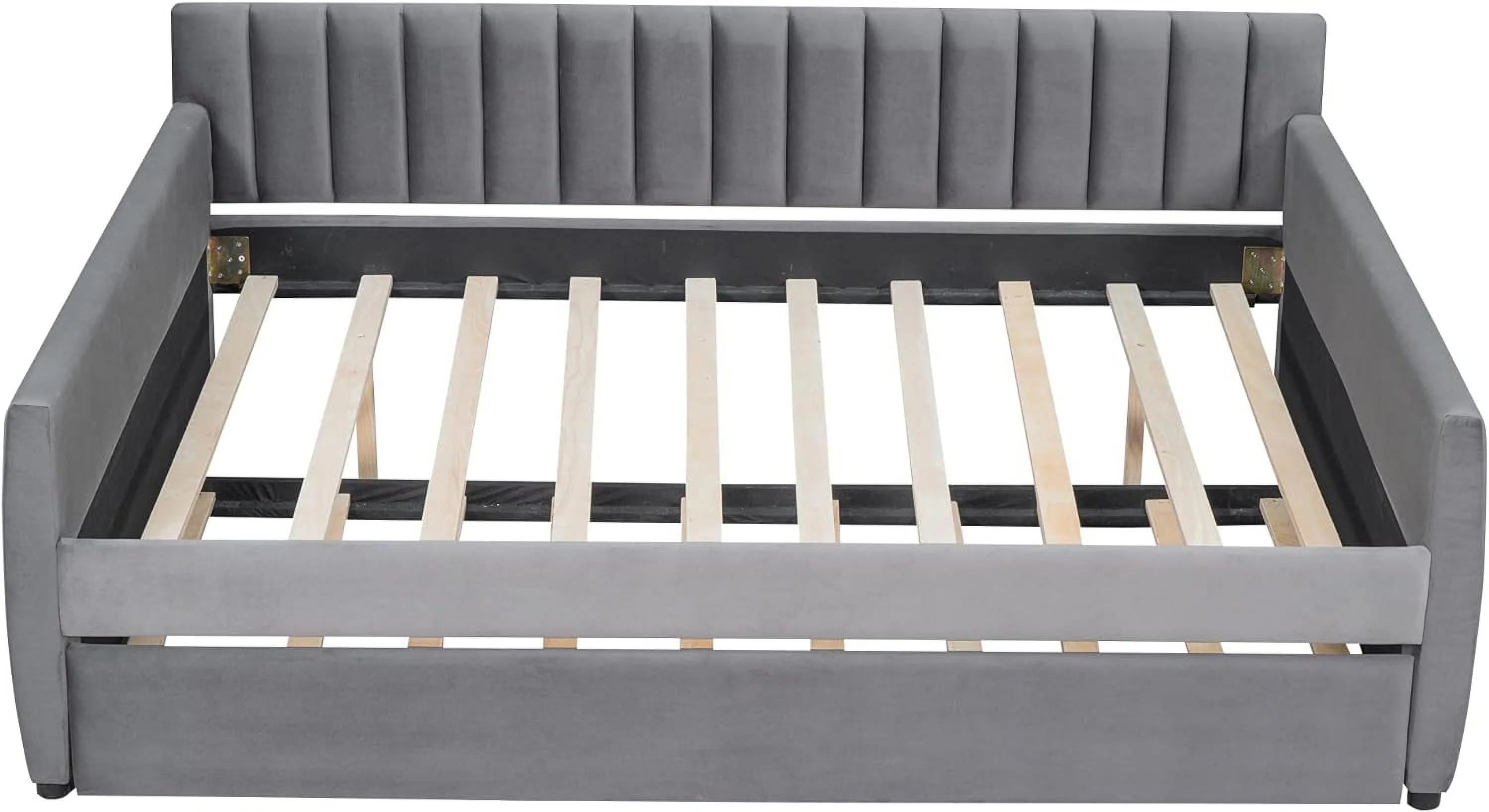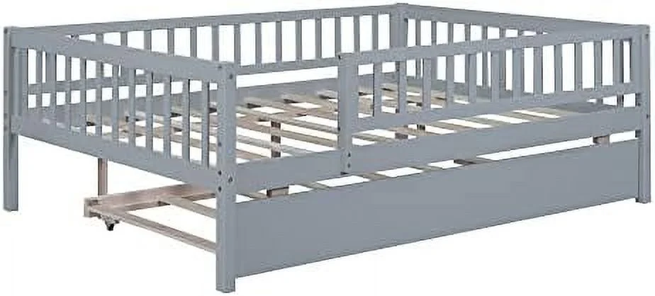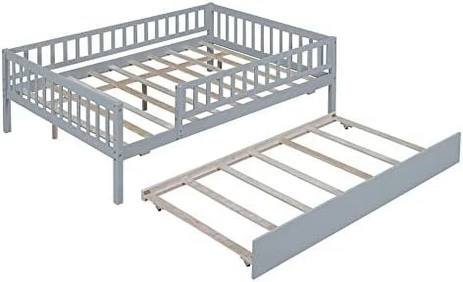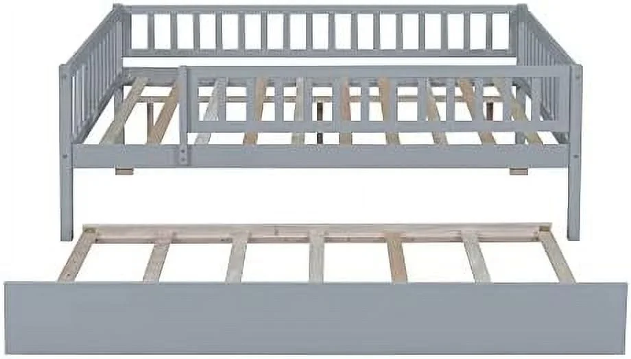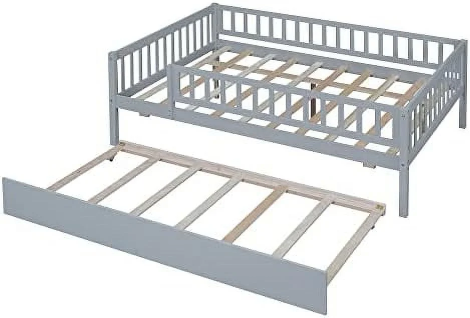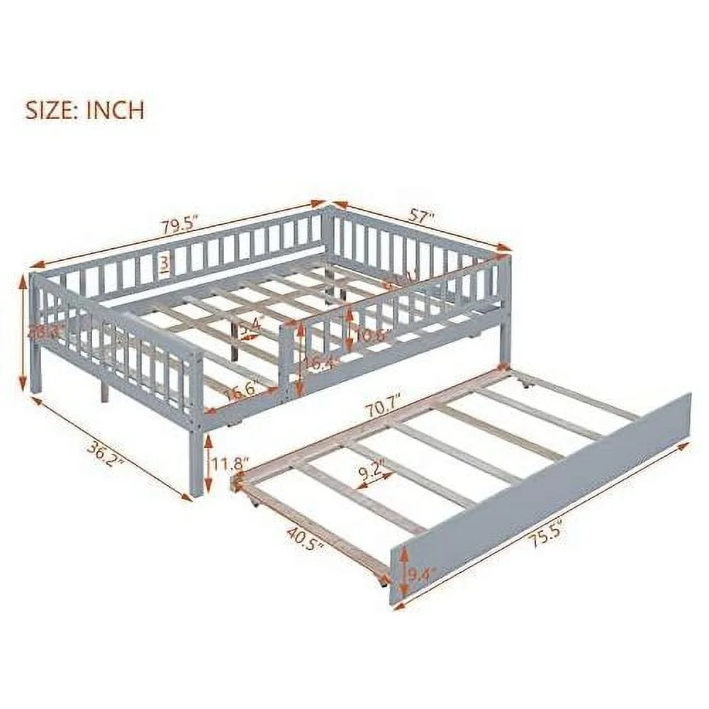 Full Size Daybed With Trundle, Wood Full Bed Frame With Fence Guardrails, No Box Spring Needed, Gray