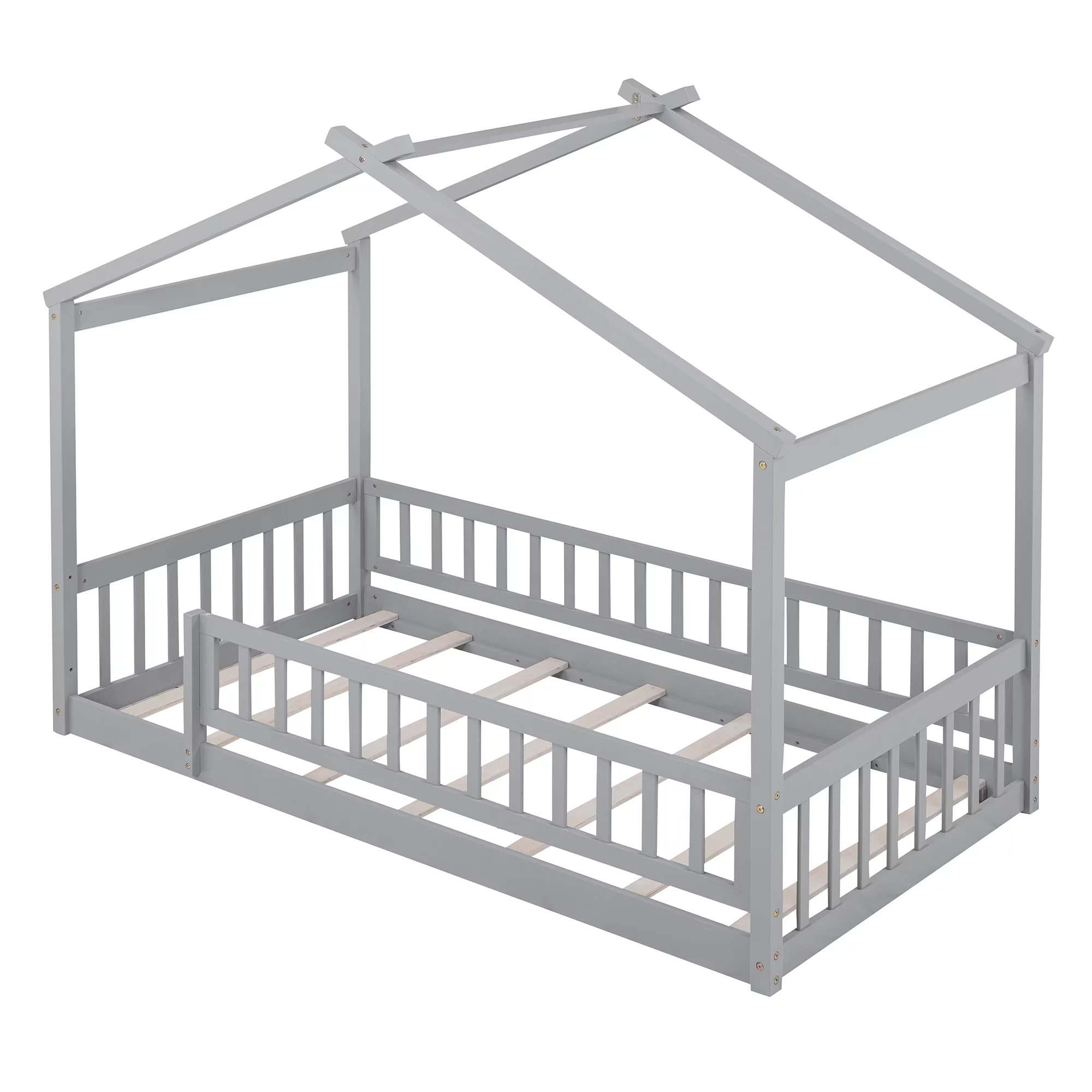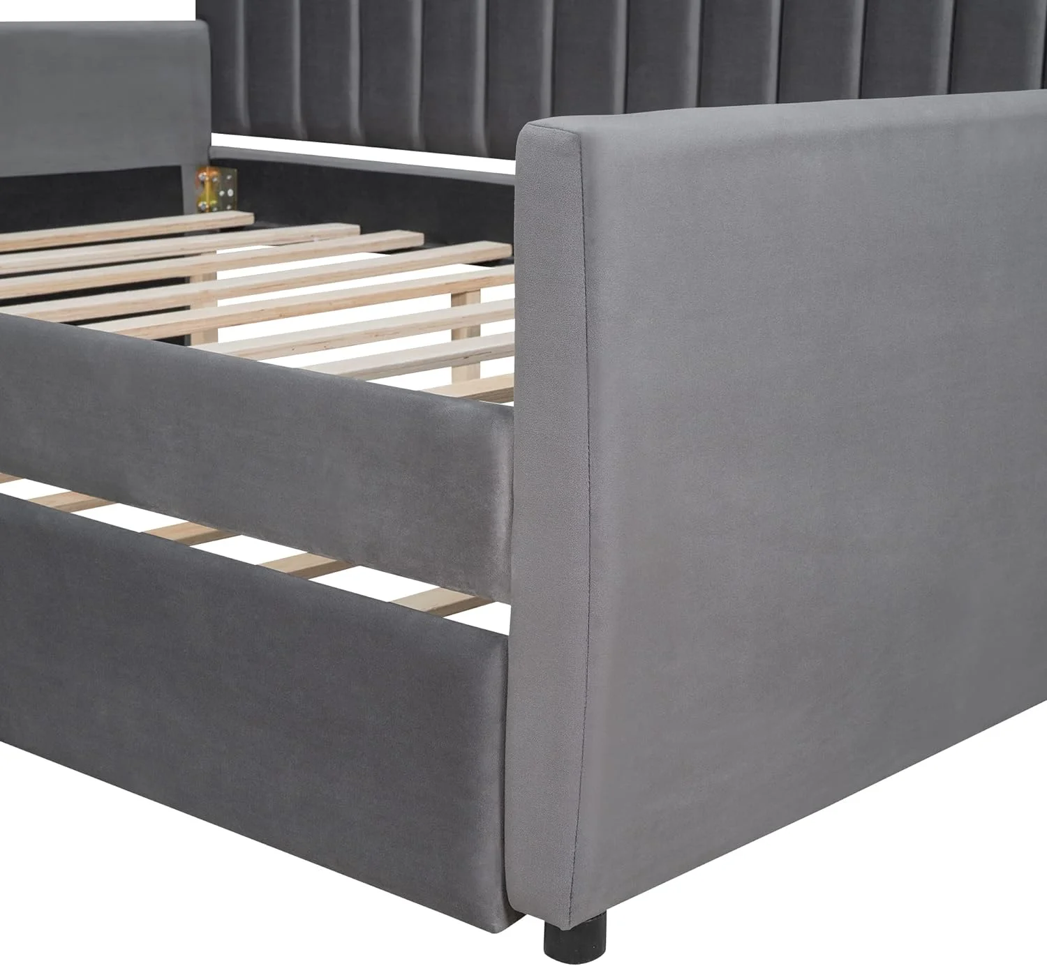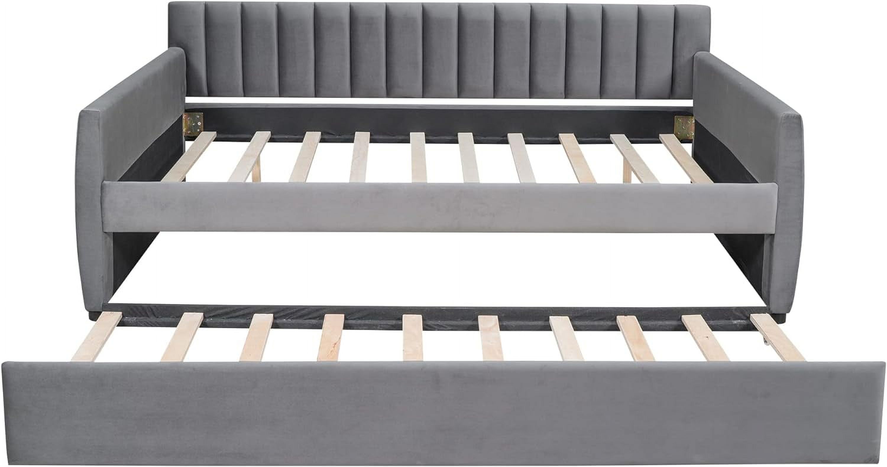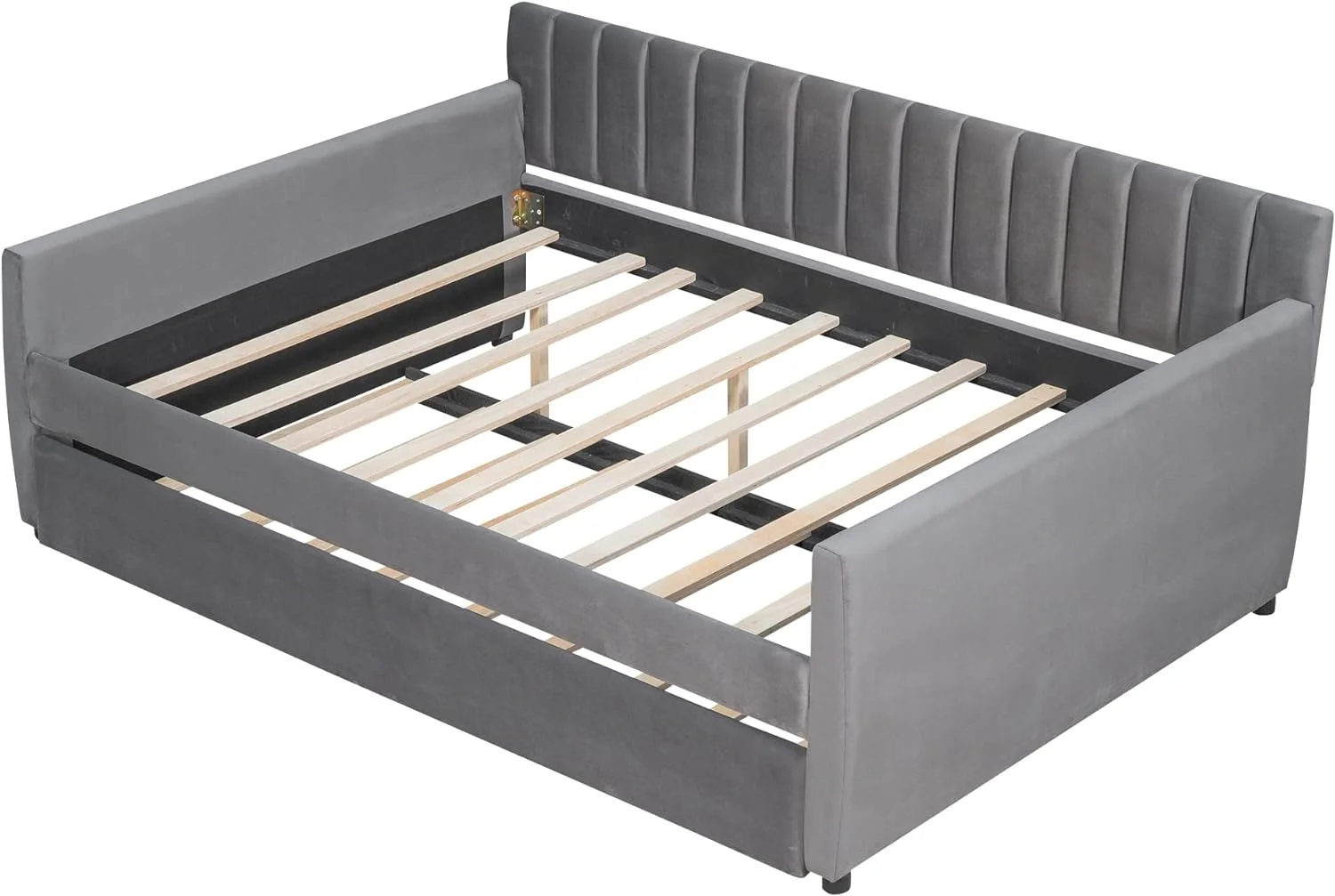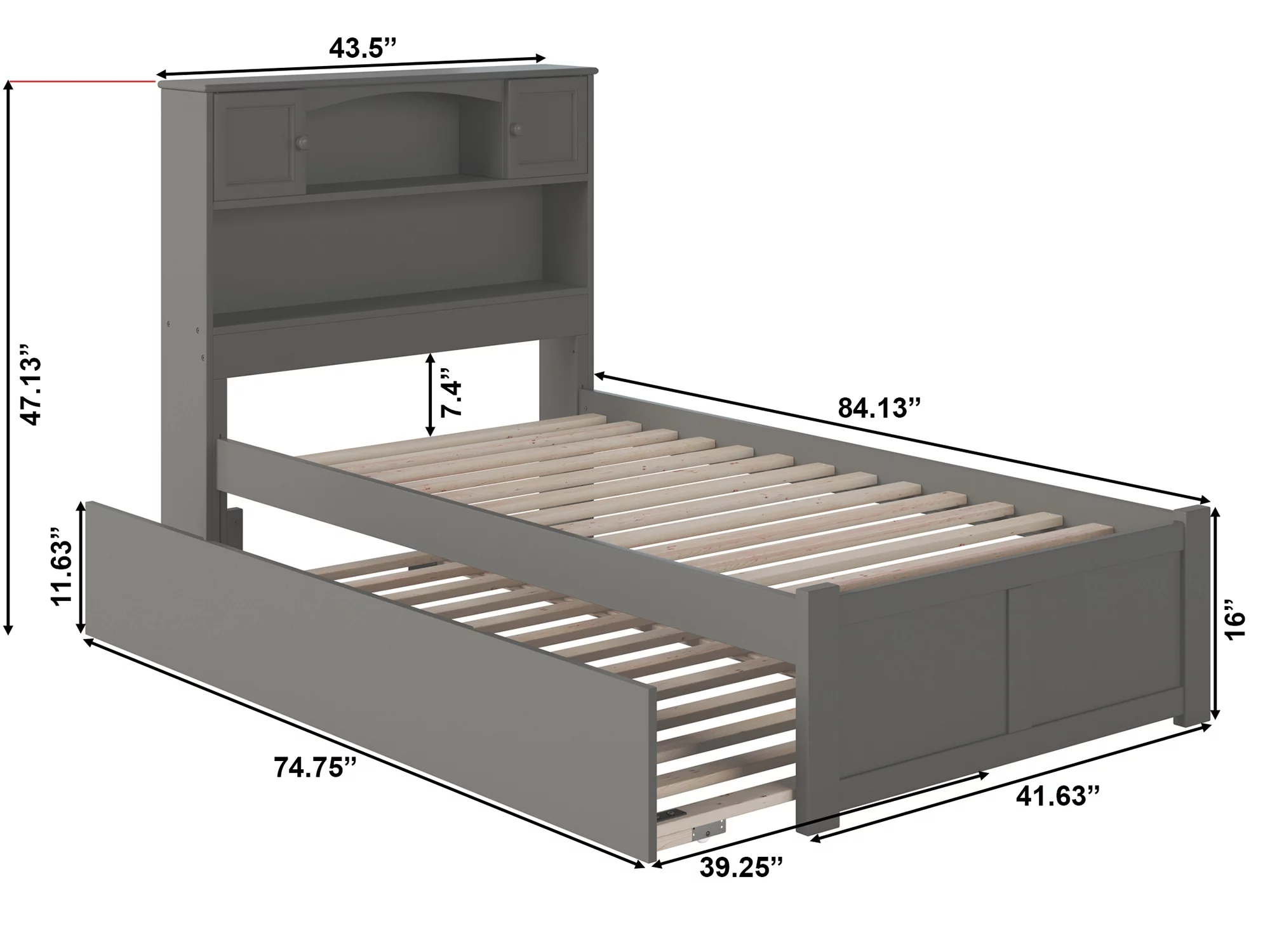 Full Size Daybed With Trundle, Wood Full Bed Frame With Fence Guardrails, No Box Spring Needed, Gray