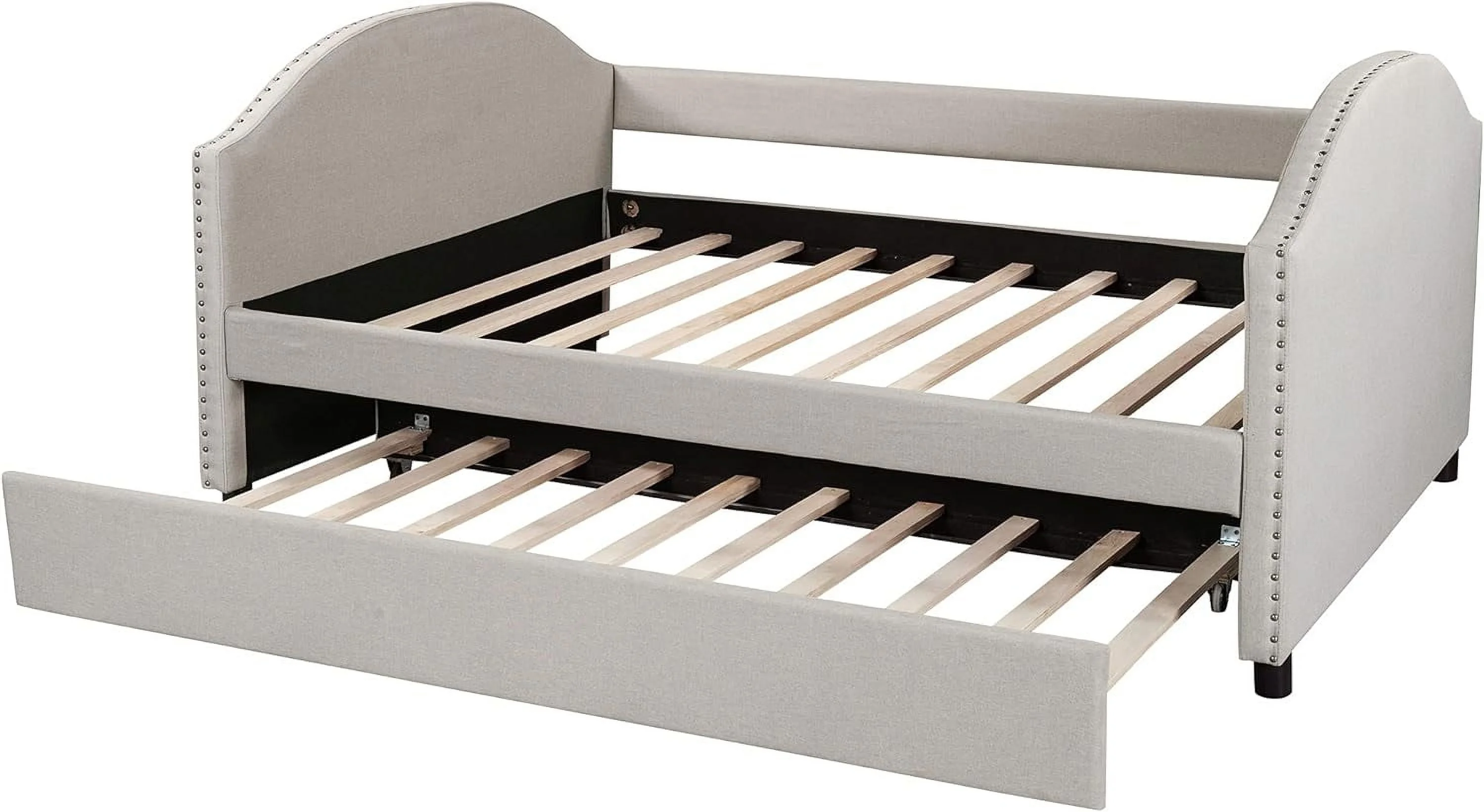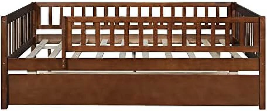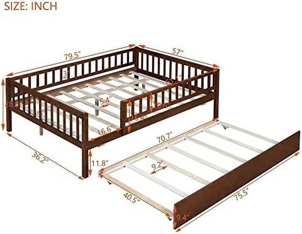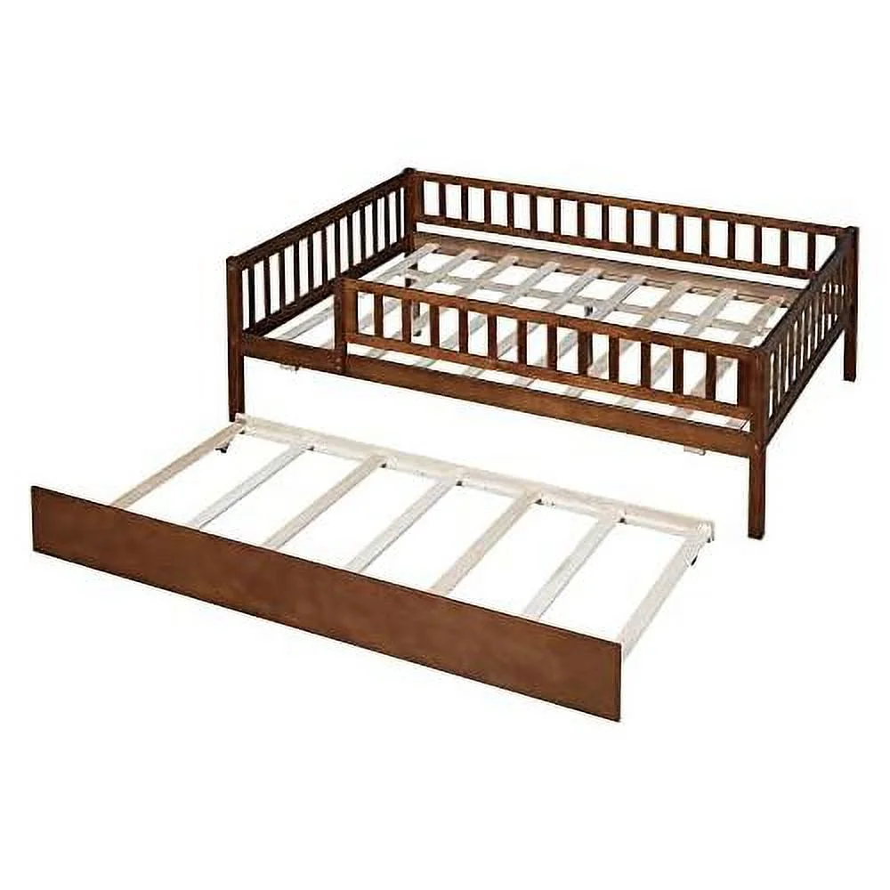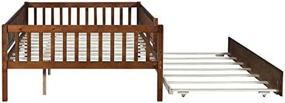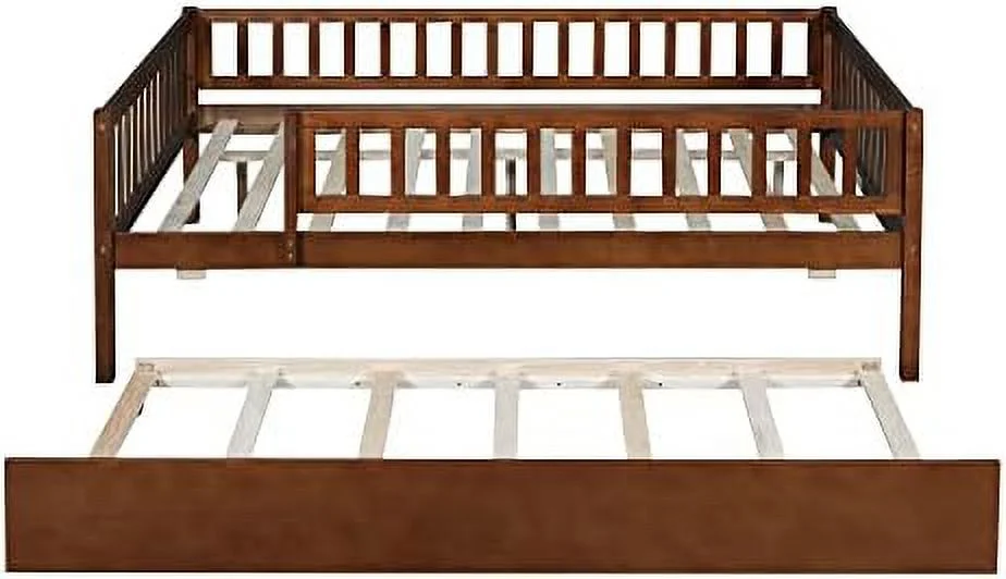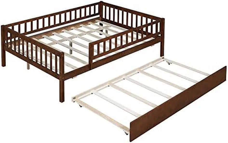 Full Size Daybed With Trundle, Wood Full Bed Frame With Fence Guardrails, No Box Spring Needed, Walnut