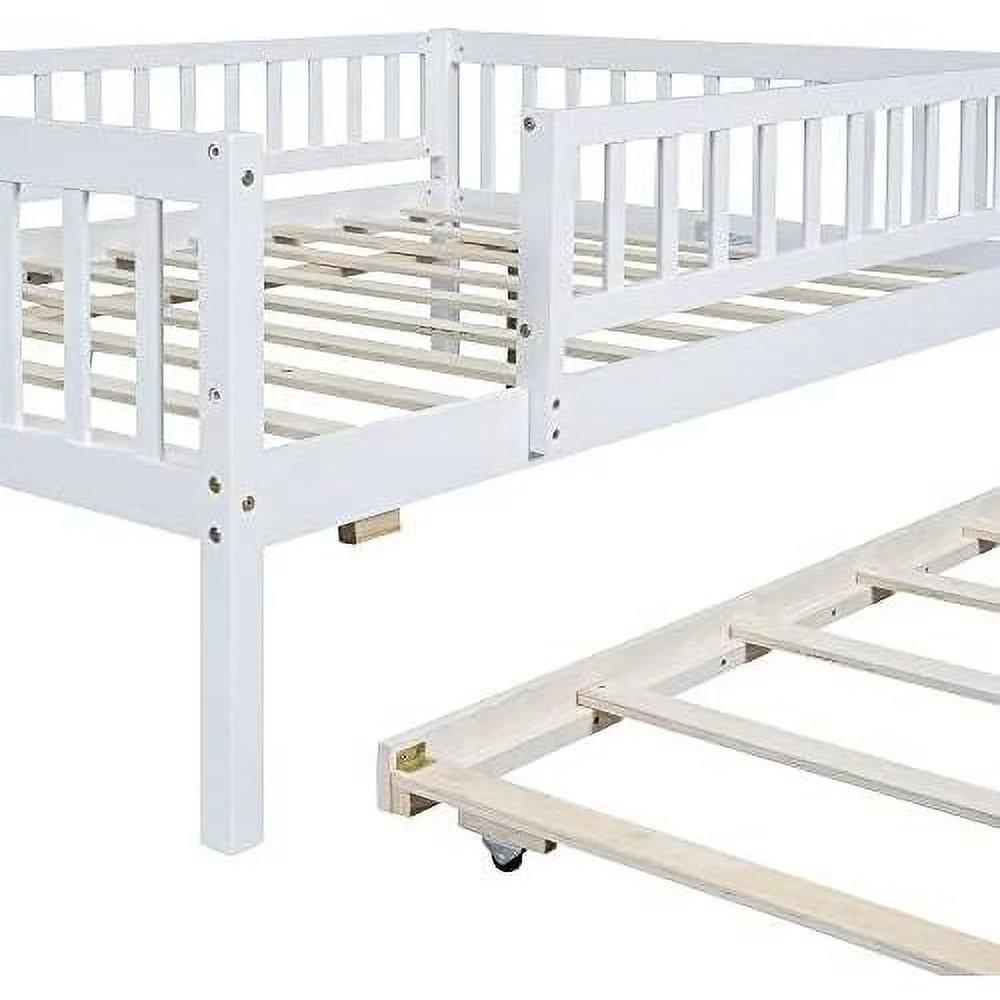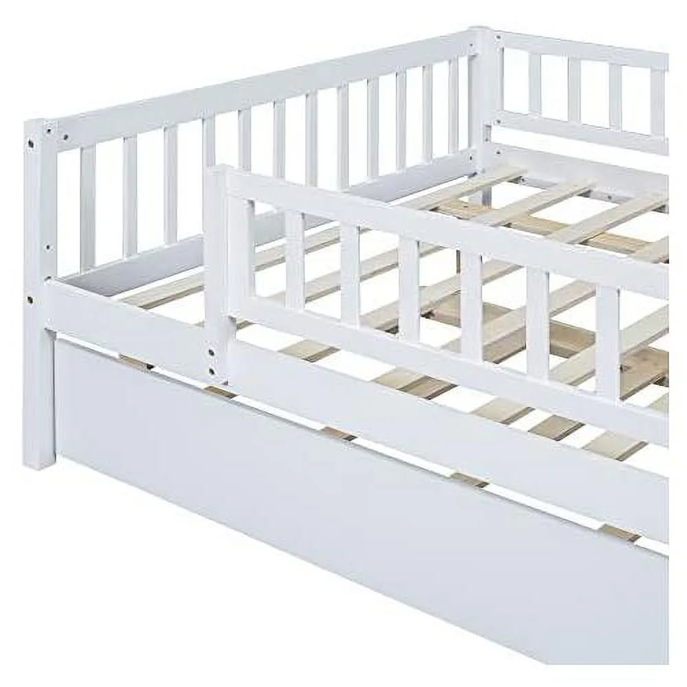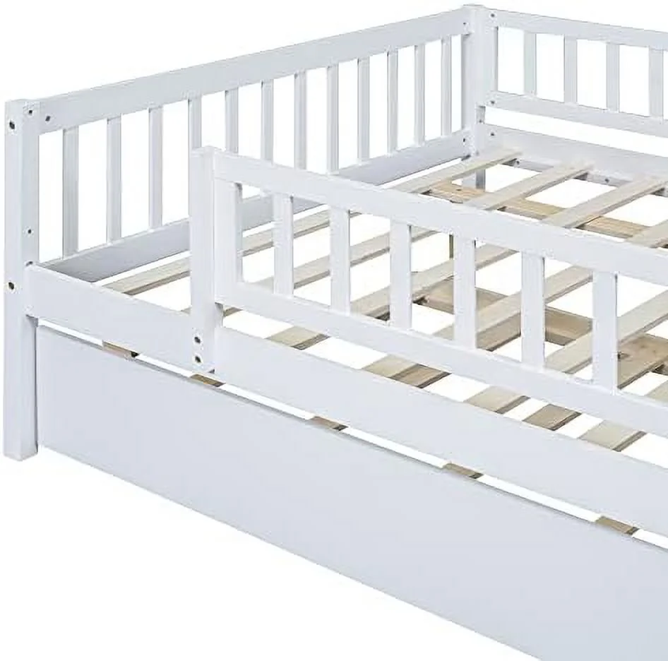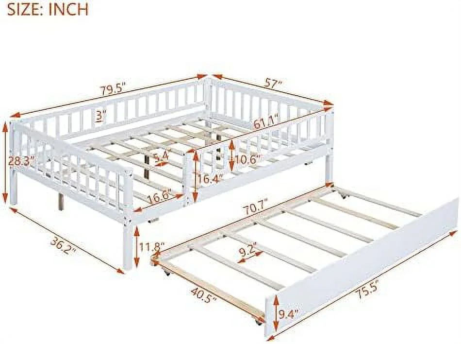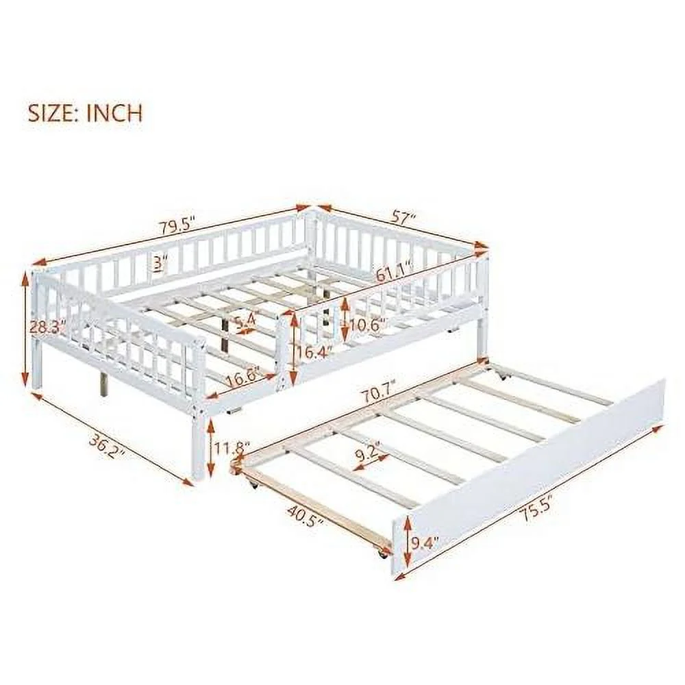Full Size Daybed With Trundle, Wood Full Bed Frame With Fence Guardrails, No Box Spring Needed, White