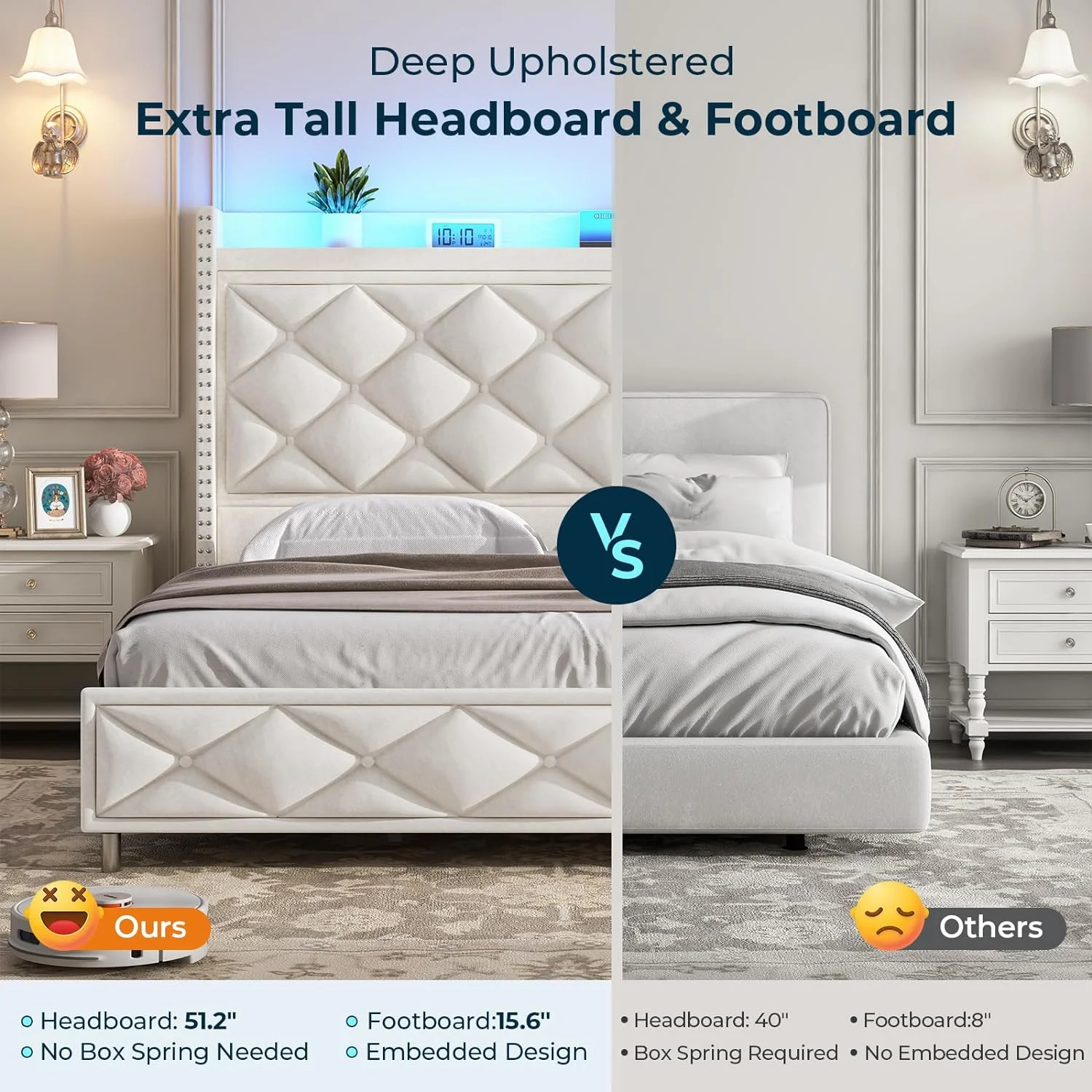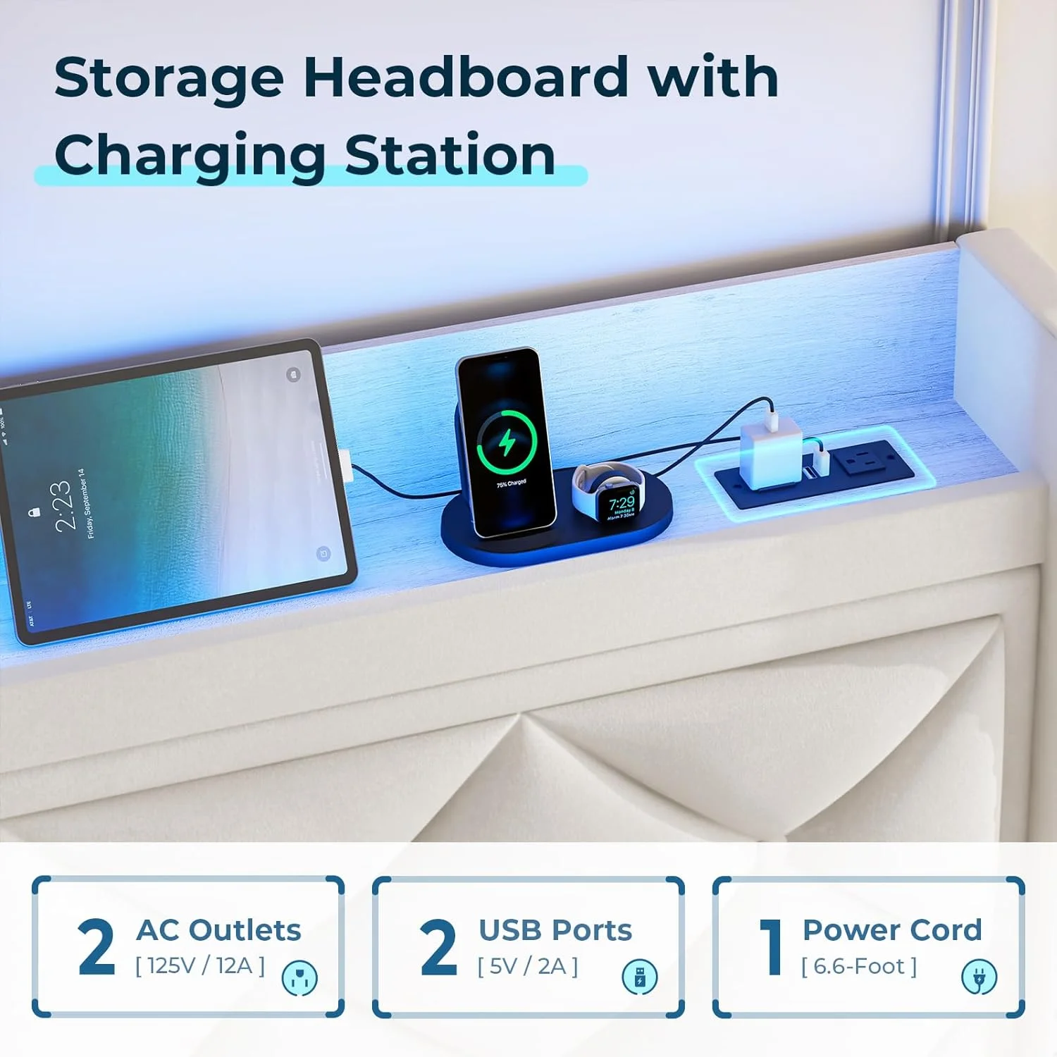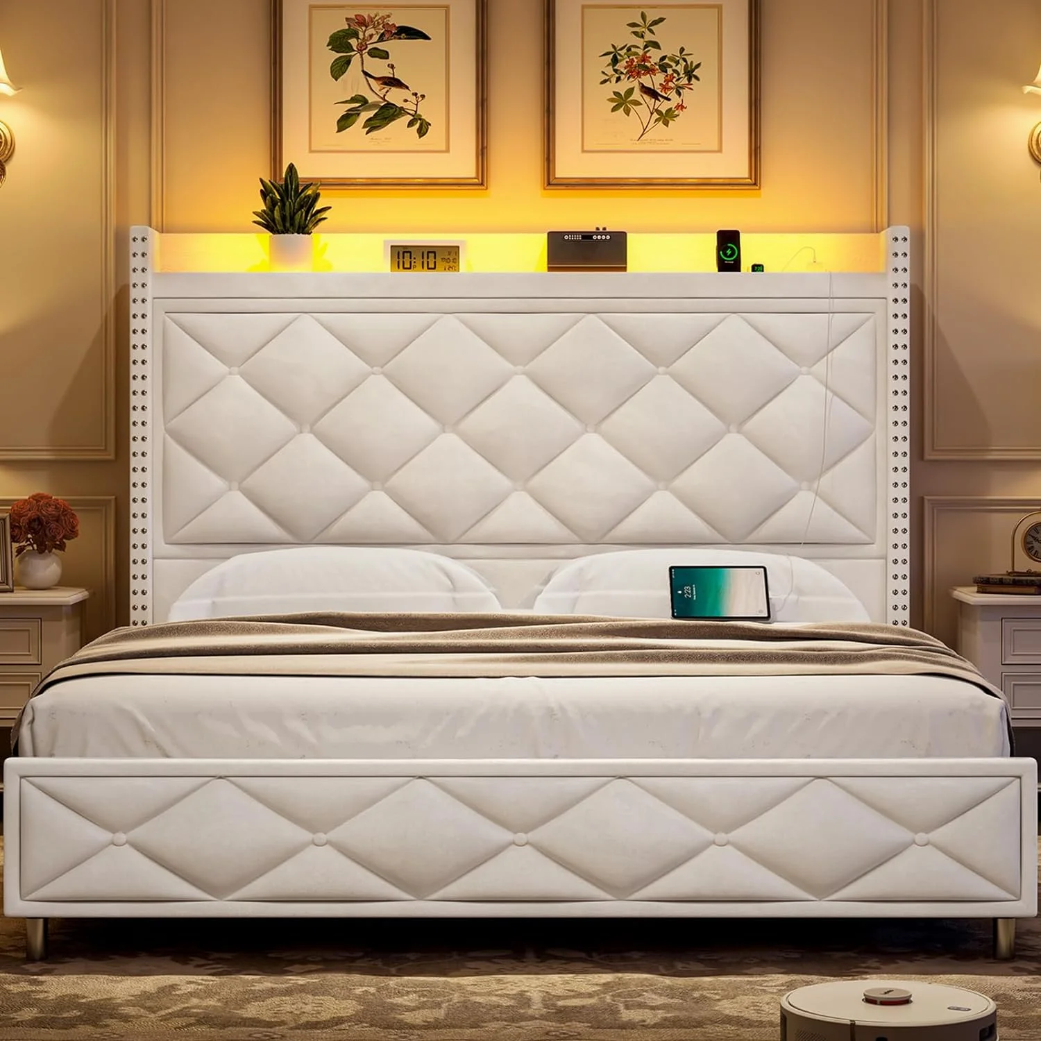 Modern Glam Cal-King Size Platform LED Light Bed Footboard Drawers White Finish Wooden Bedroom Furniture