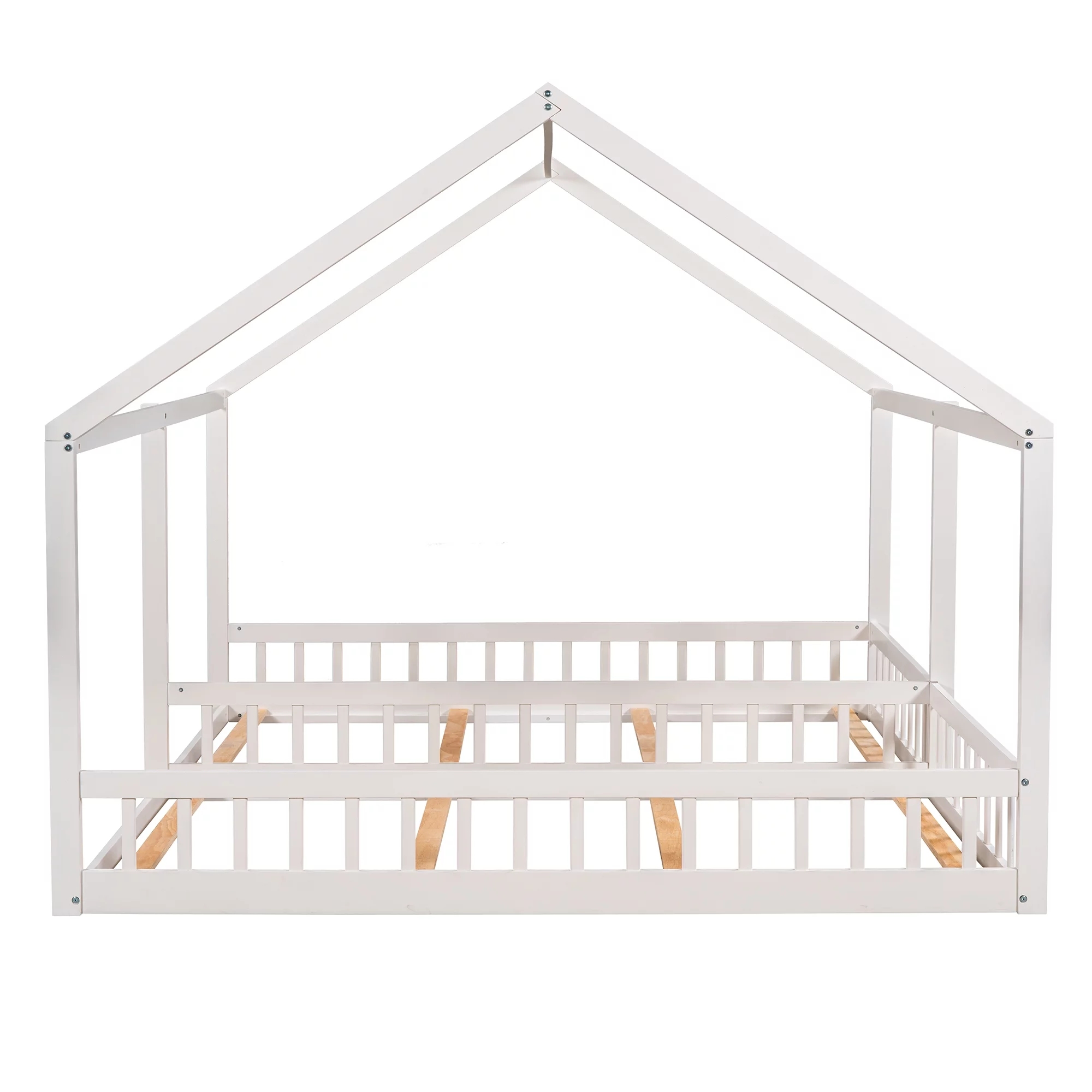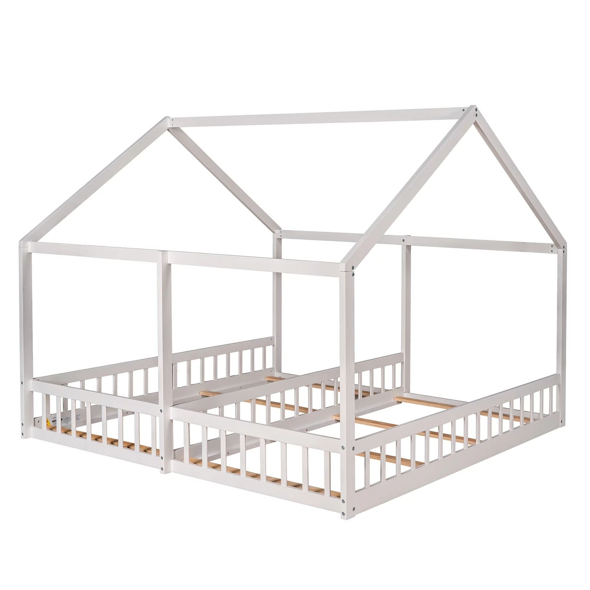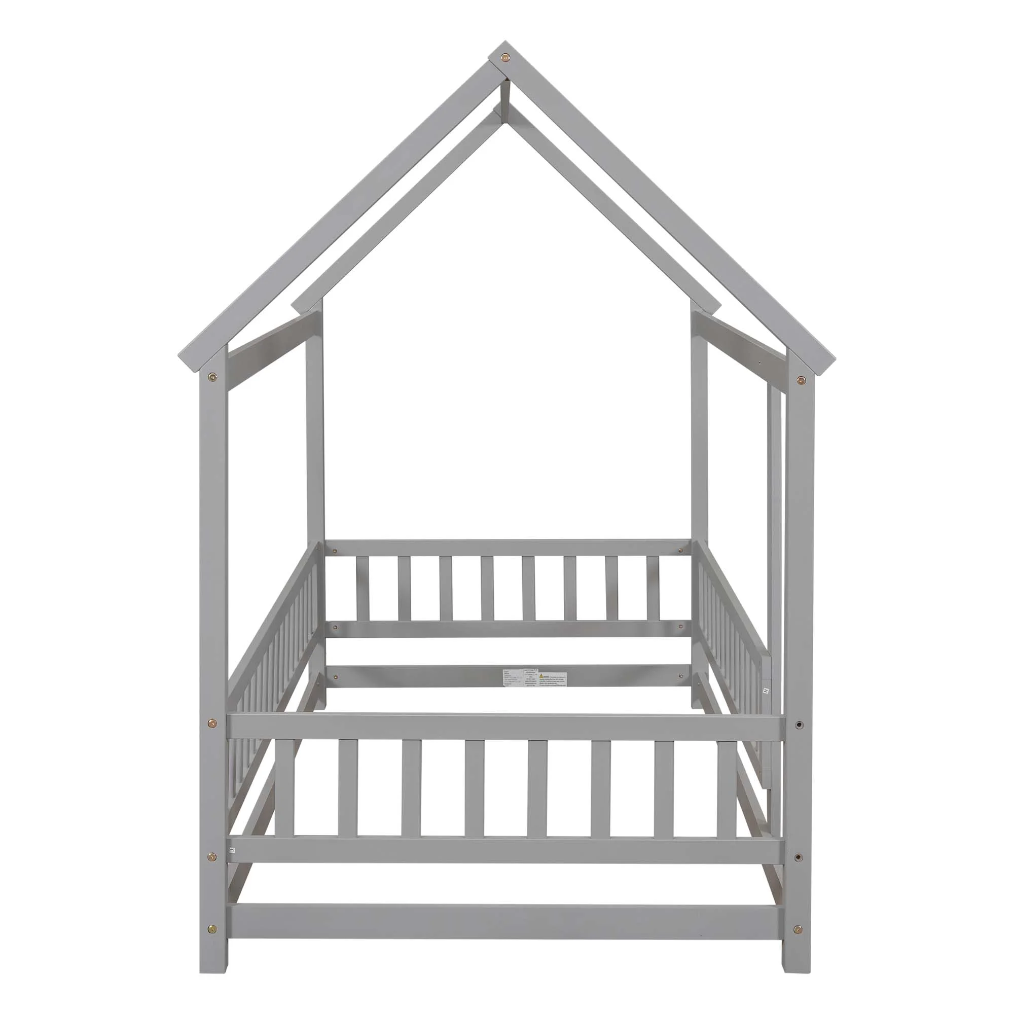 Momspeace Twin Floor Wooden Bed with Fence and Roof for Kids, Child Twin House Bed, Gray