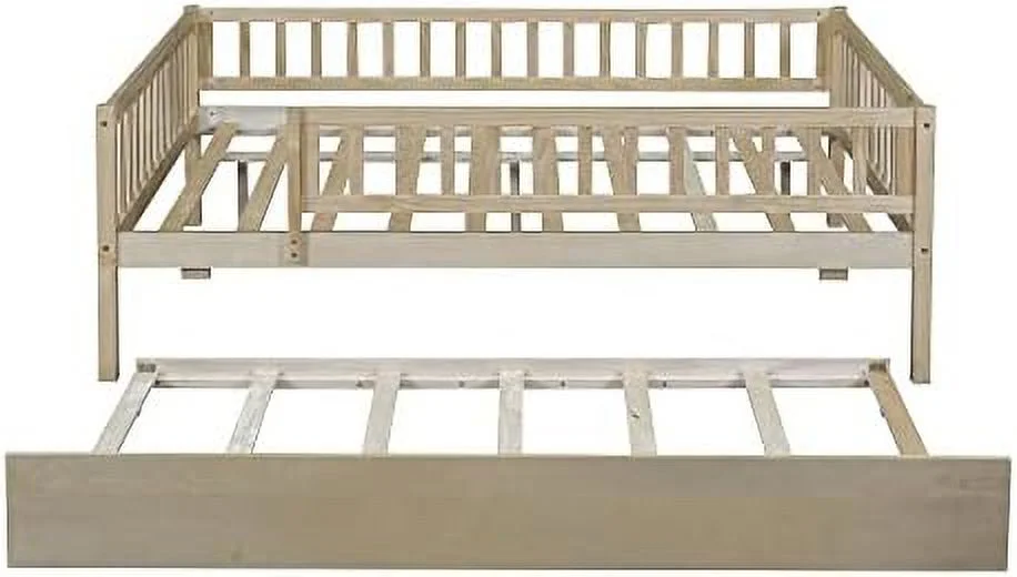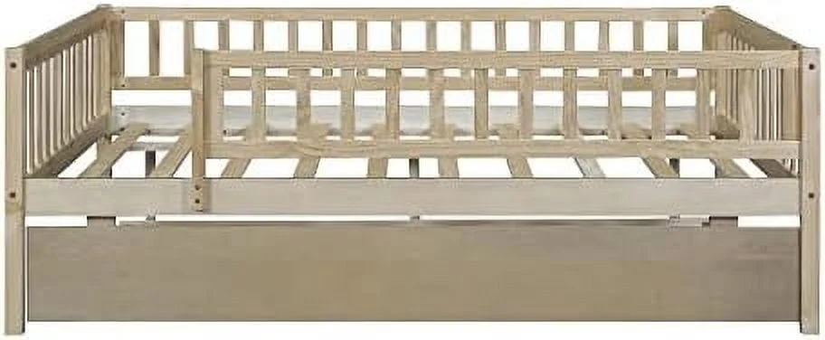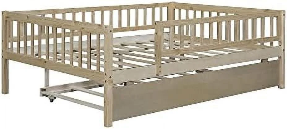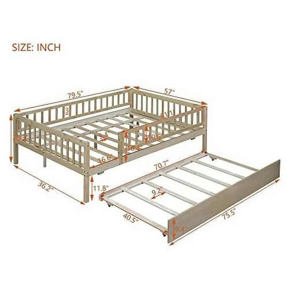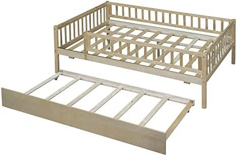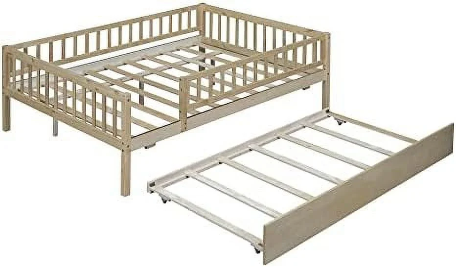 Full Size Daybed With Trundle, Wood Full Bed Frame With Fence Guardrails, No Box Spring Needed, Natural