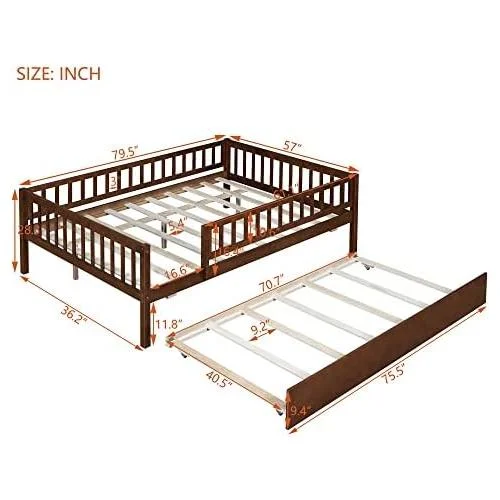 Full Size Daybed With Trundle, Wood Full Bed Frame With Fence Guardrails, No Box Spring Needed, Walnut