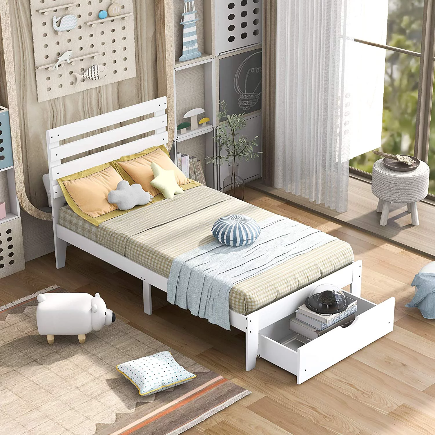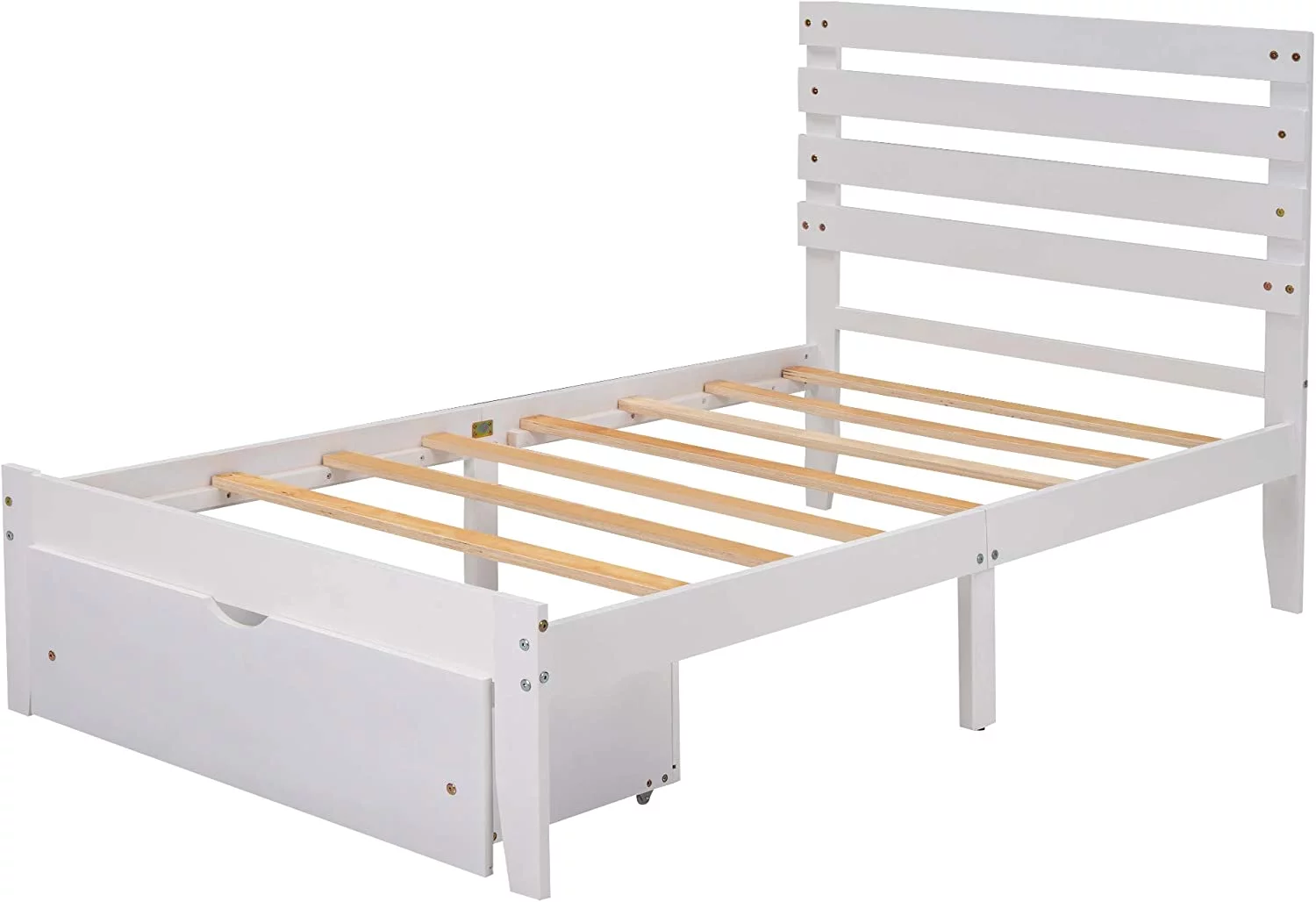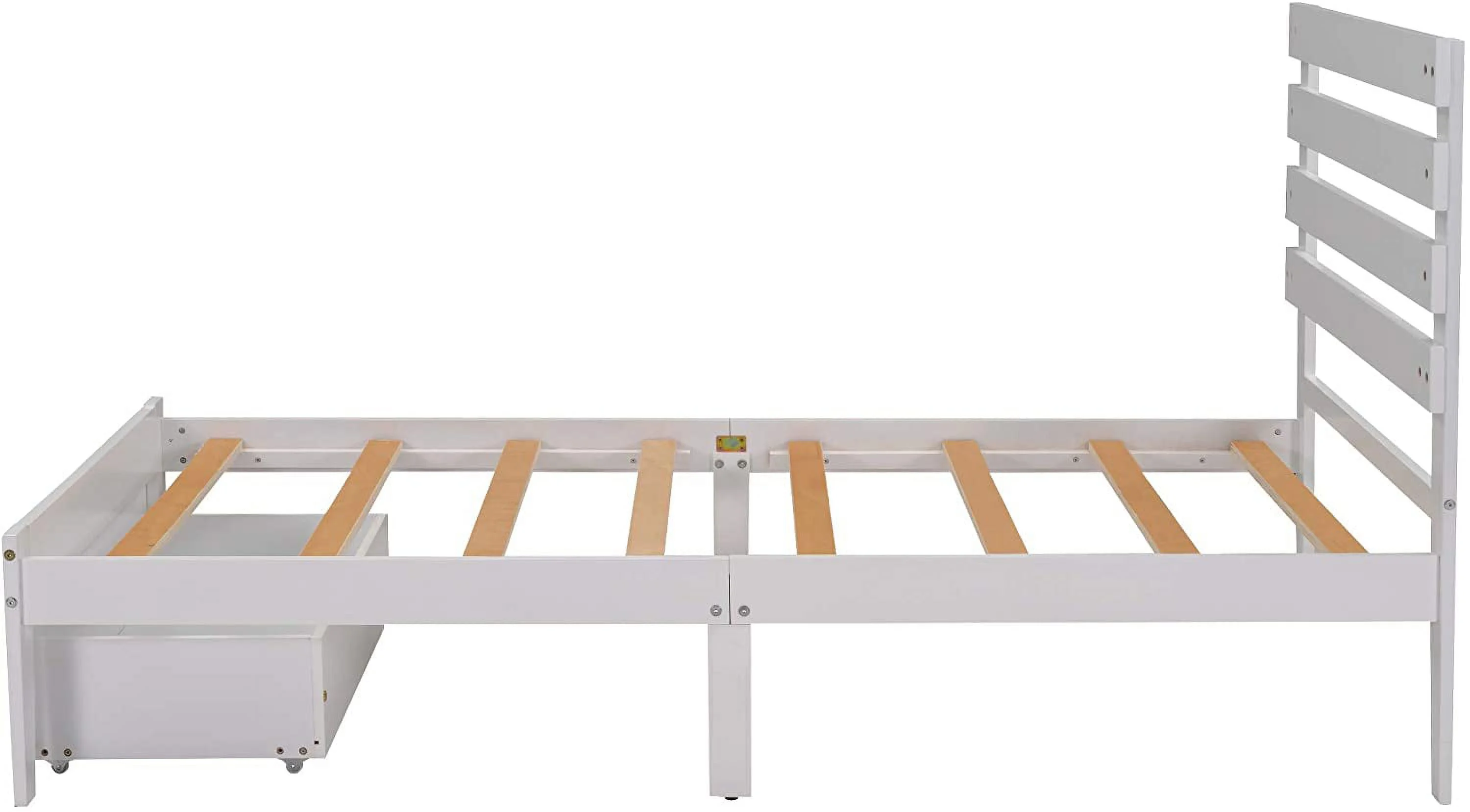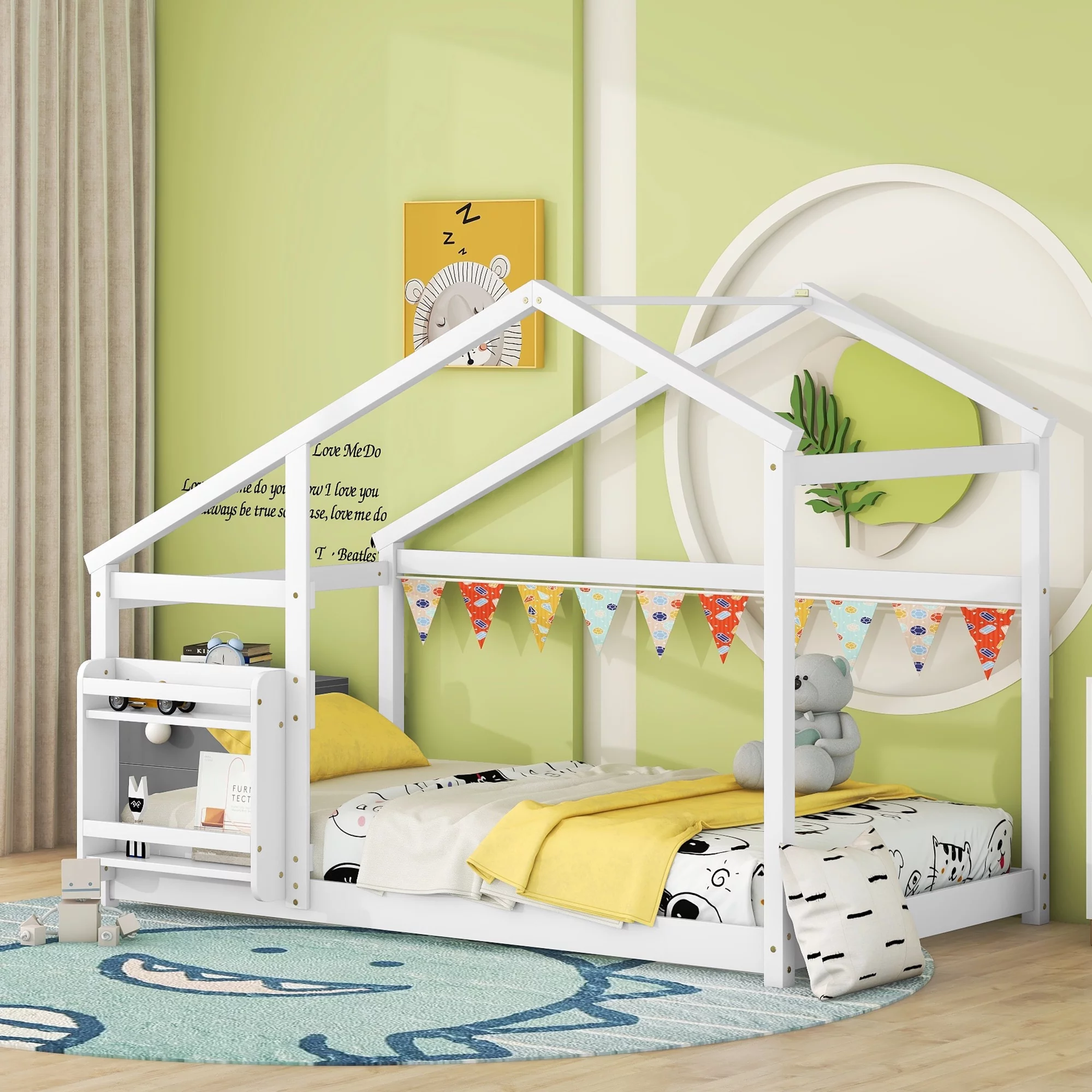 Twin Size Wooden House Floor Bed with Shelf - No Box Spring Needed, Toddler and Baby Bed Frame-White
