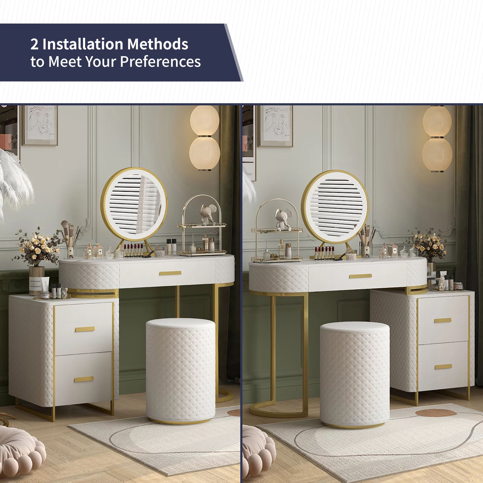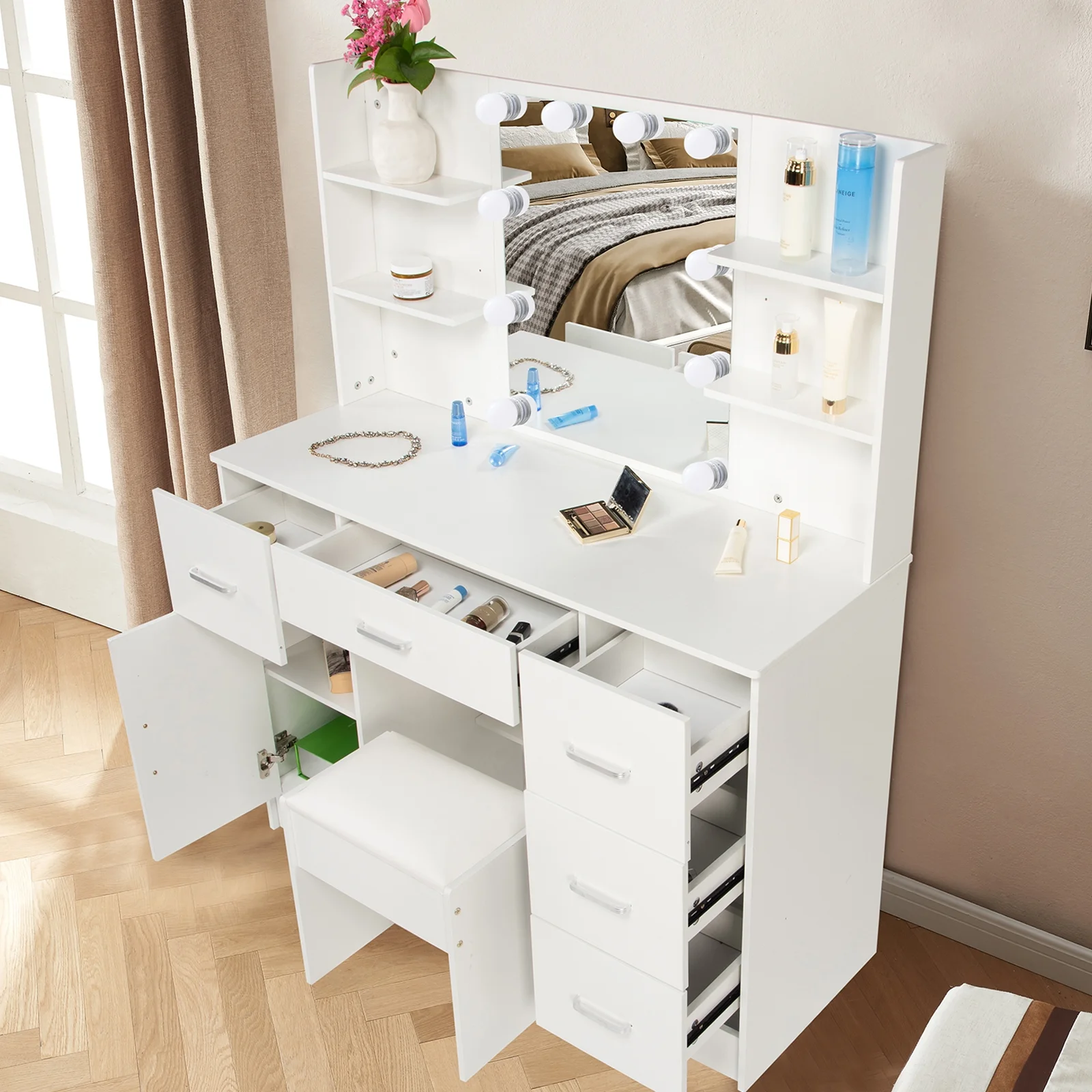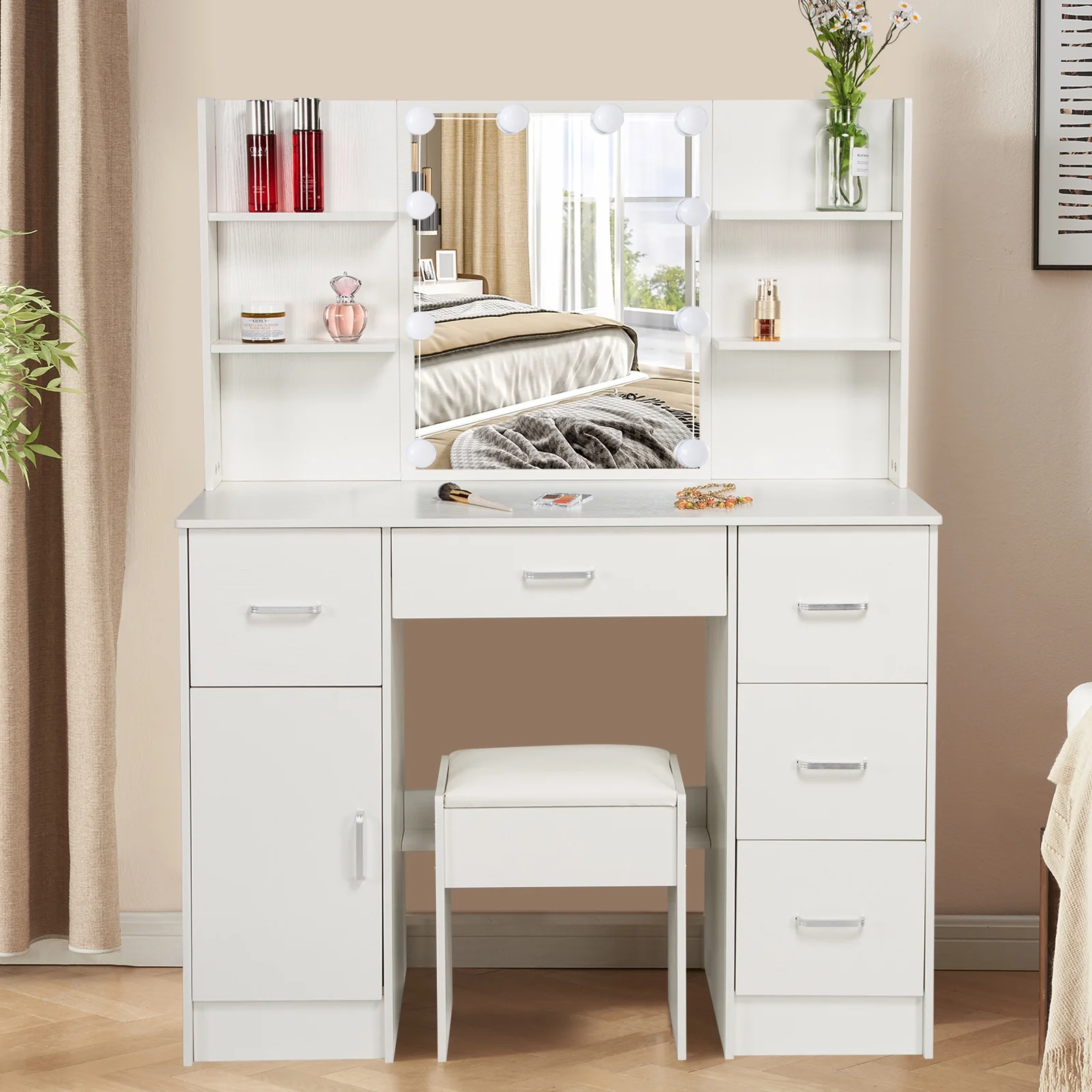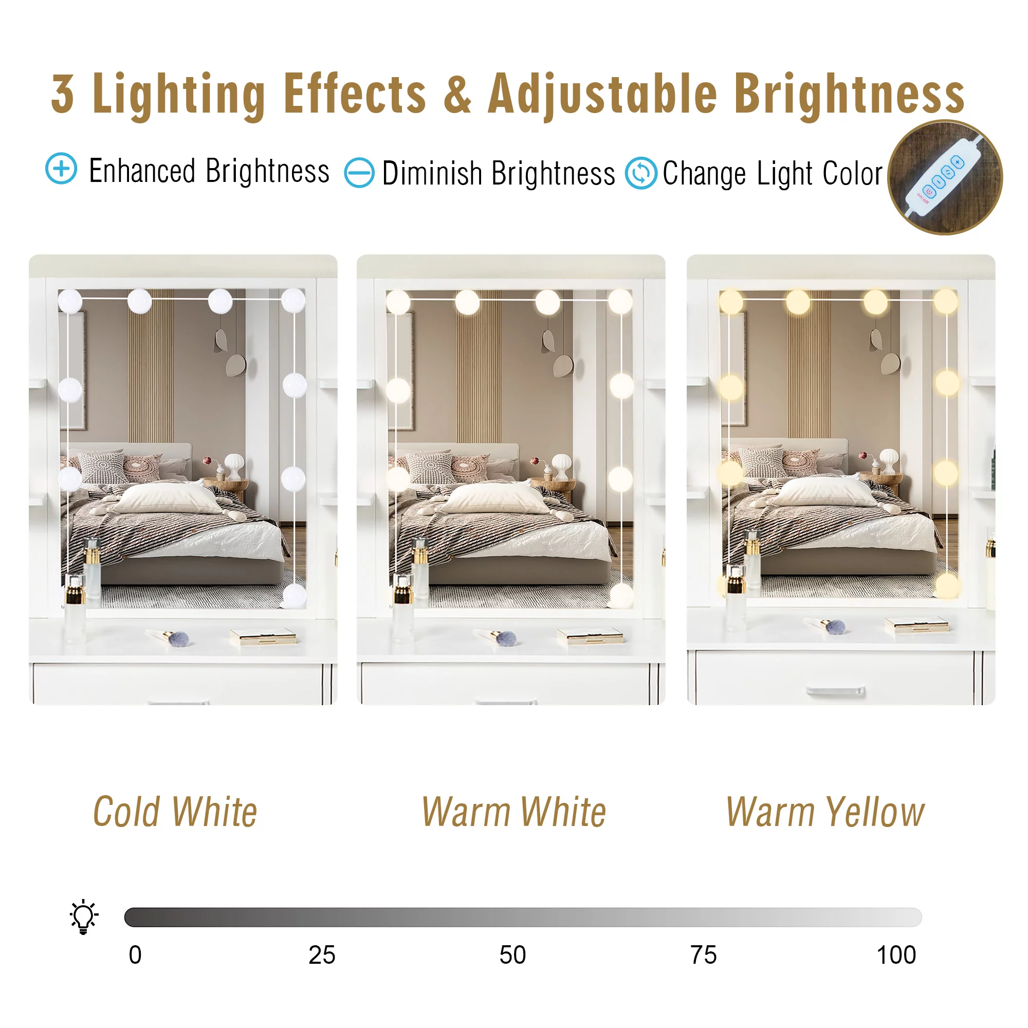 Afuhokles Vanity Desk with Mirror and Lights, Makeup Vanity with Charging Station and Dresser, White
