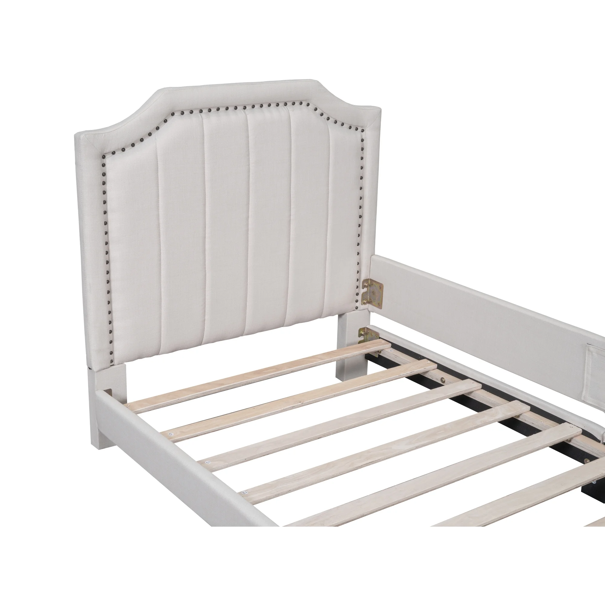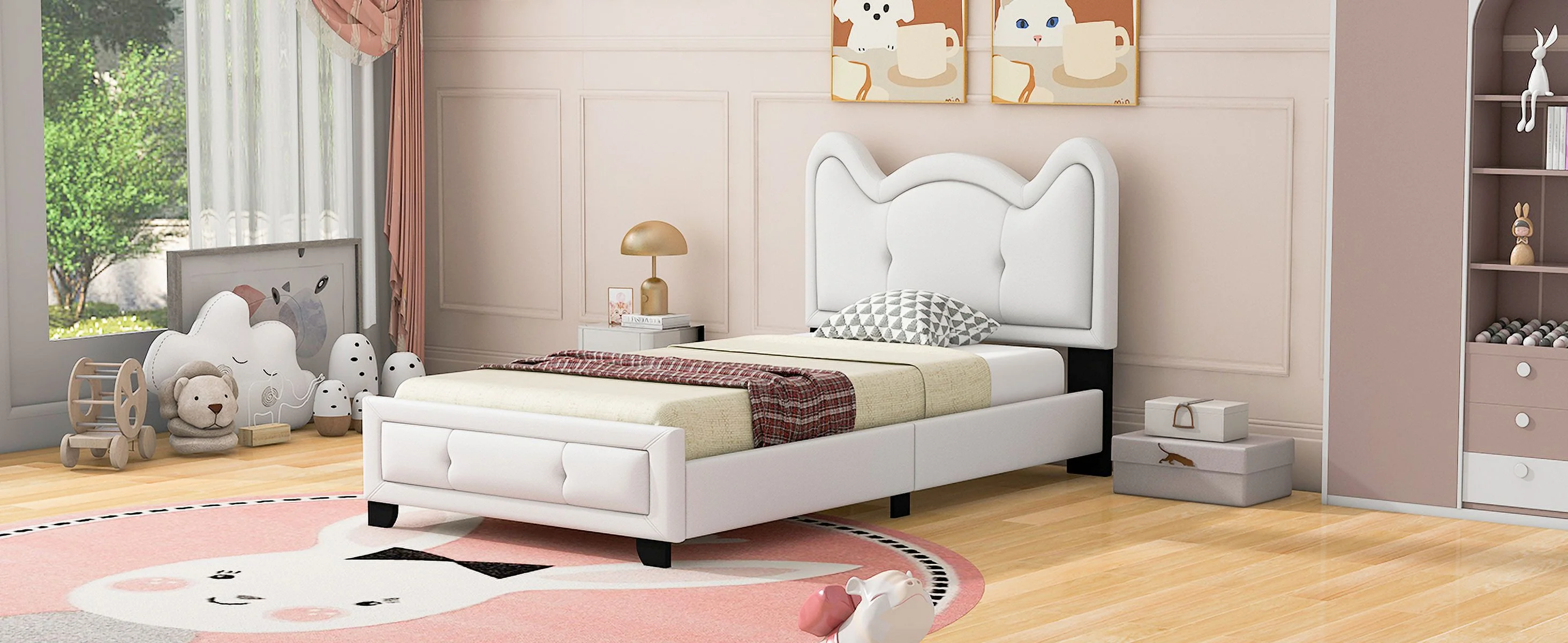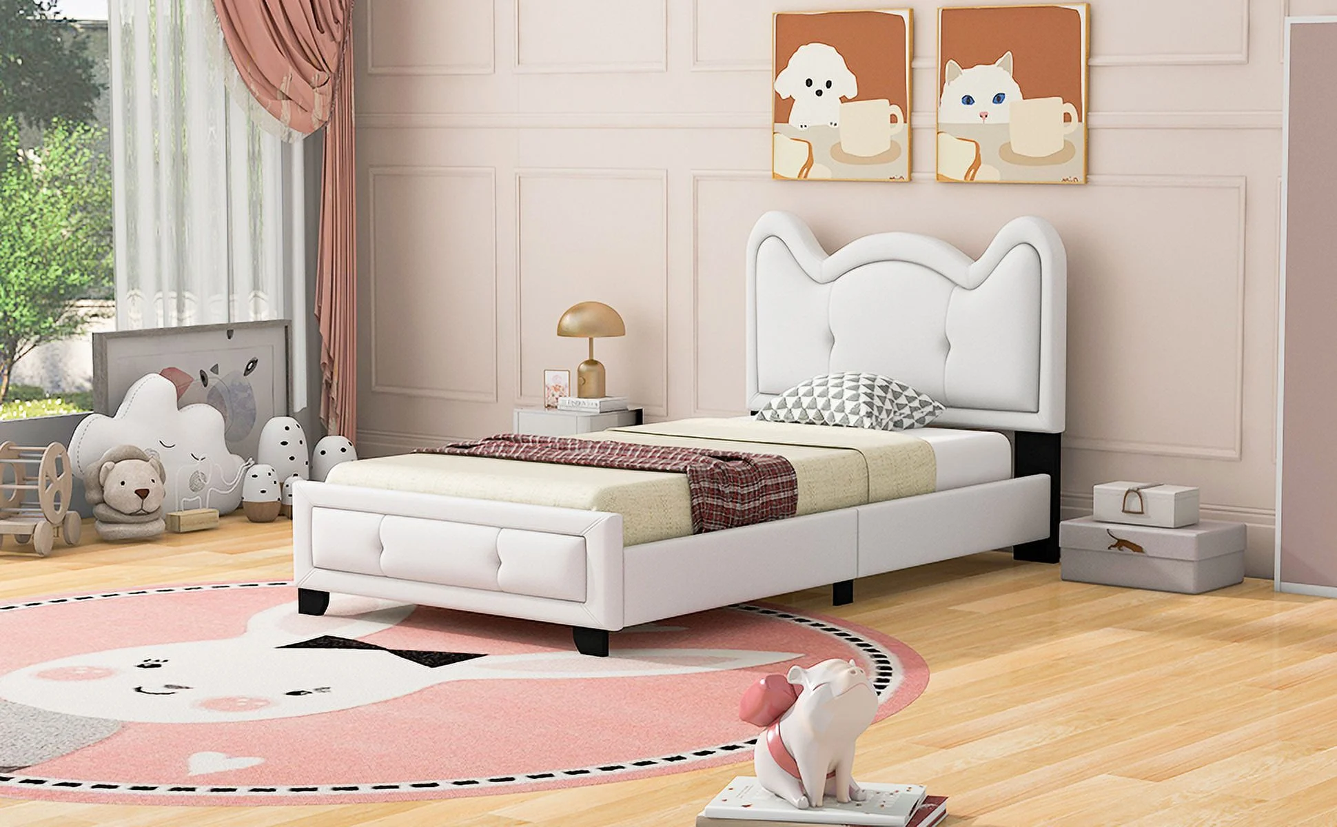 Upholstered Twin Bed Frame with Playful Carton Ears Shaped Headboard - Modern Platform Bed for Comfort and Style-White