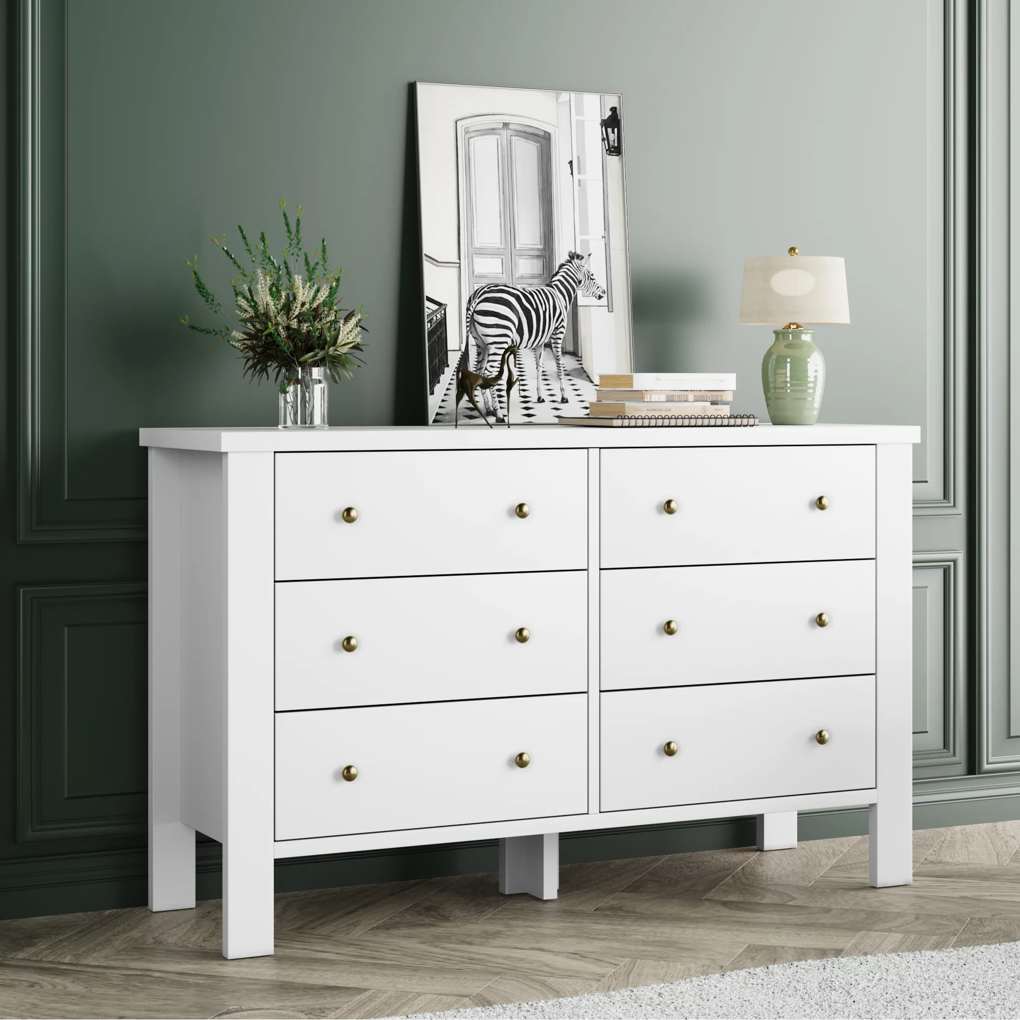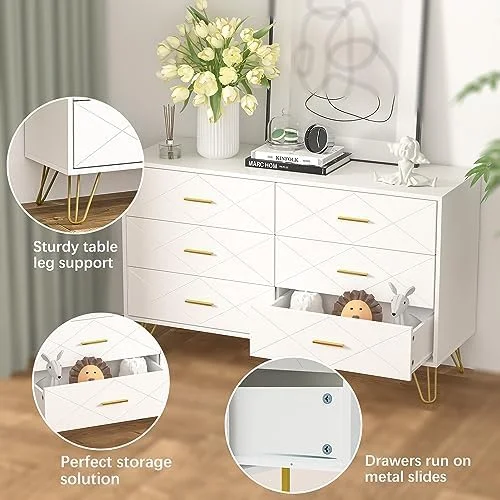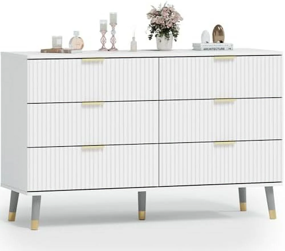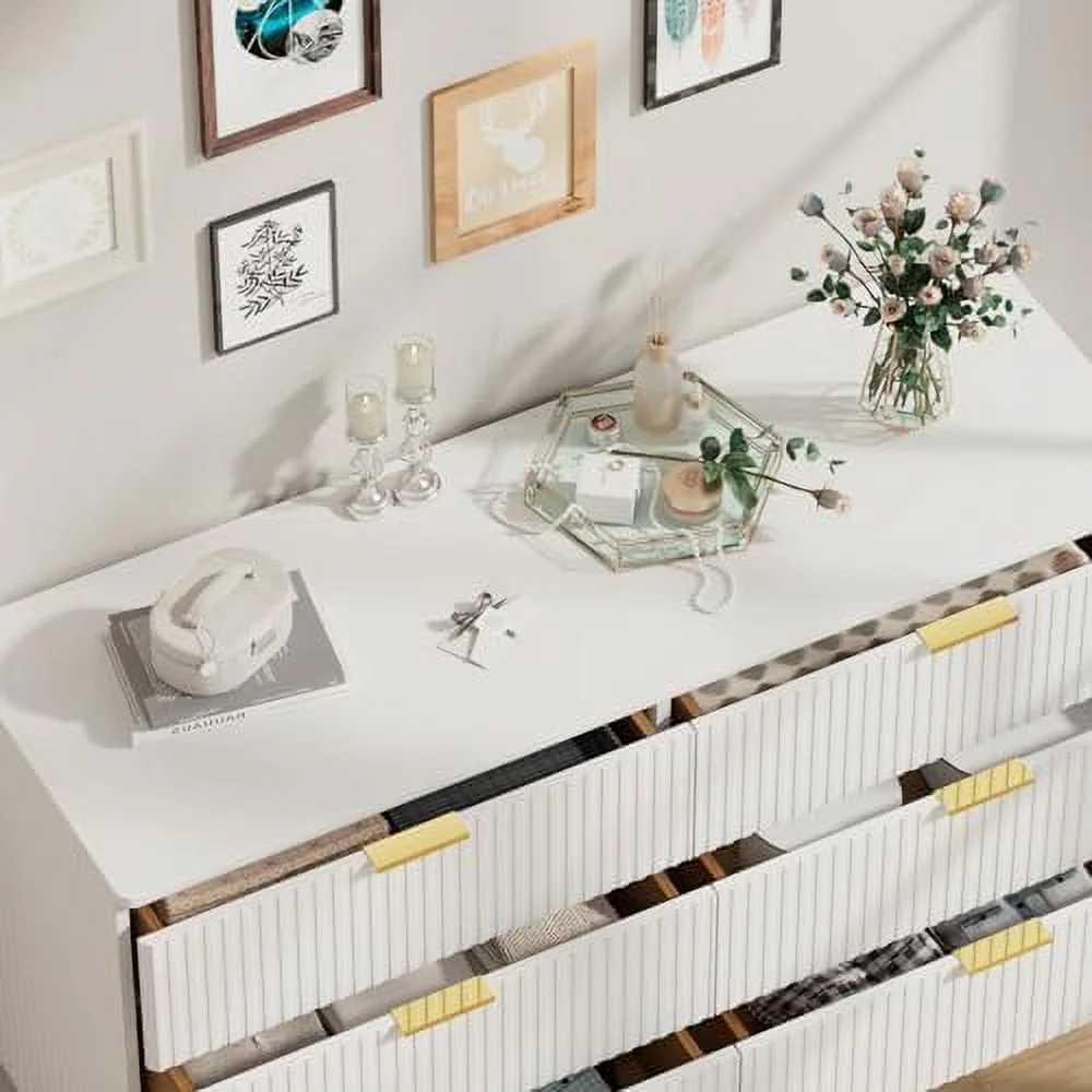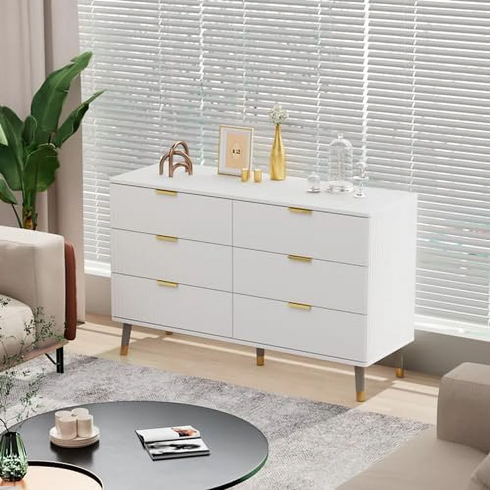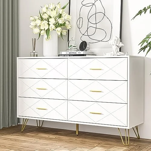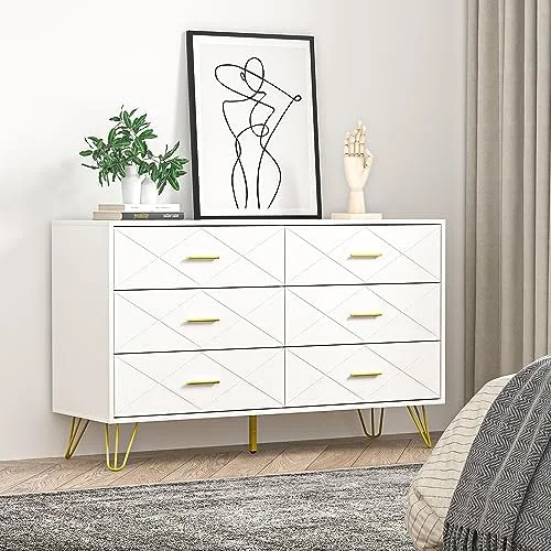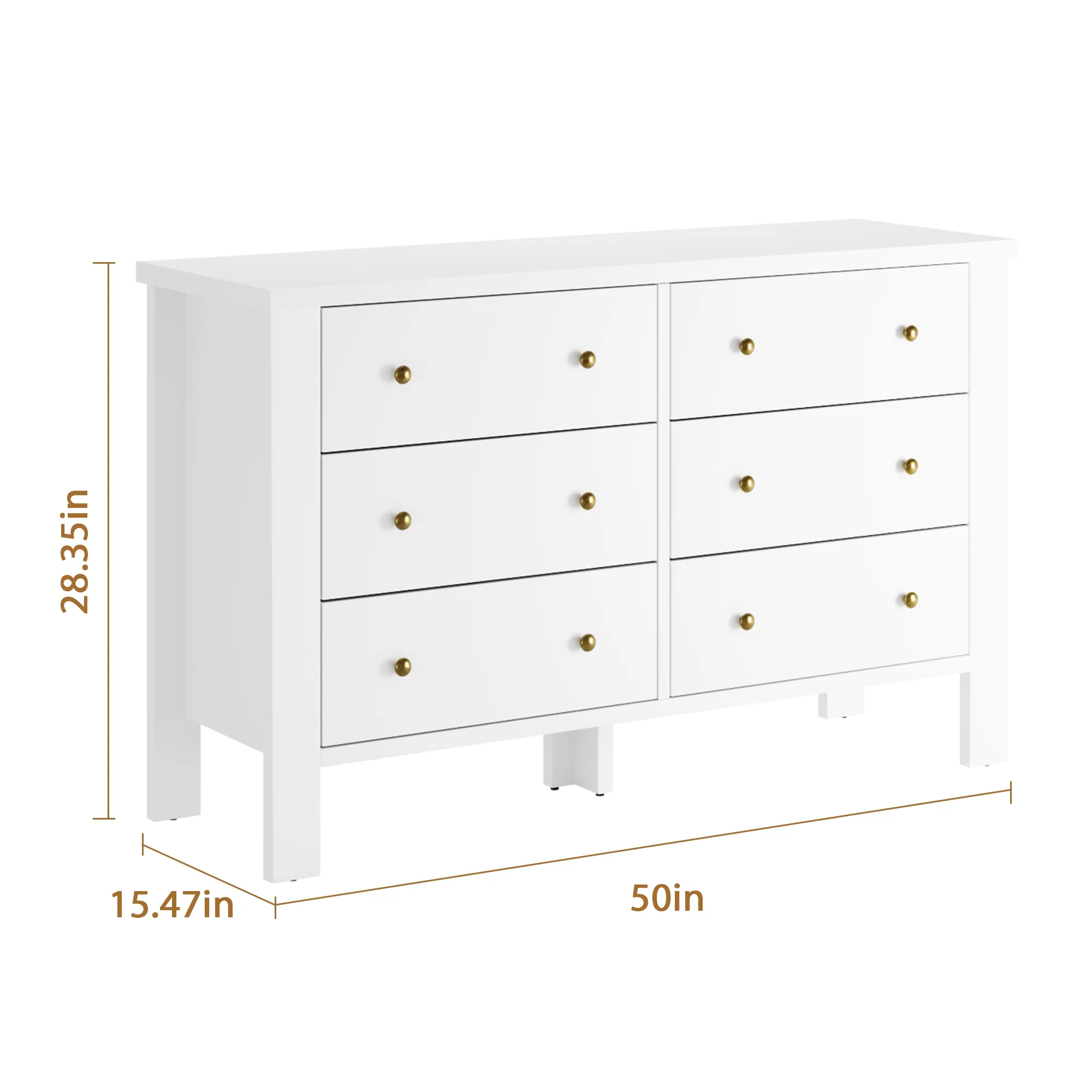 KHBIULIFE White Dresser for Bedroom Dresser with 6 Deep Drawers Wide Chest of Drawers with Gold Handles for Living Room