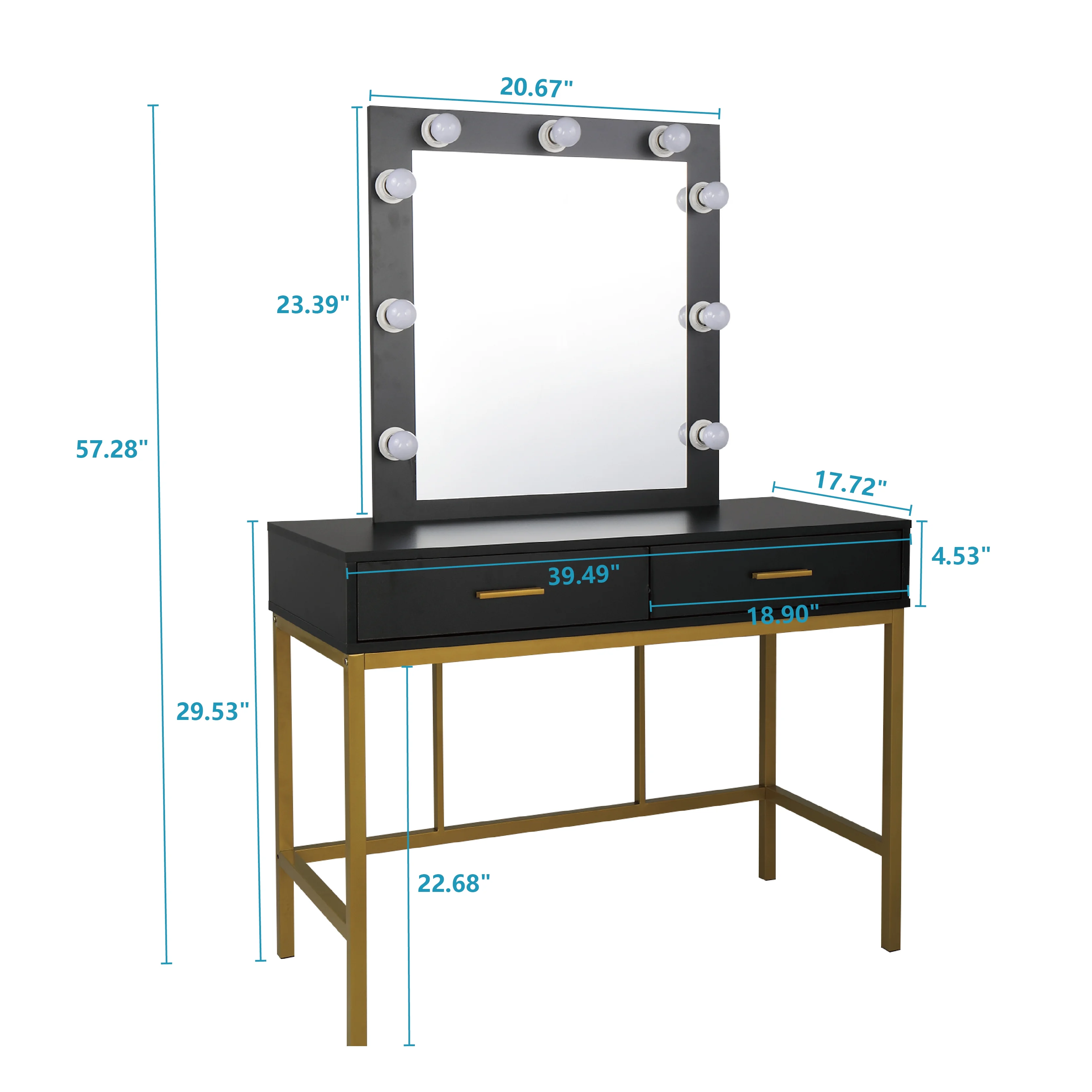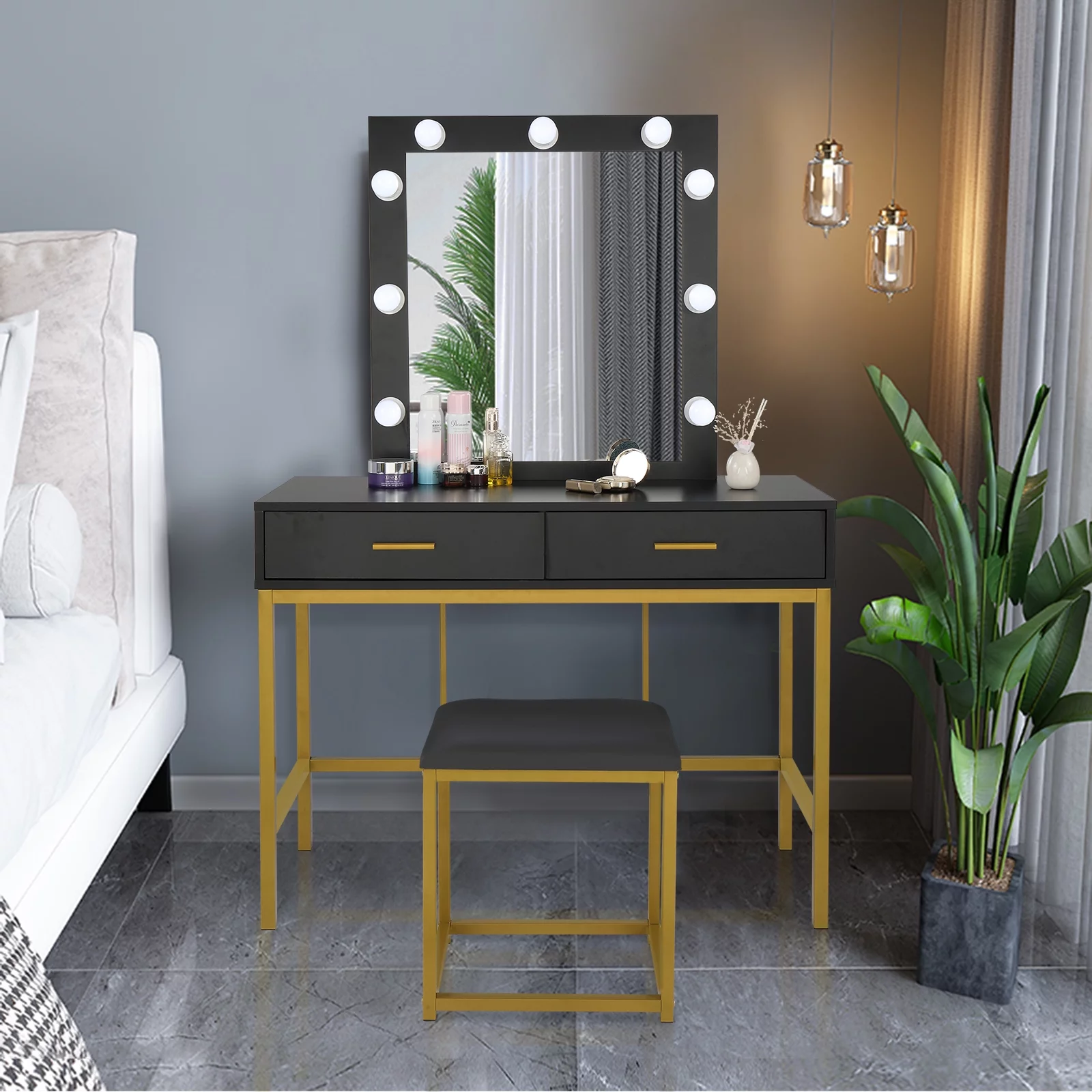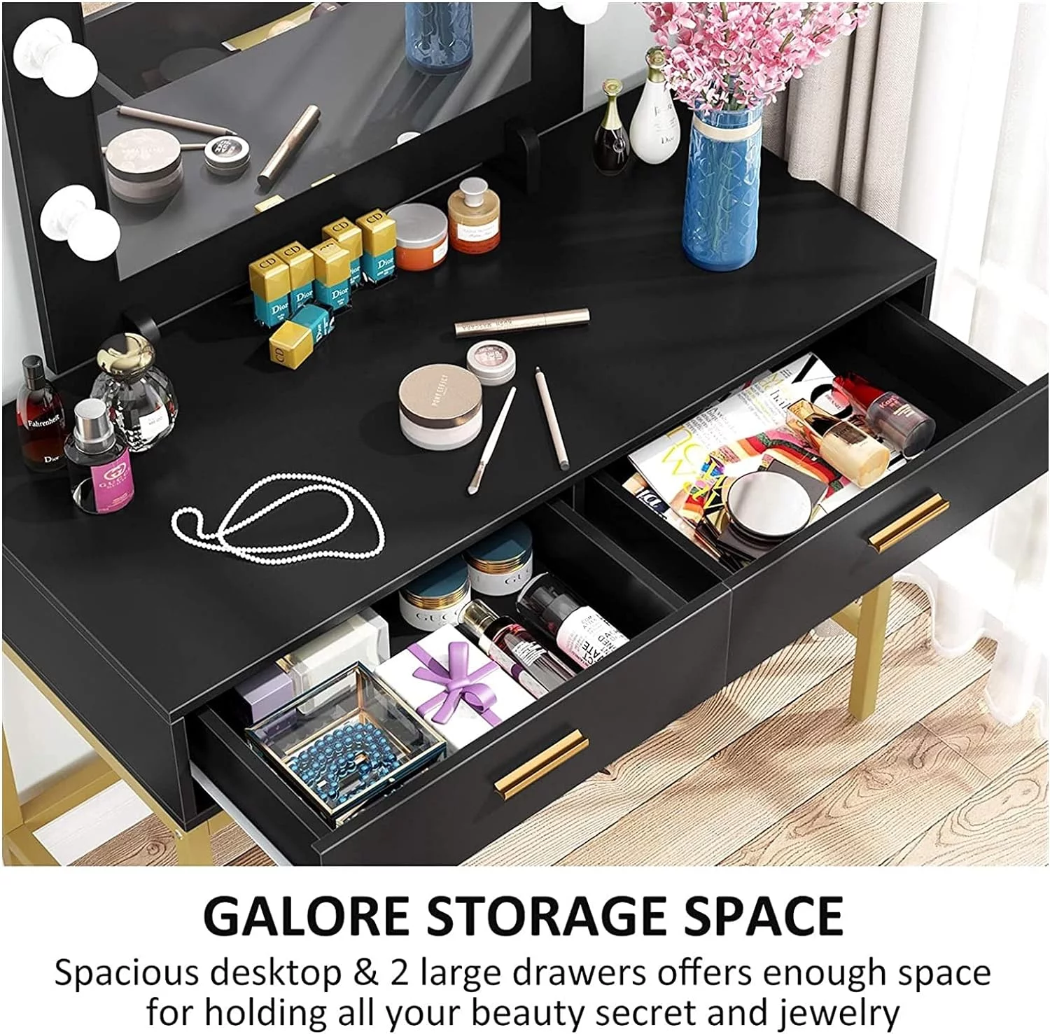 Glavbiku Modern Makeup Vanity Table with 2 Drawer 9 Light Mirror Dresser Set for Bedroom Black,Adult