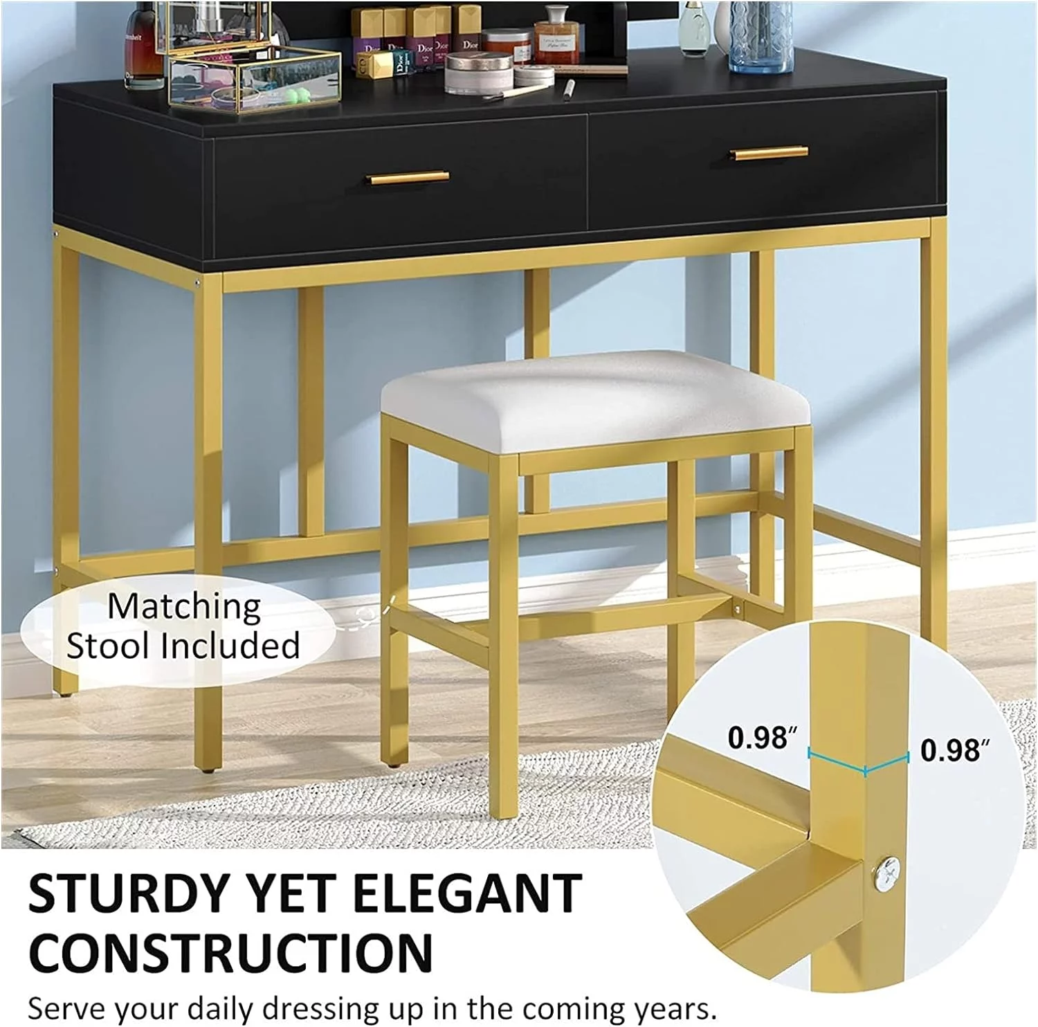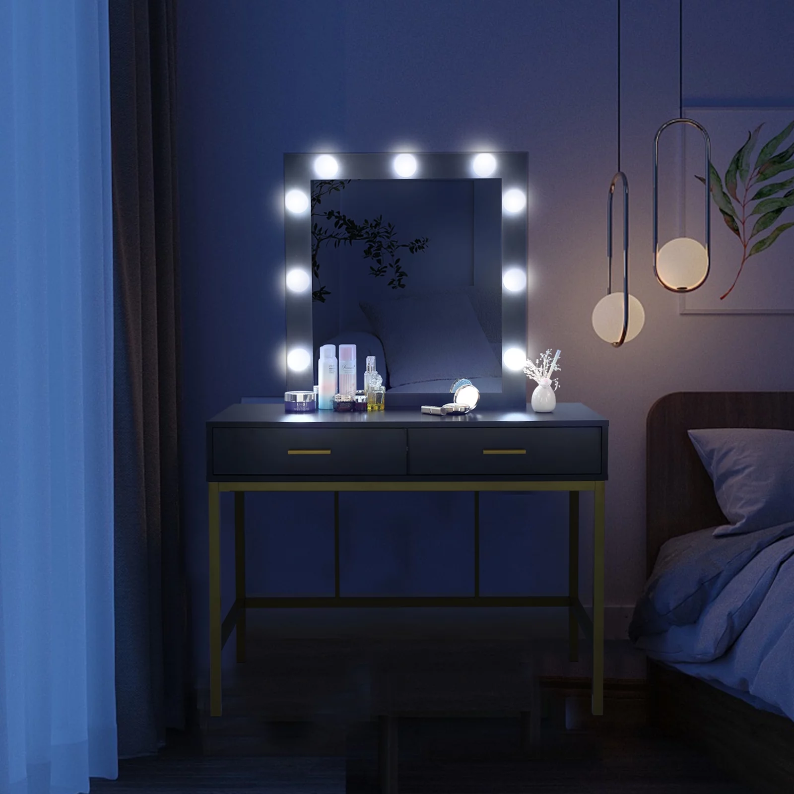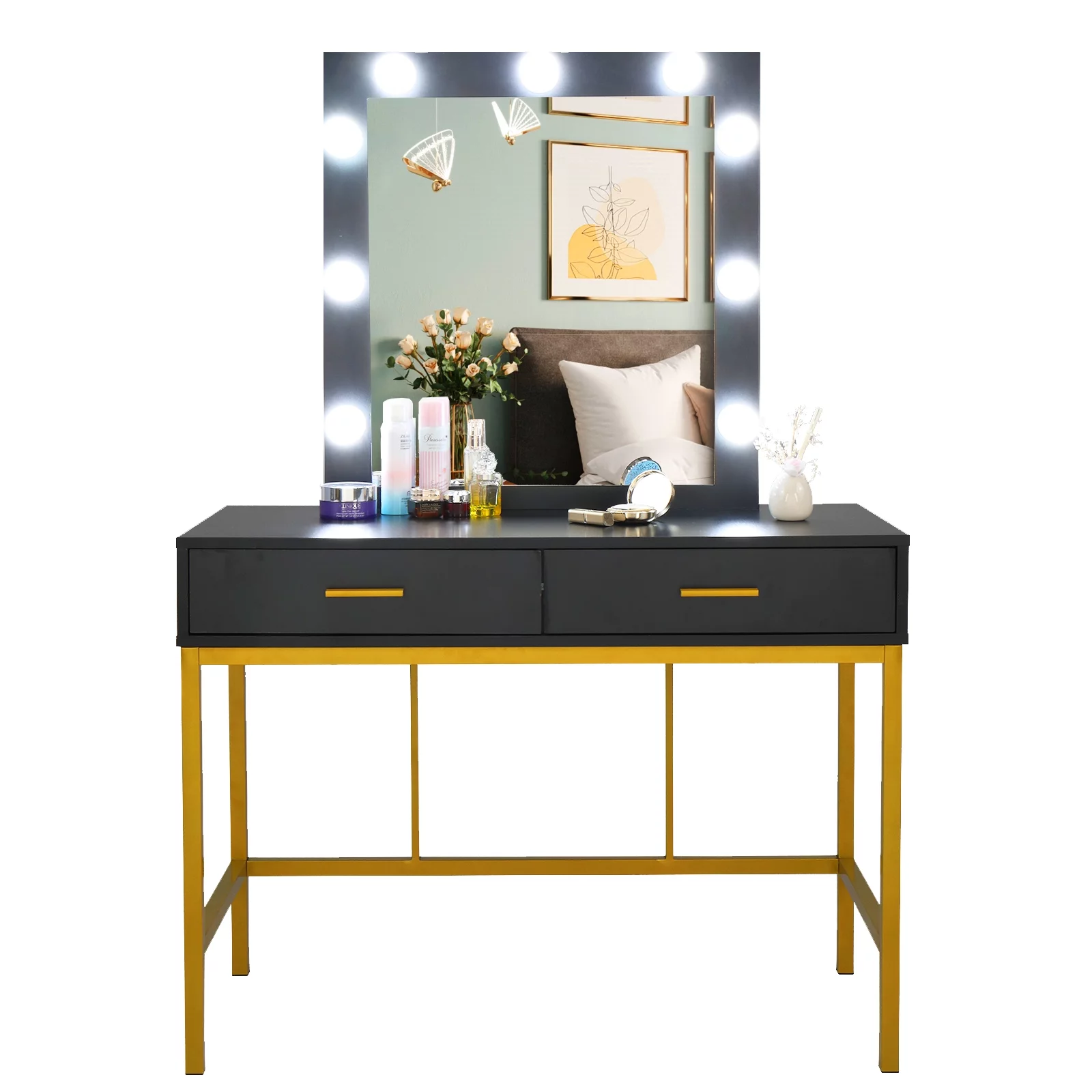 Glavbiku Modern Makeup Vanity Table with 2 Drawer 9 Light Mirror Dresser Set for Bedroom Black,Adult