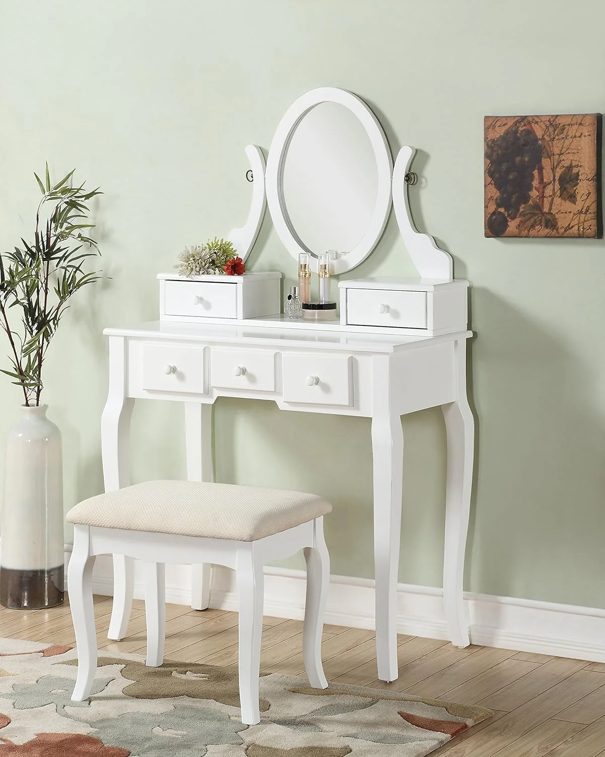 RUNFAYBIU 3-Piece Wood Make-Up Mirror Vanity Dresser Table and Stool Set White