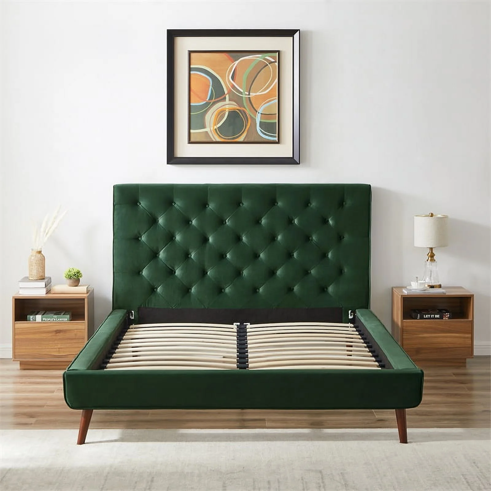 Pemberly Row Mid-Century Velvet Upholstered Platform Bed Queen Size in Green