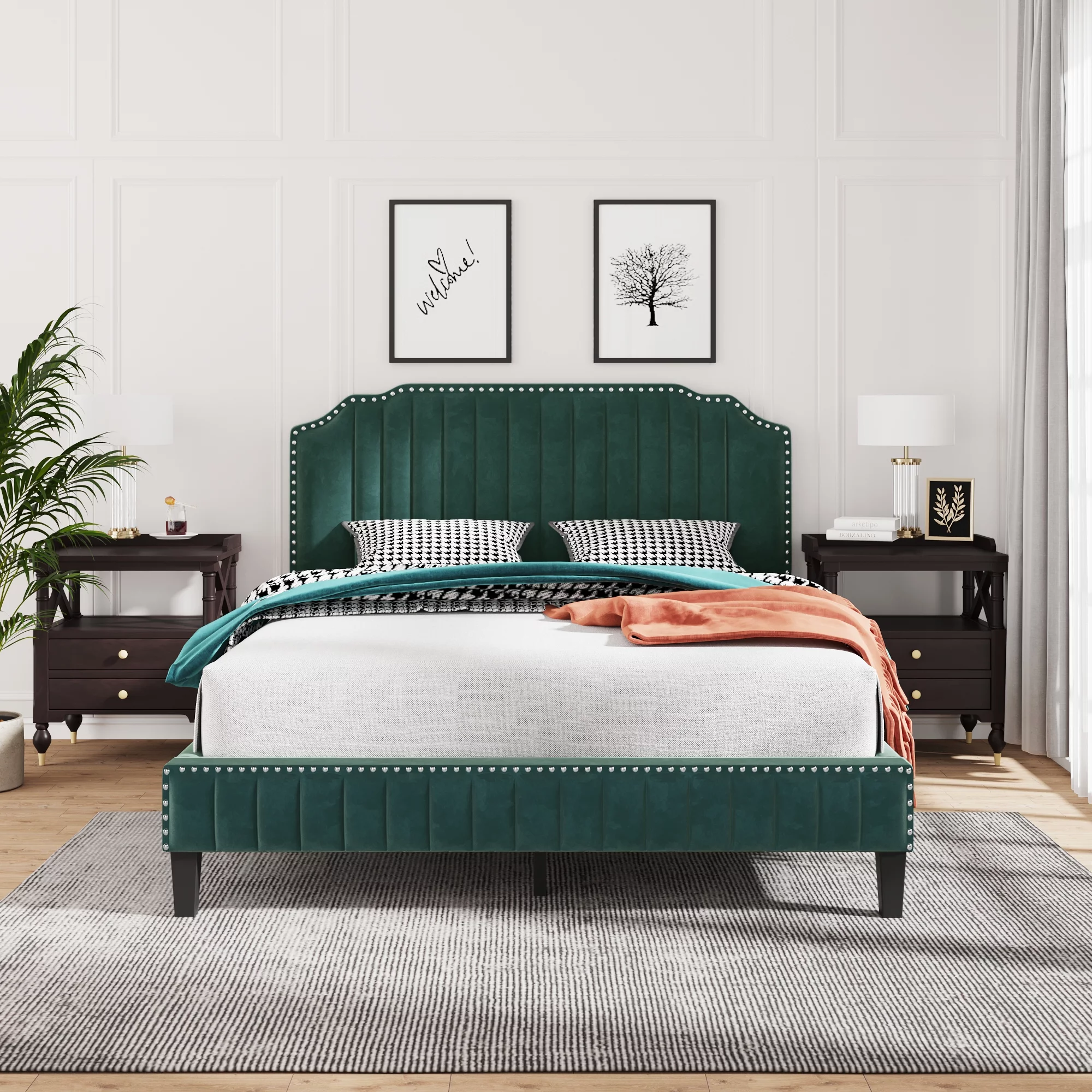 LYPER Modern Velvet Curved Upholstered Platform Bed , Solid Wood Frame , Nailhead Trim, Green(Queen)