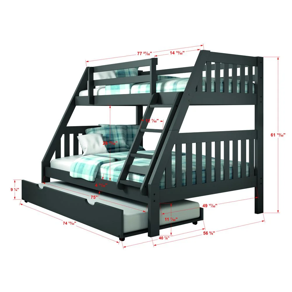 Twin Over Full Mission Bunk Bed with Twin Trundle in Dark Gray Finish