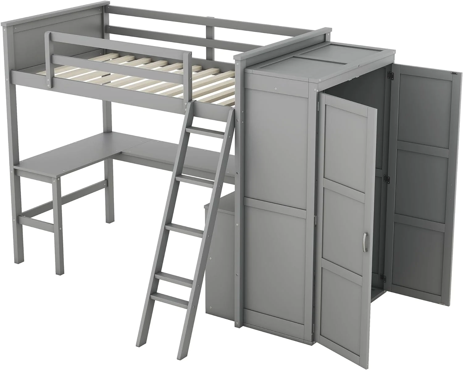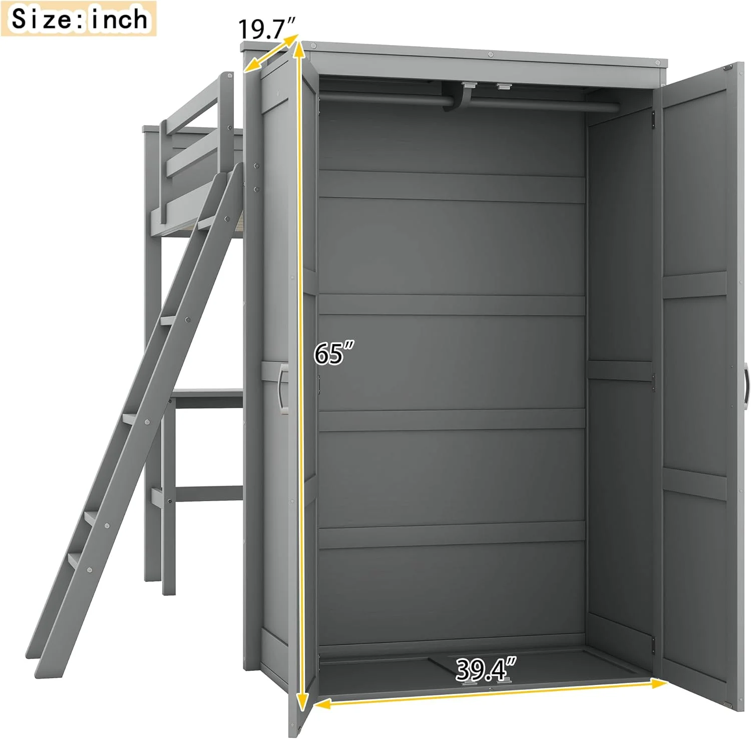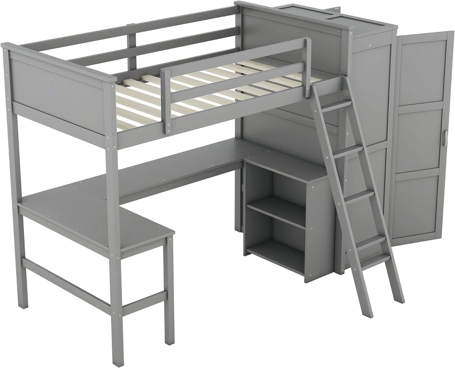 Size Lof Bed Wih Desk Ad Wardrobe, Woode High Lof Beds Frame Wih Sorage Shelves & Close For Kids,ees,Aduls,Gray