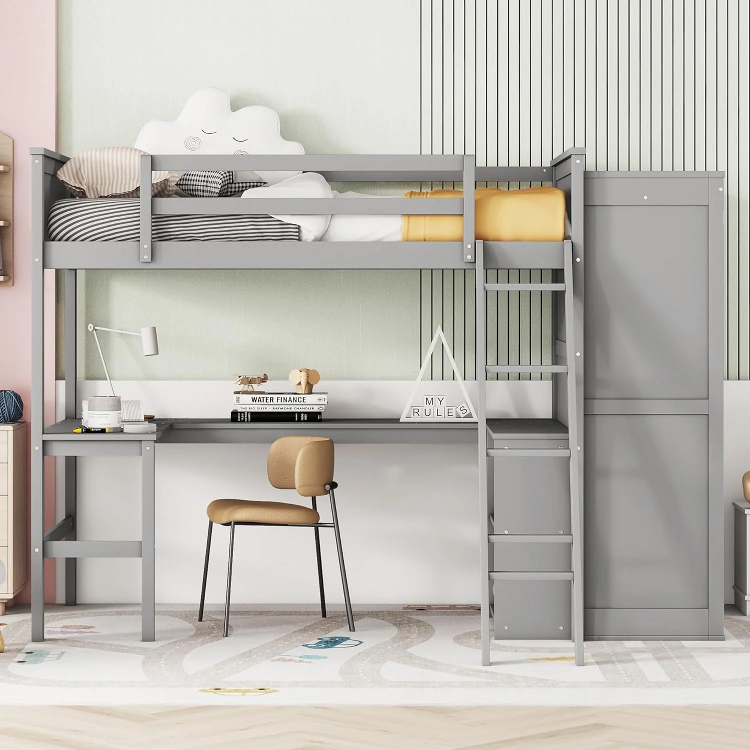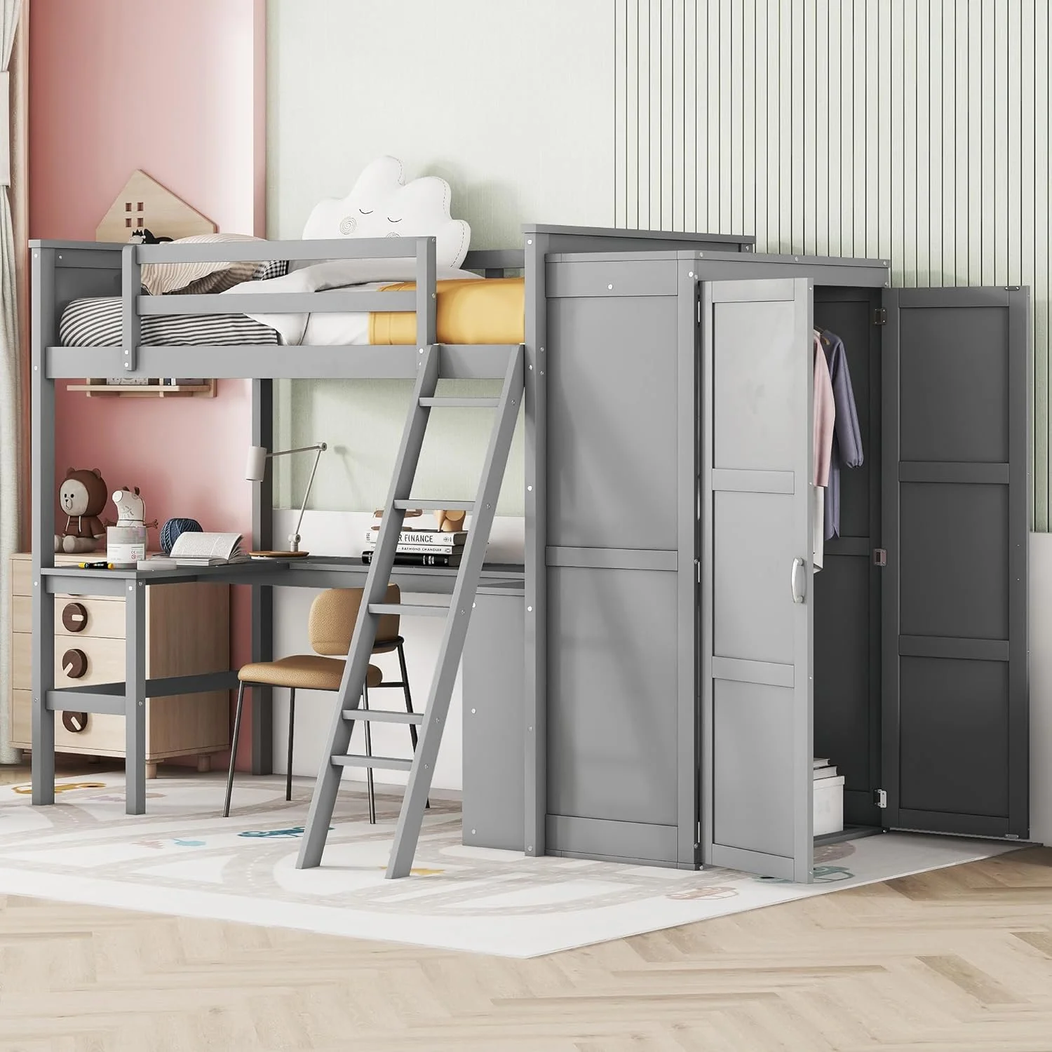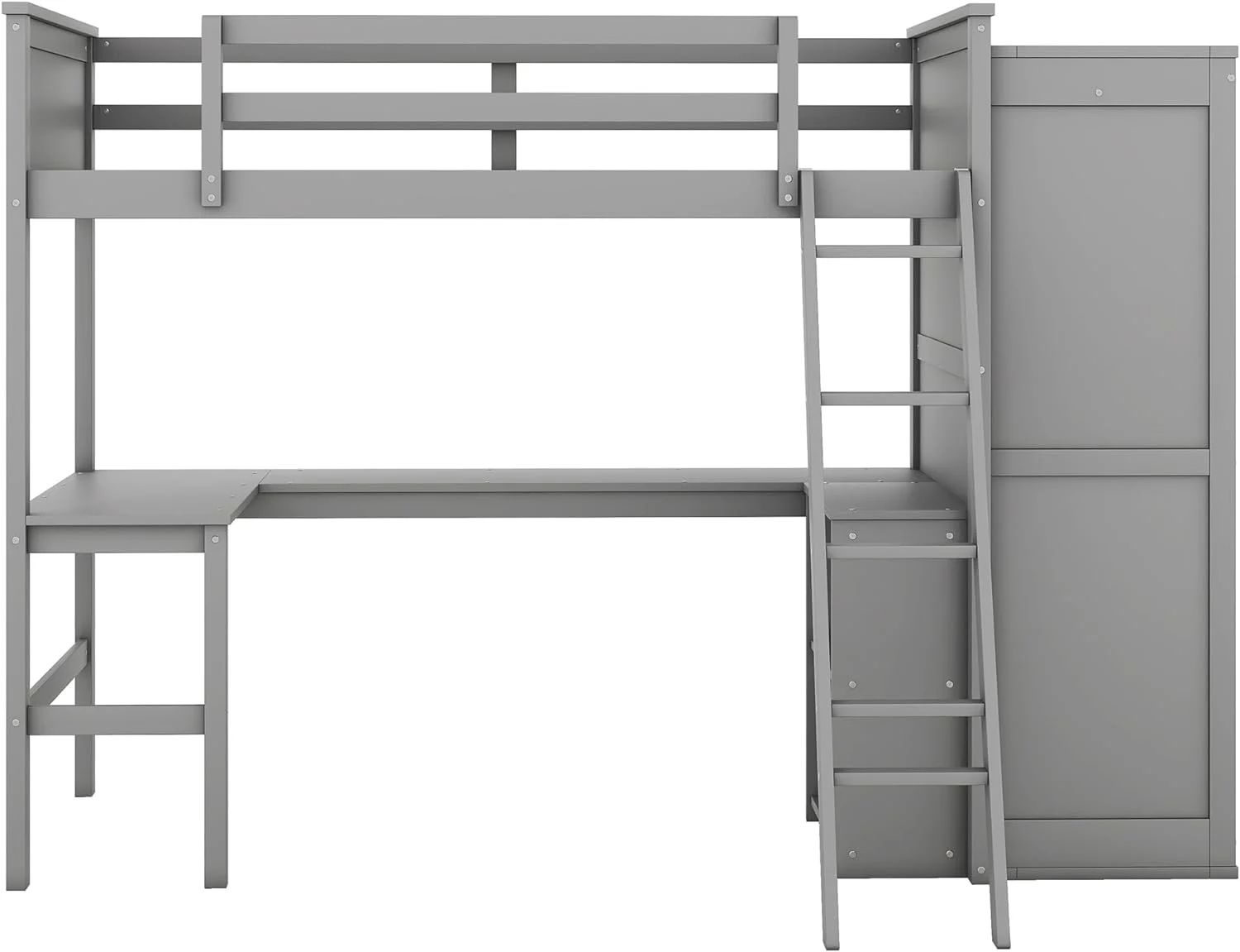 Size Lof Bed Wih Desk Ad Wardrobe, Woode High Lof Beds Frame Wih Sorage Shelves & Close For Kids,ees,Aduls,Gray