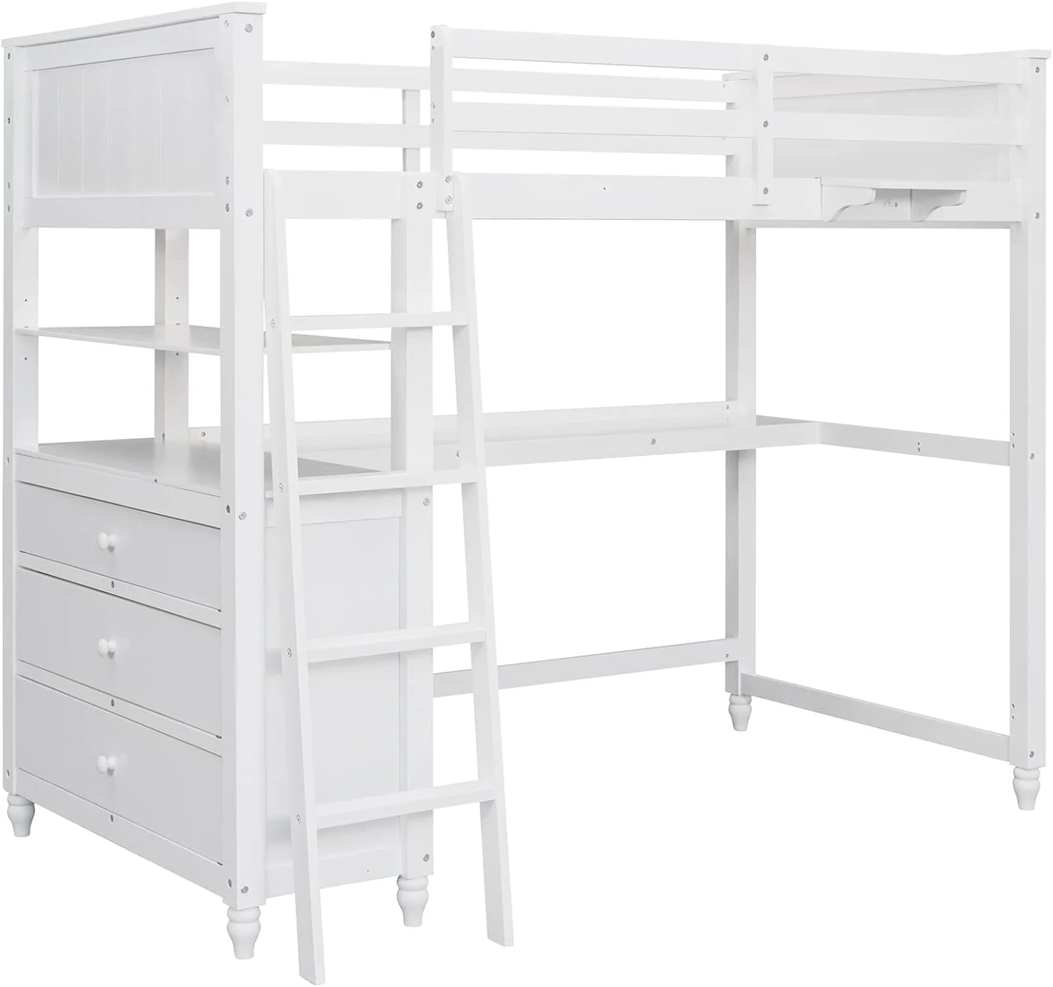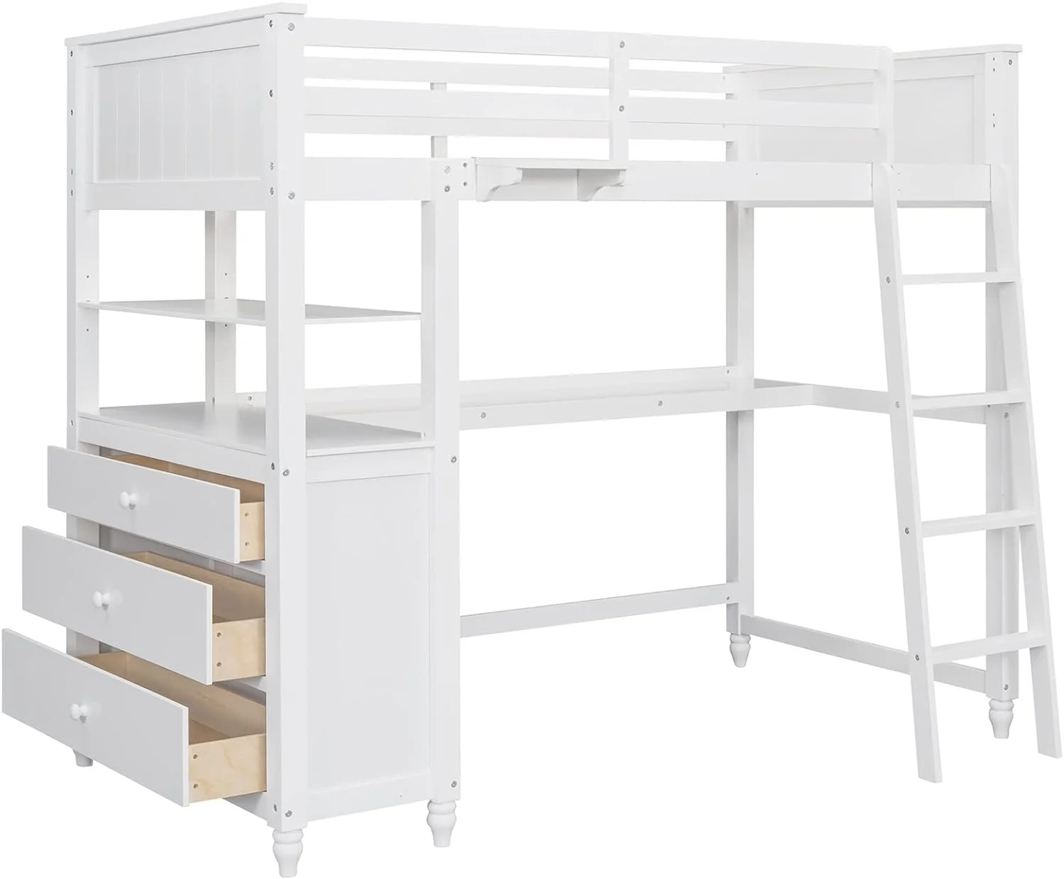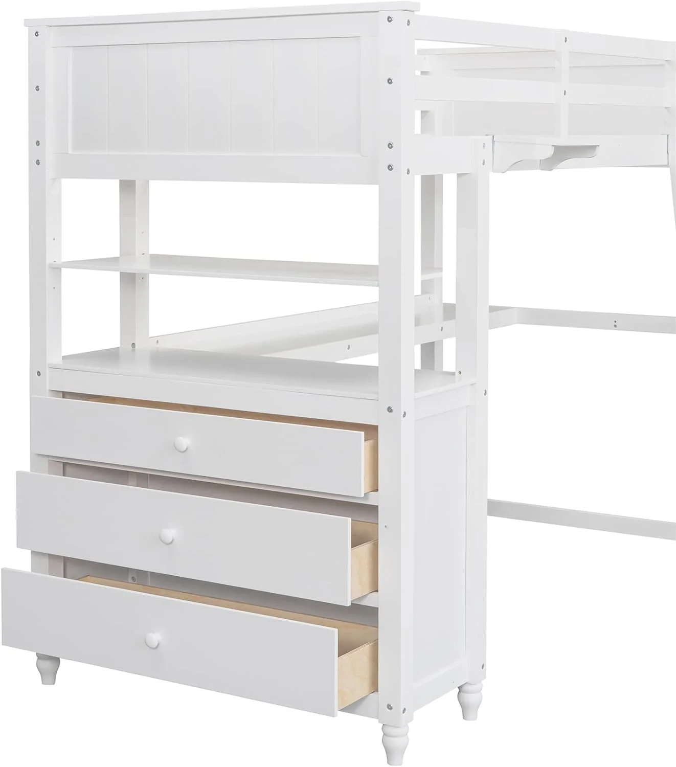 Lof Bed Wih Desk Ad Sorage Drawers Wood High Lof Beds Frame Kids Boys Girls ees, Whie