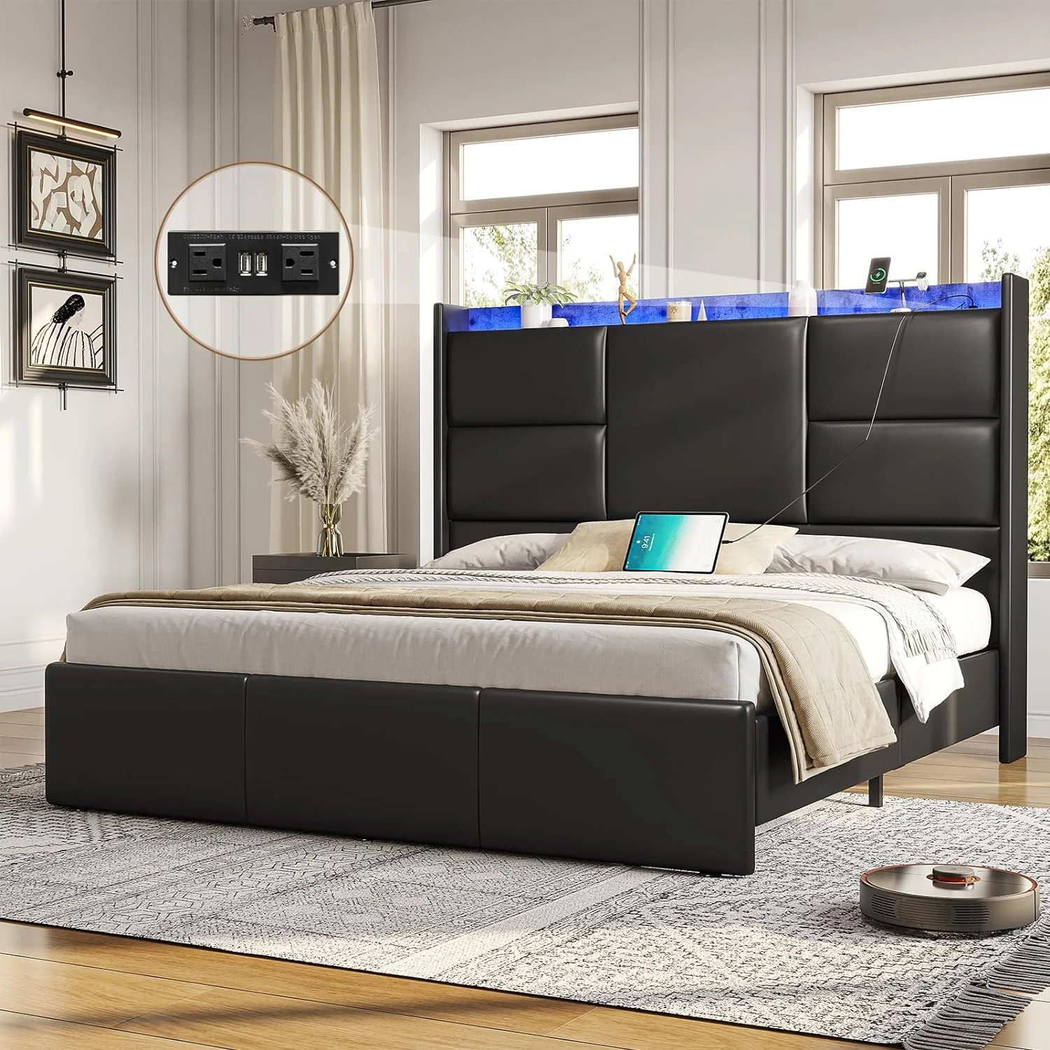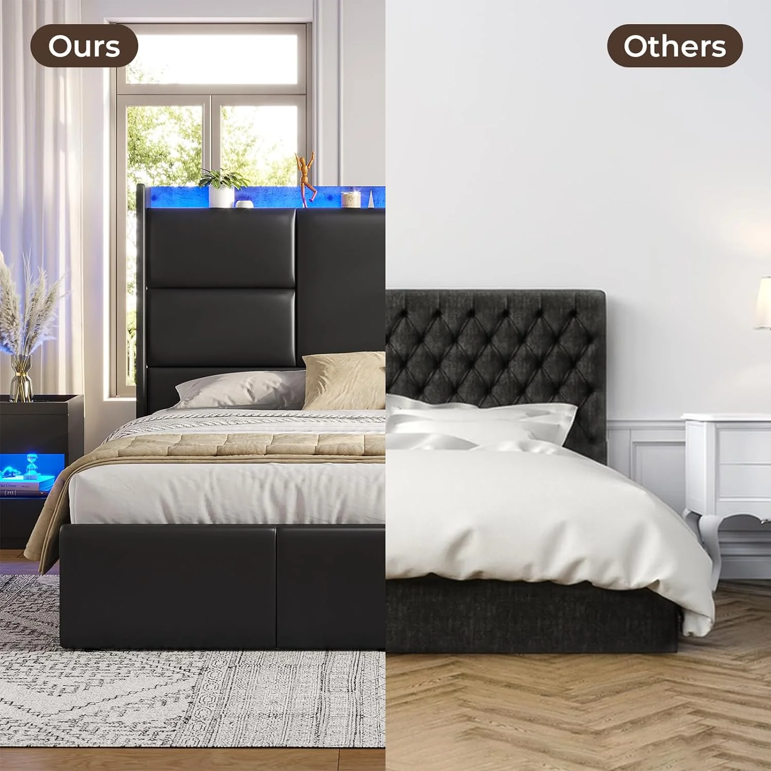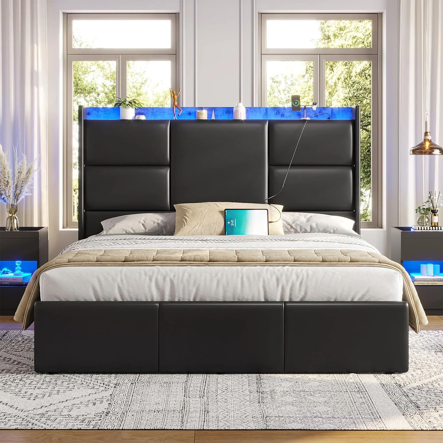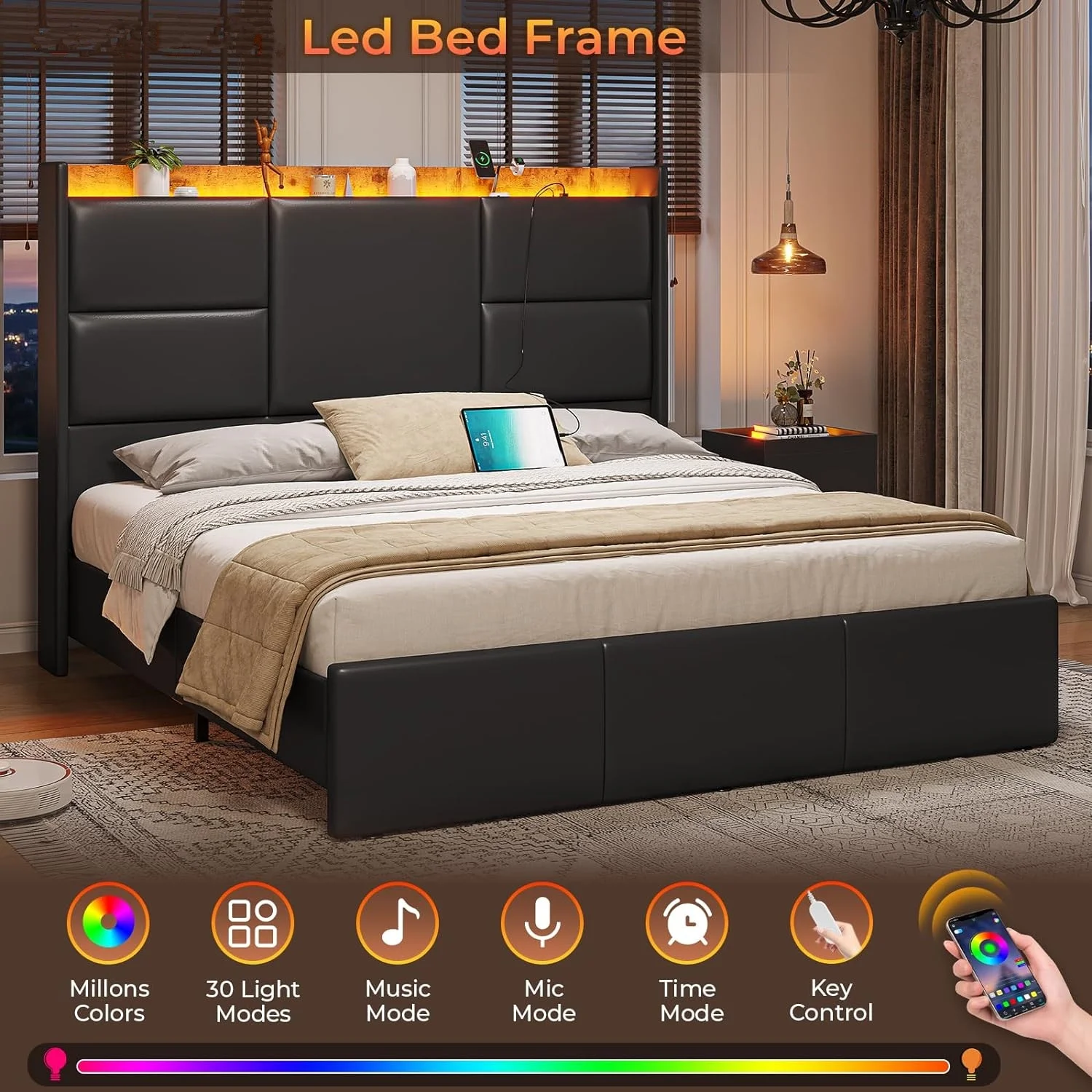 Modern 4pc Est King Size Upholstered LED Headboard Bed Dresser LED Lighting Mirror Nightstand Wooden Bedroom Furniture Set
