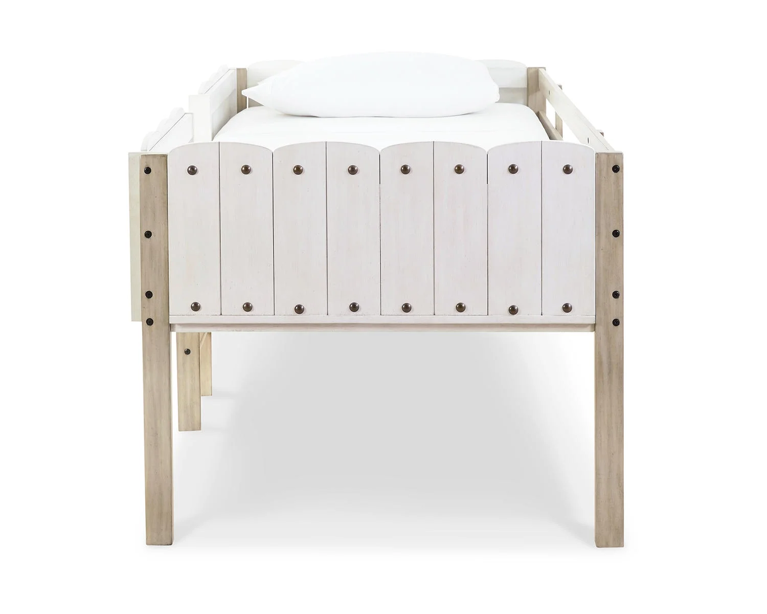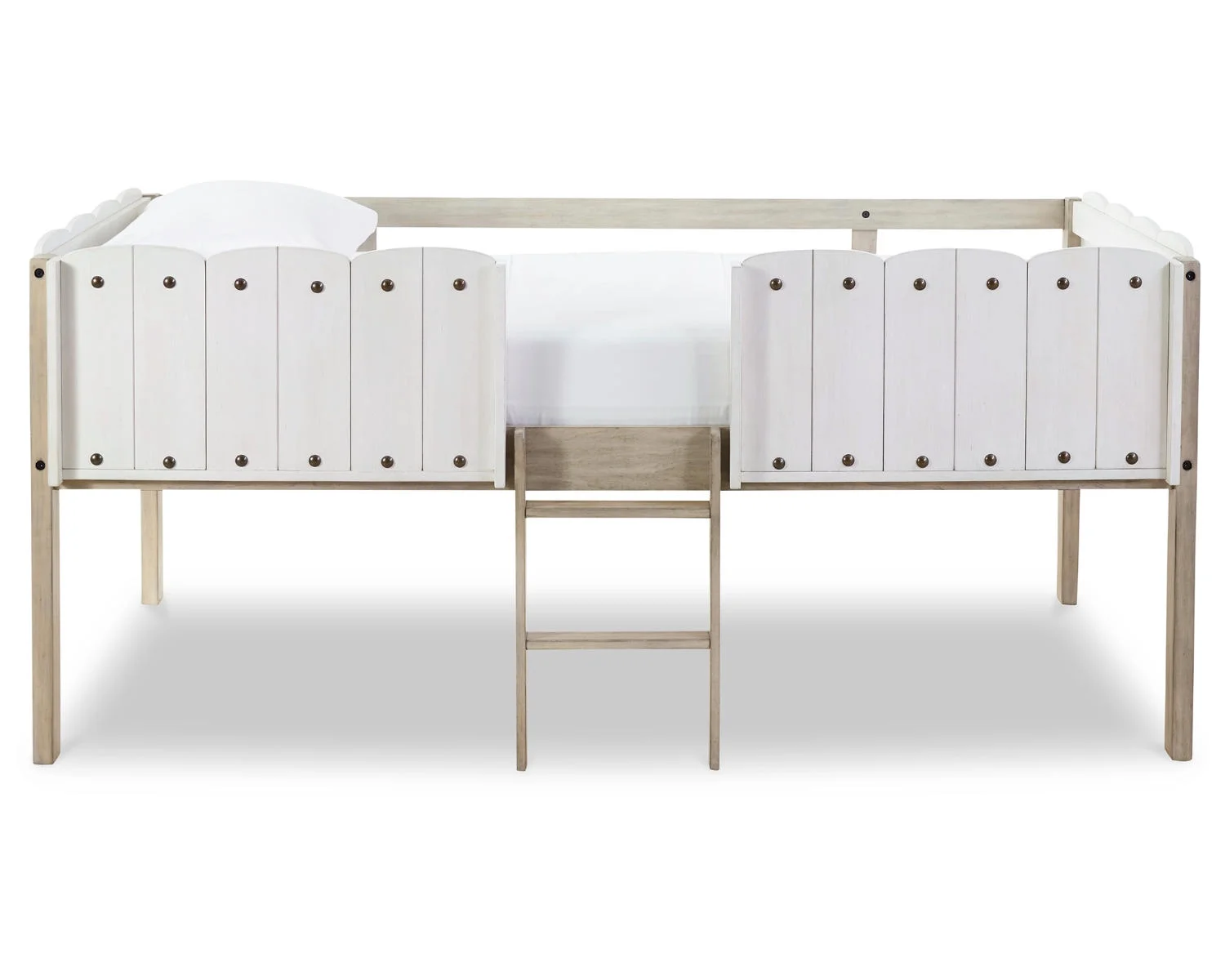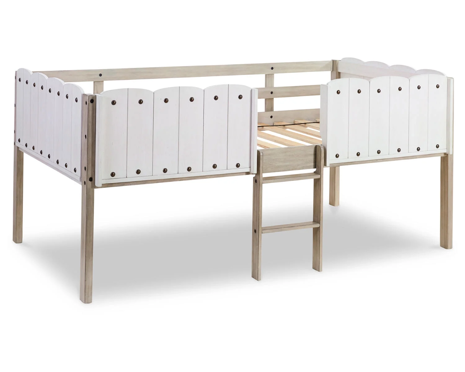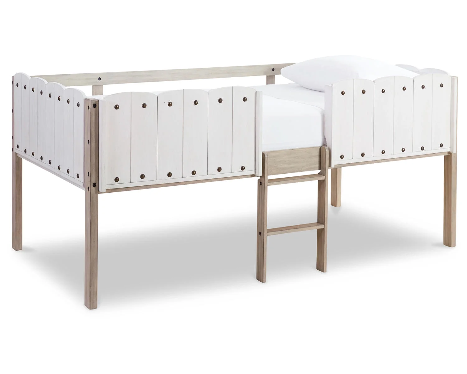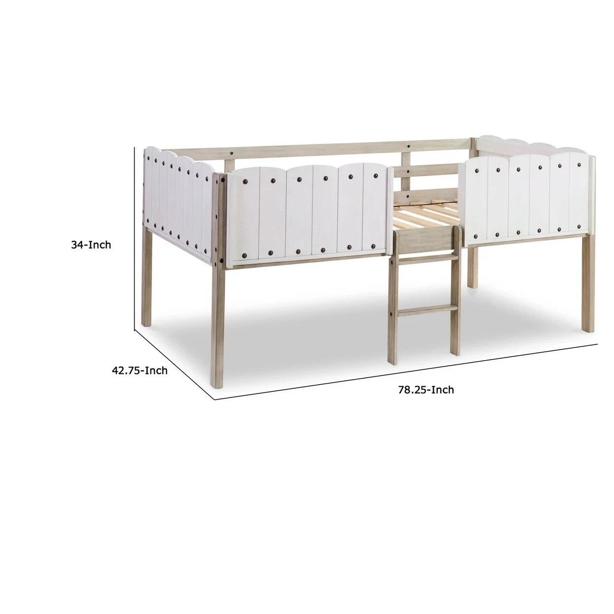 Twin Size Loft Bed Frame with Wood Ladder Wood Grain Side Rails White- Saltoro Sherpi