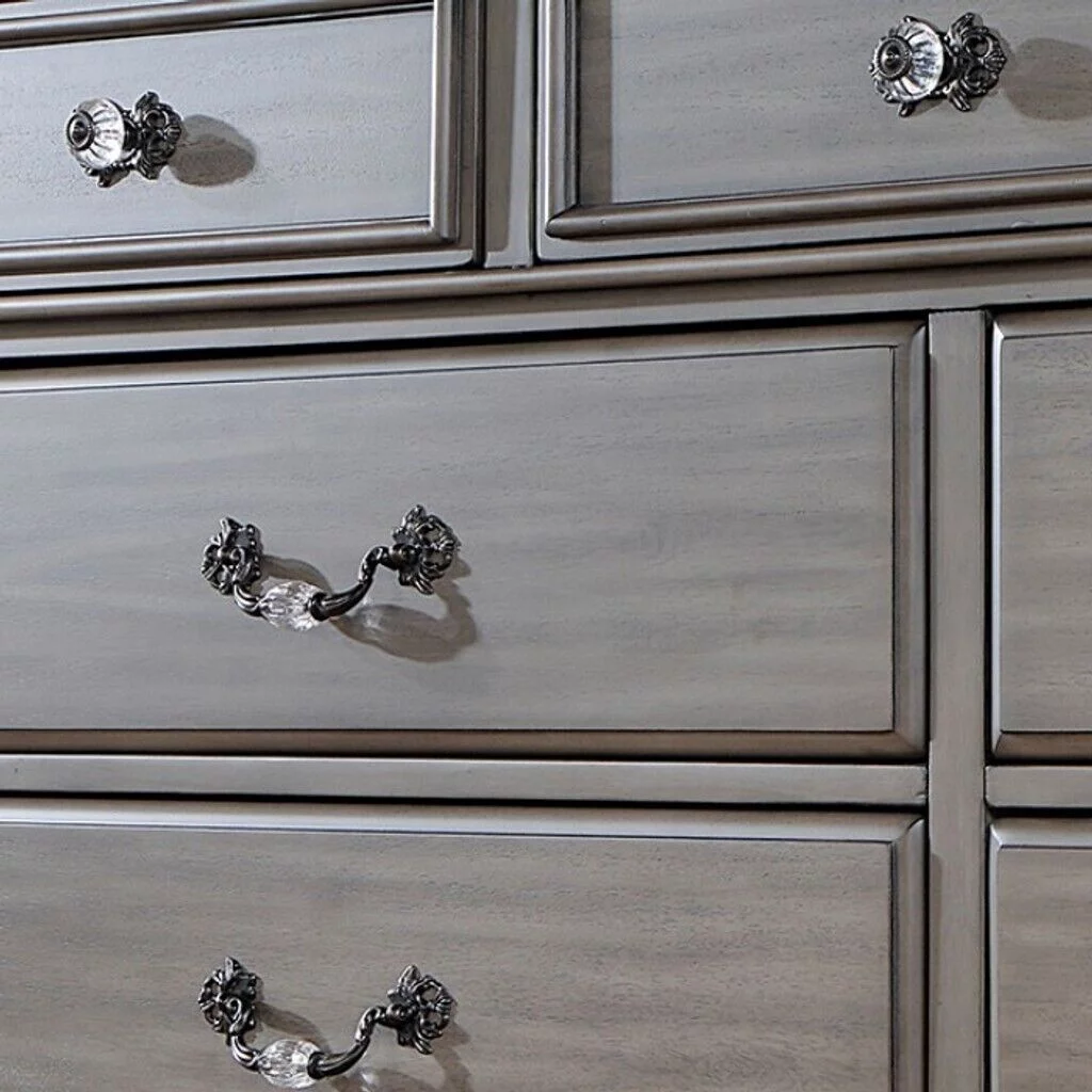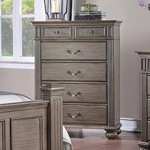 6pc Traditional Bedroom Furniture California King Size Bed Dresser Mirror 2xNightstands Chest Gray Solidwood Posts HB FB