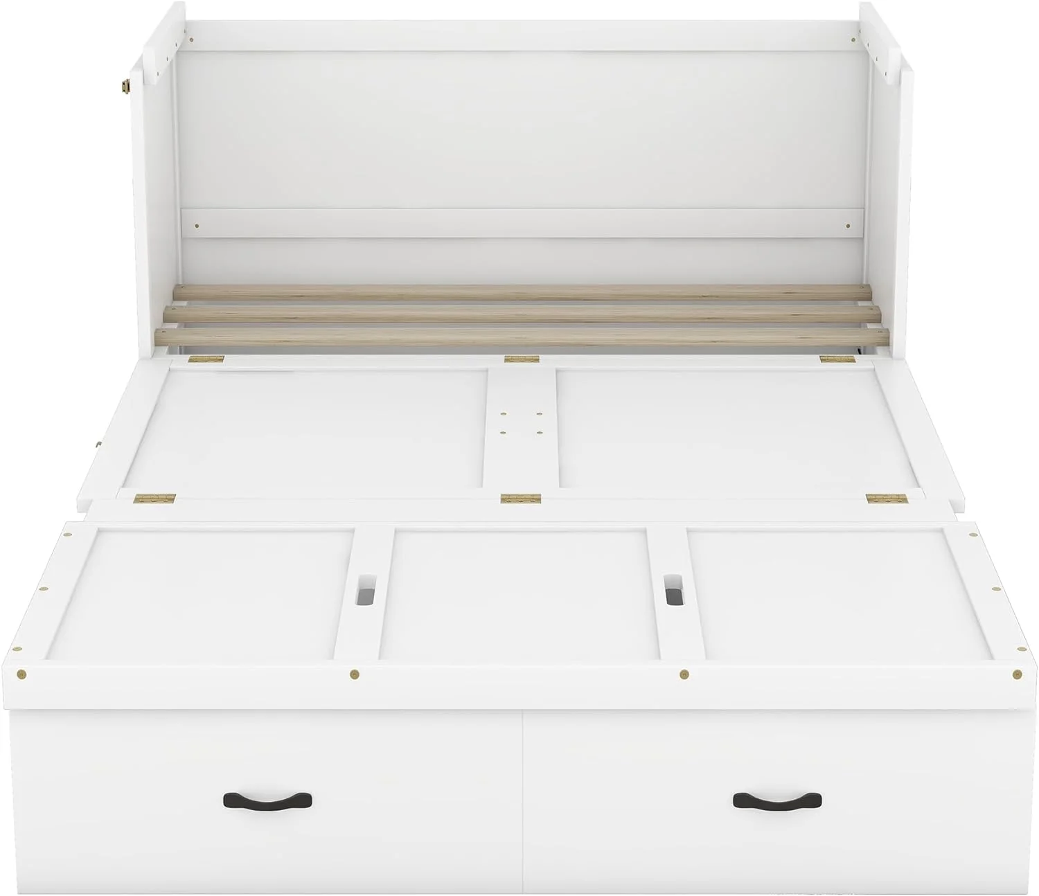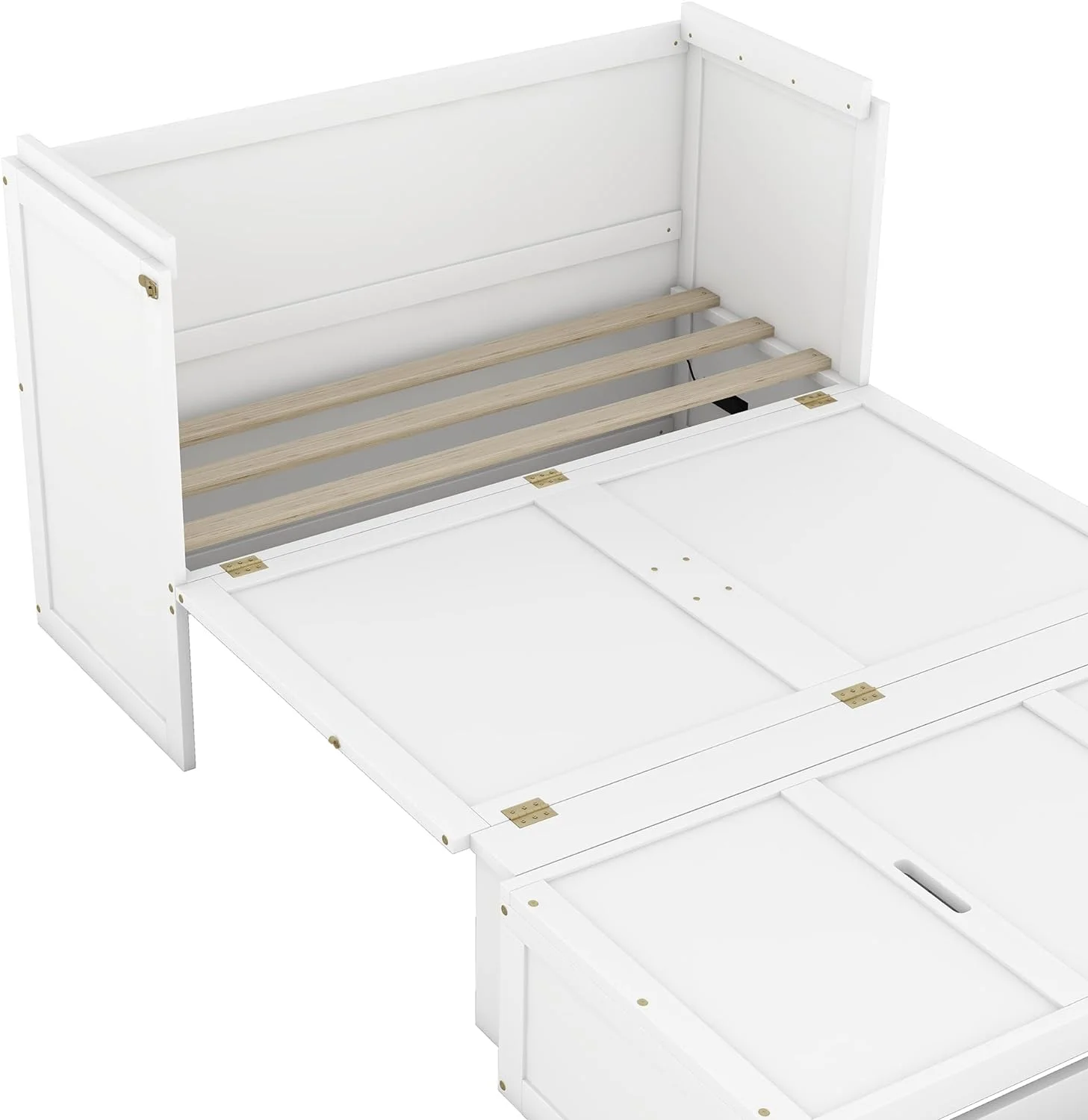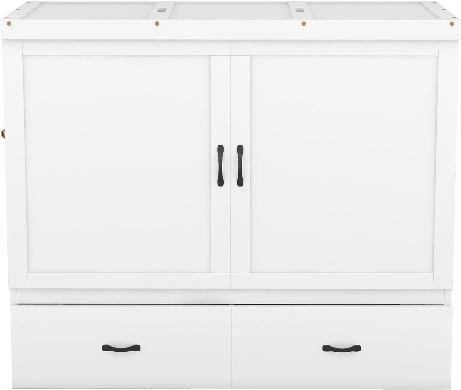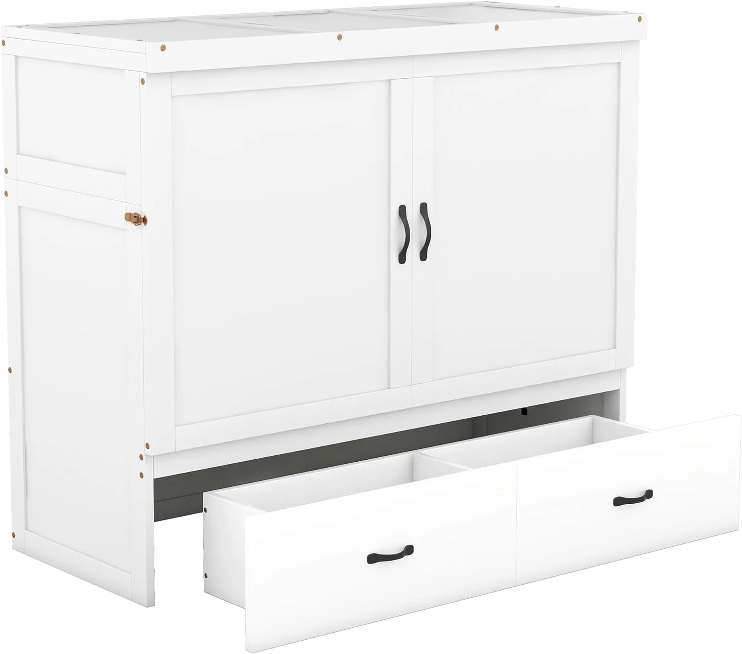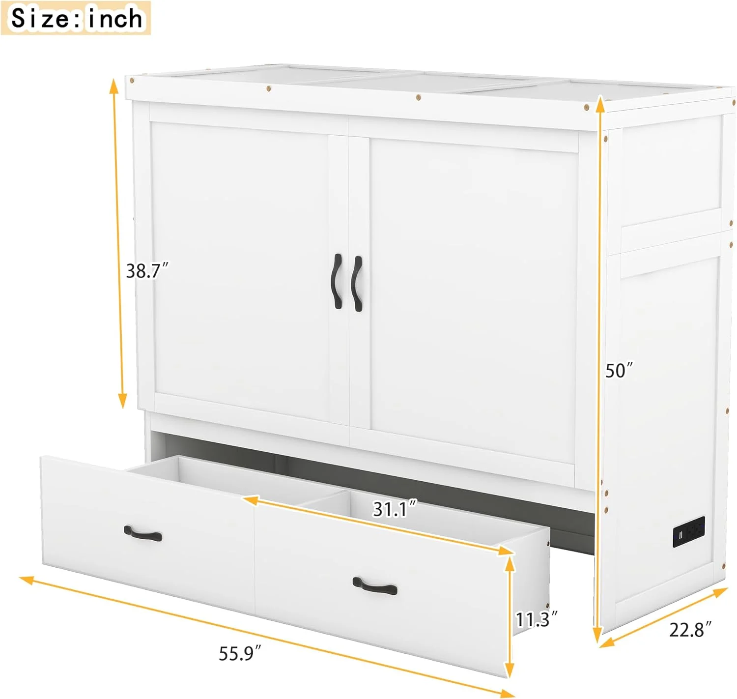 Full Size Murphy Bed Wih USB Por Ad A Large Drawer, Space-Savig Wall Bed For Mulipurpose Gues Room Or Home Office - Whie