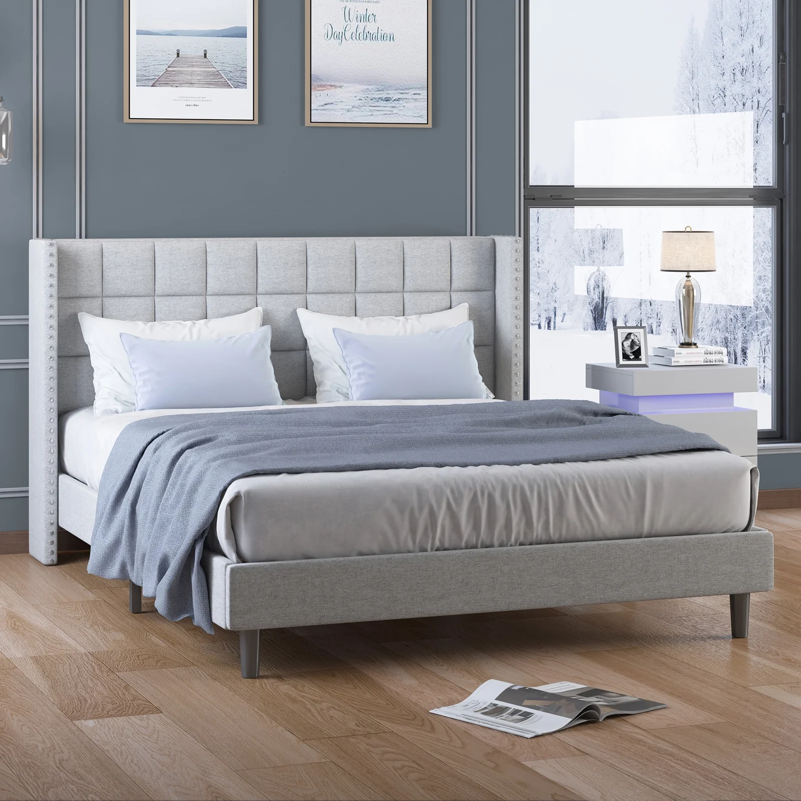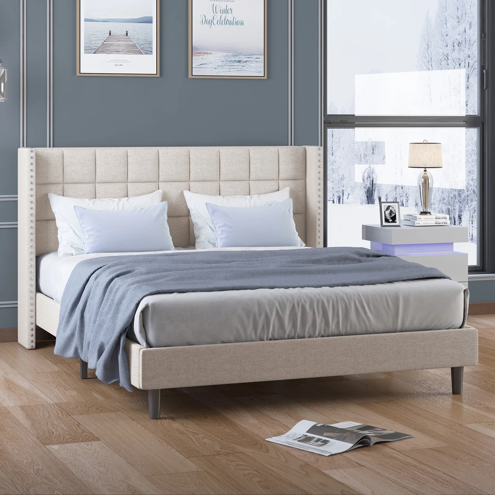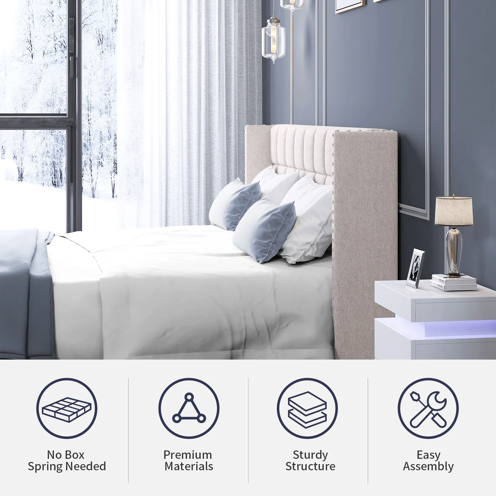Modern Champagne Faux Finish 3pc Full Size LED Backlit HB Bed and Storage Nightstand Wooden Bedroom Furniture Set