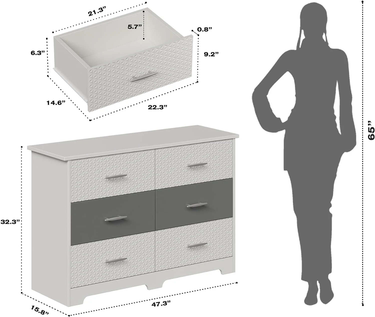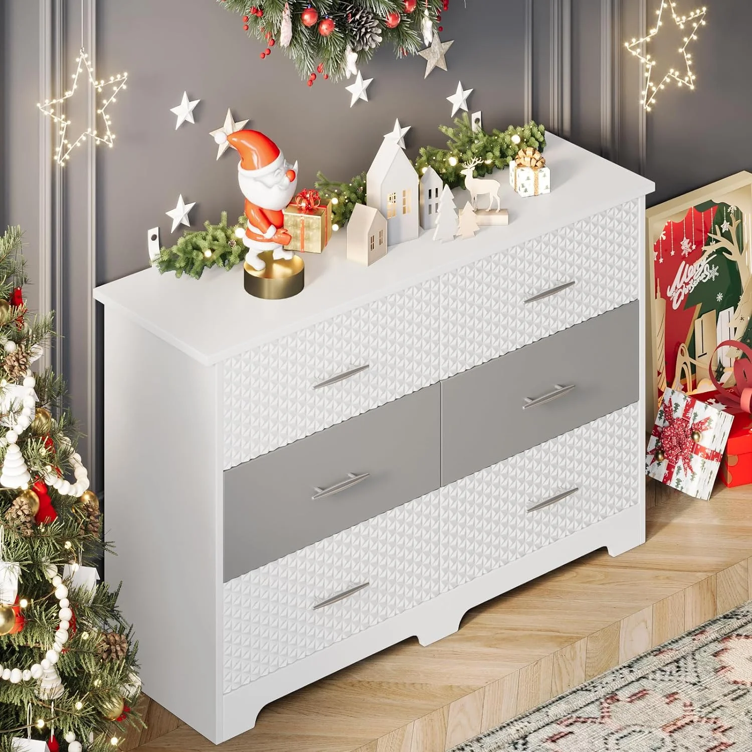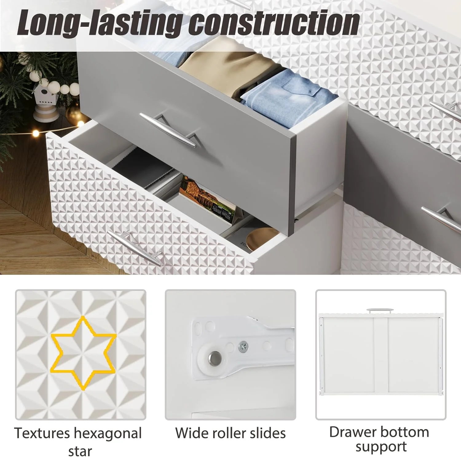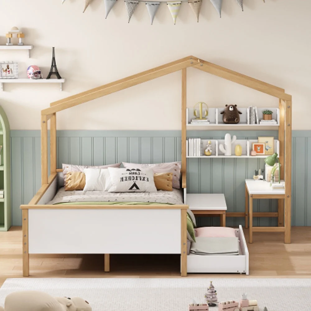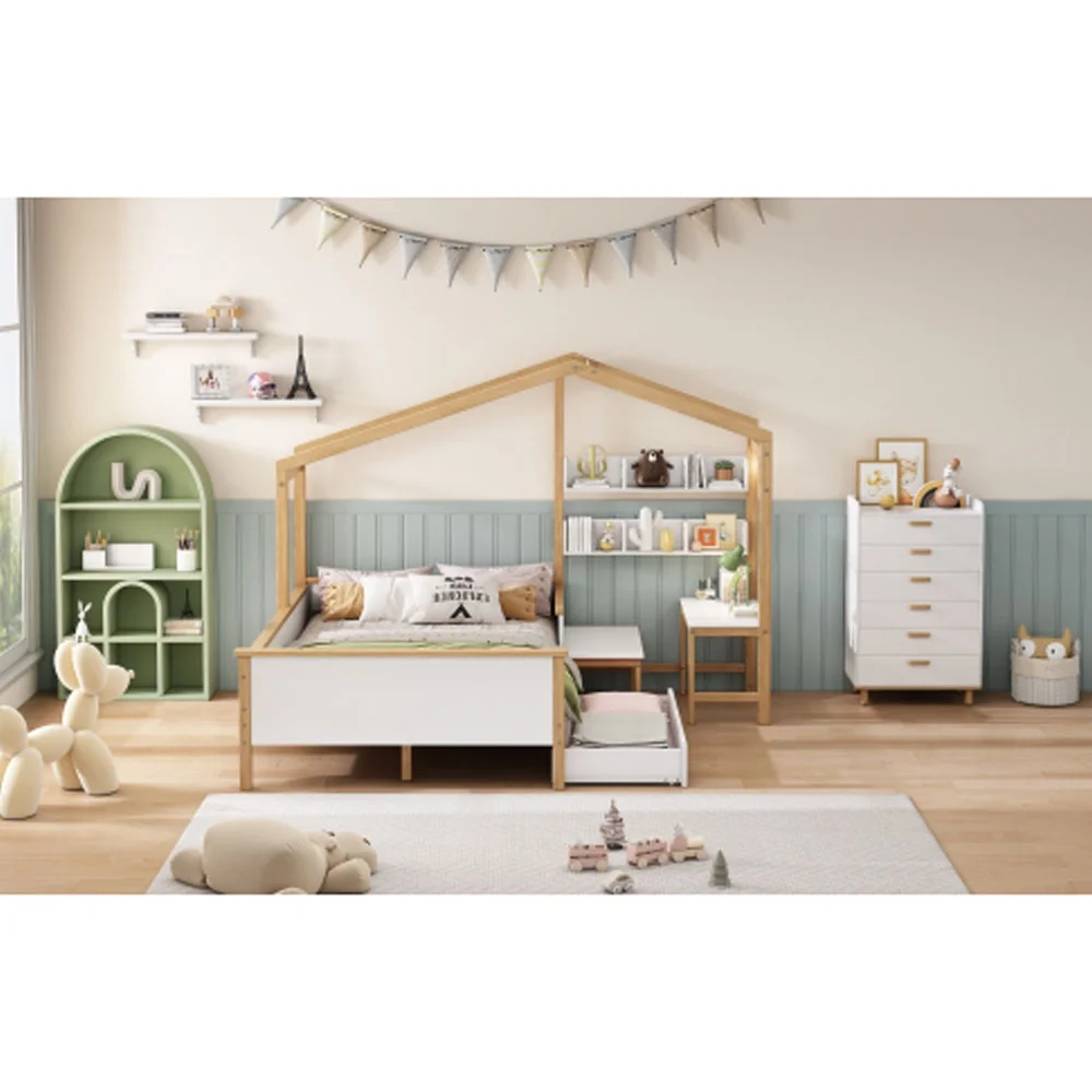 2 Pieces Bedroom Sets White Full Size Wooden House Bed with Desk and 6-Drawer Chest
