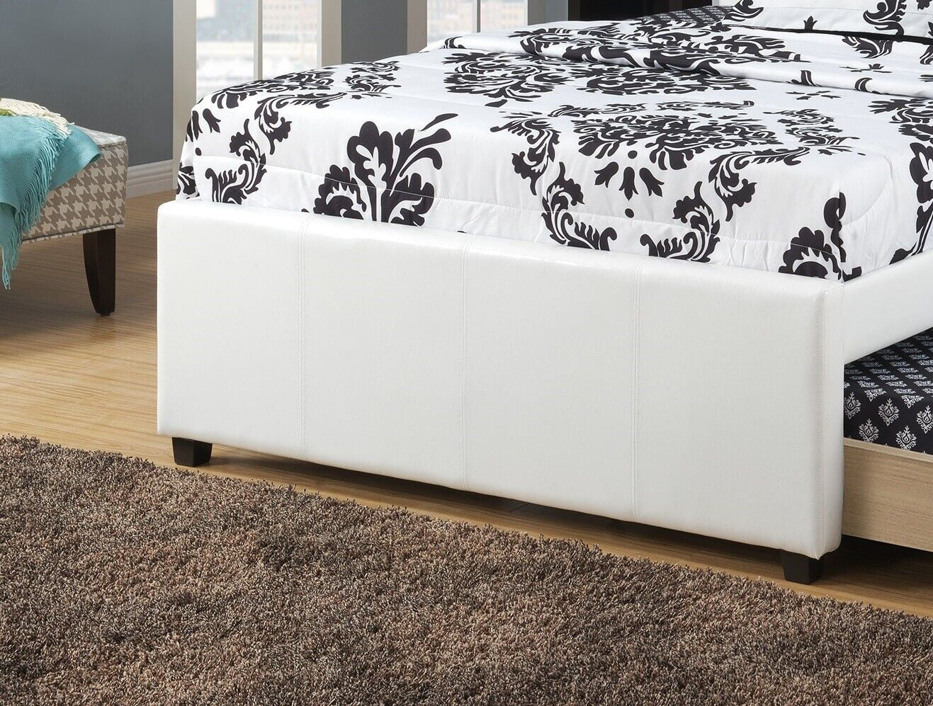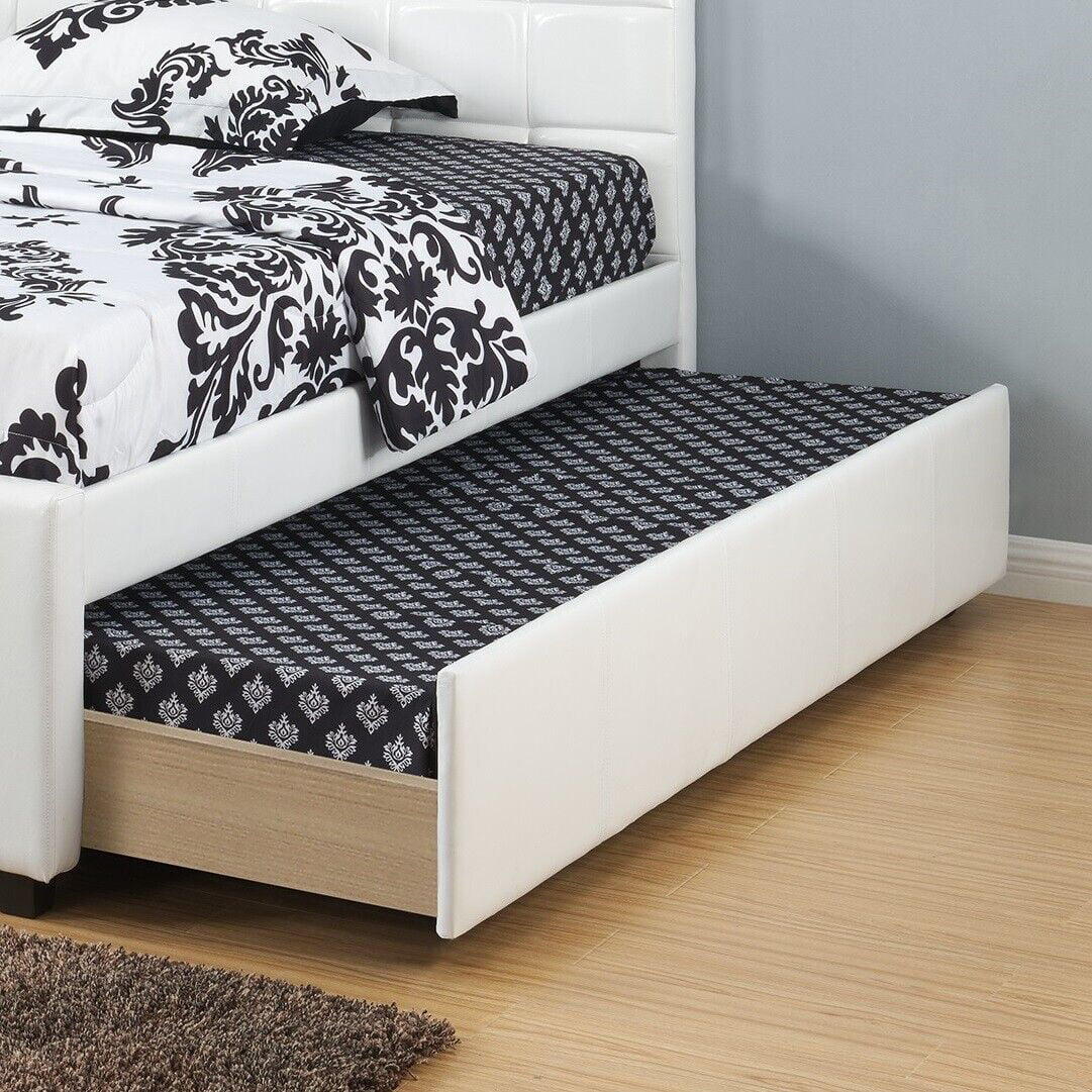 Classic Youth Bedroom Twin Size Bed W Trundle White Faux Leather Upholstered Squared Box Headboard 1pc Bed Furniture