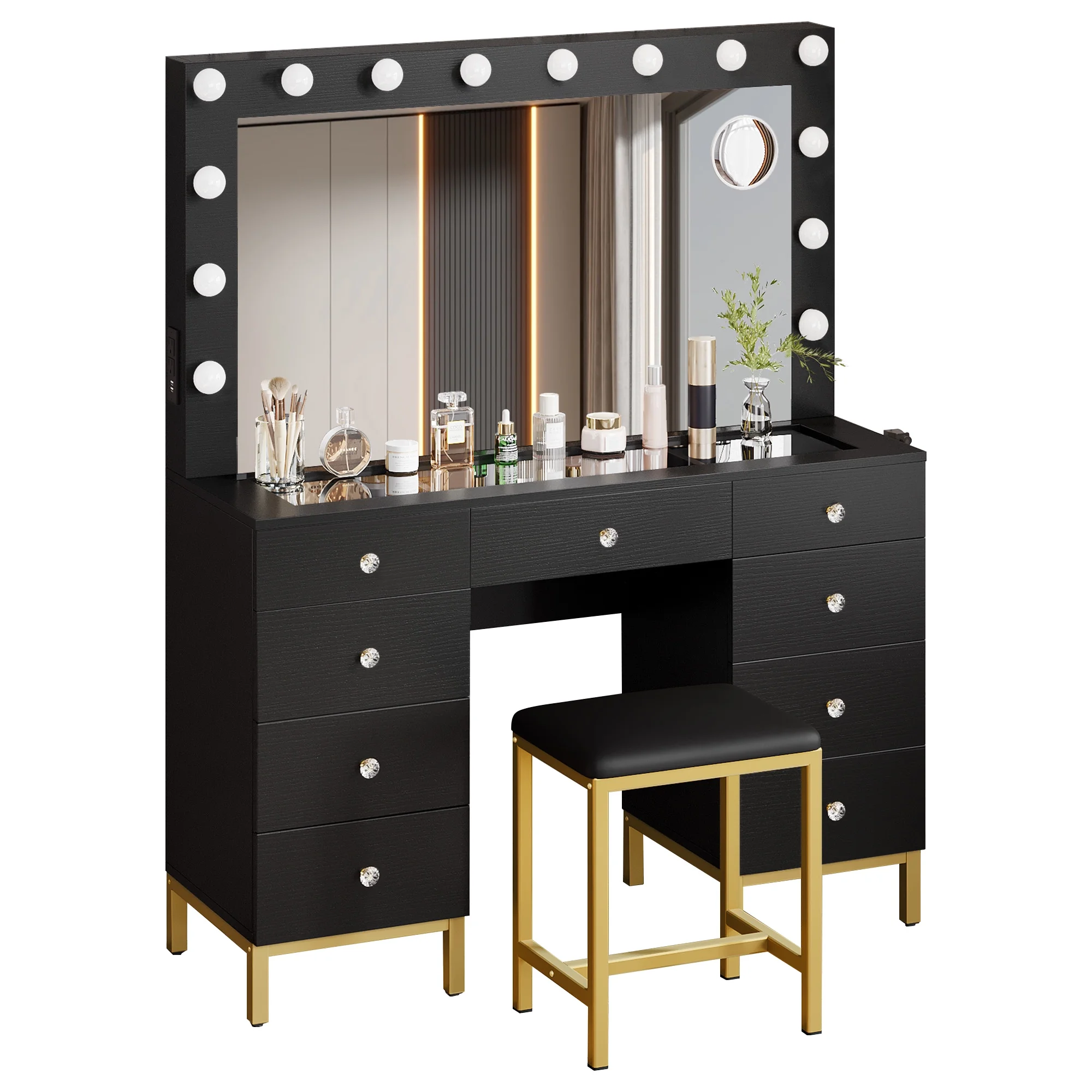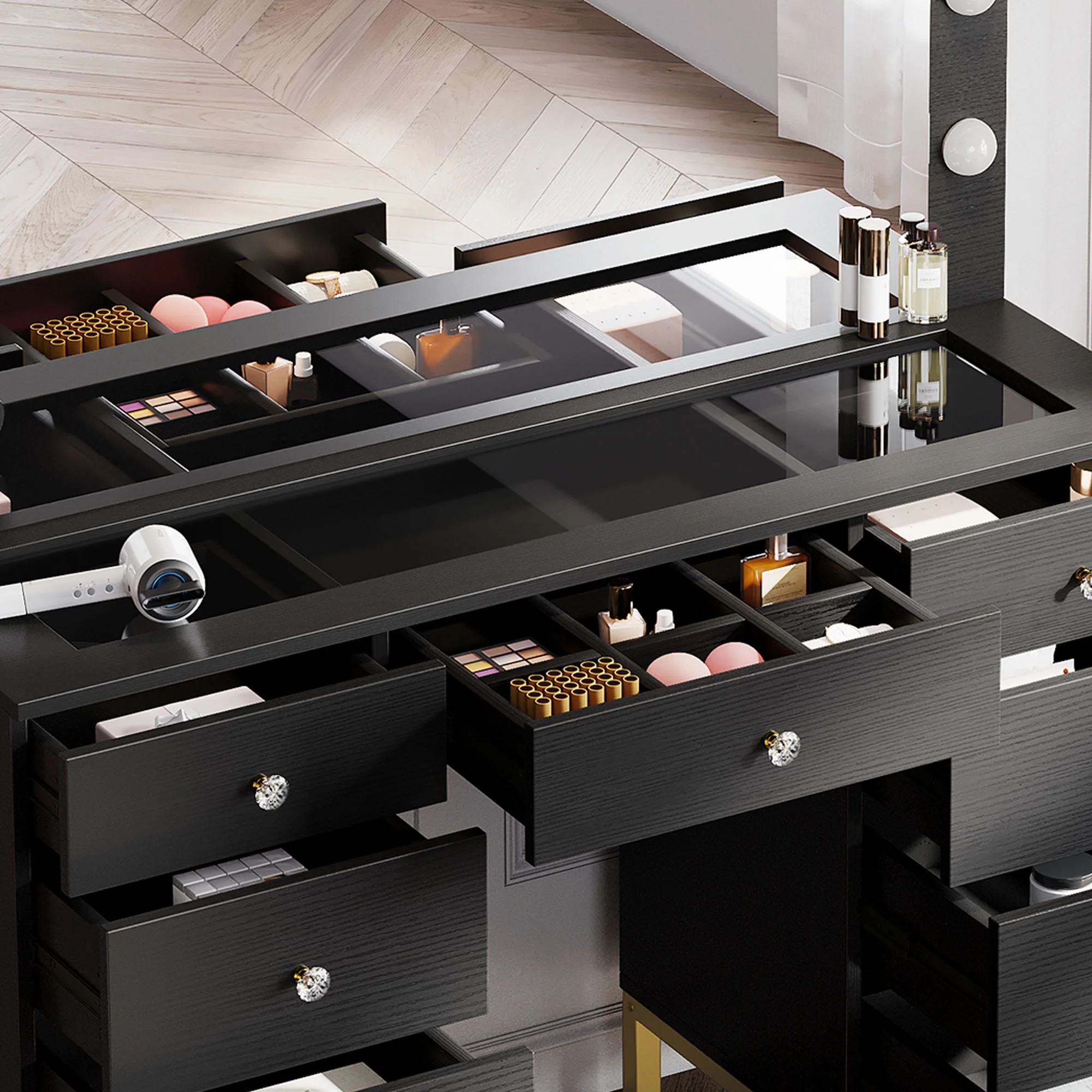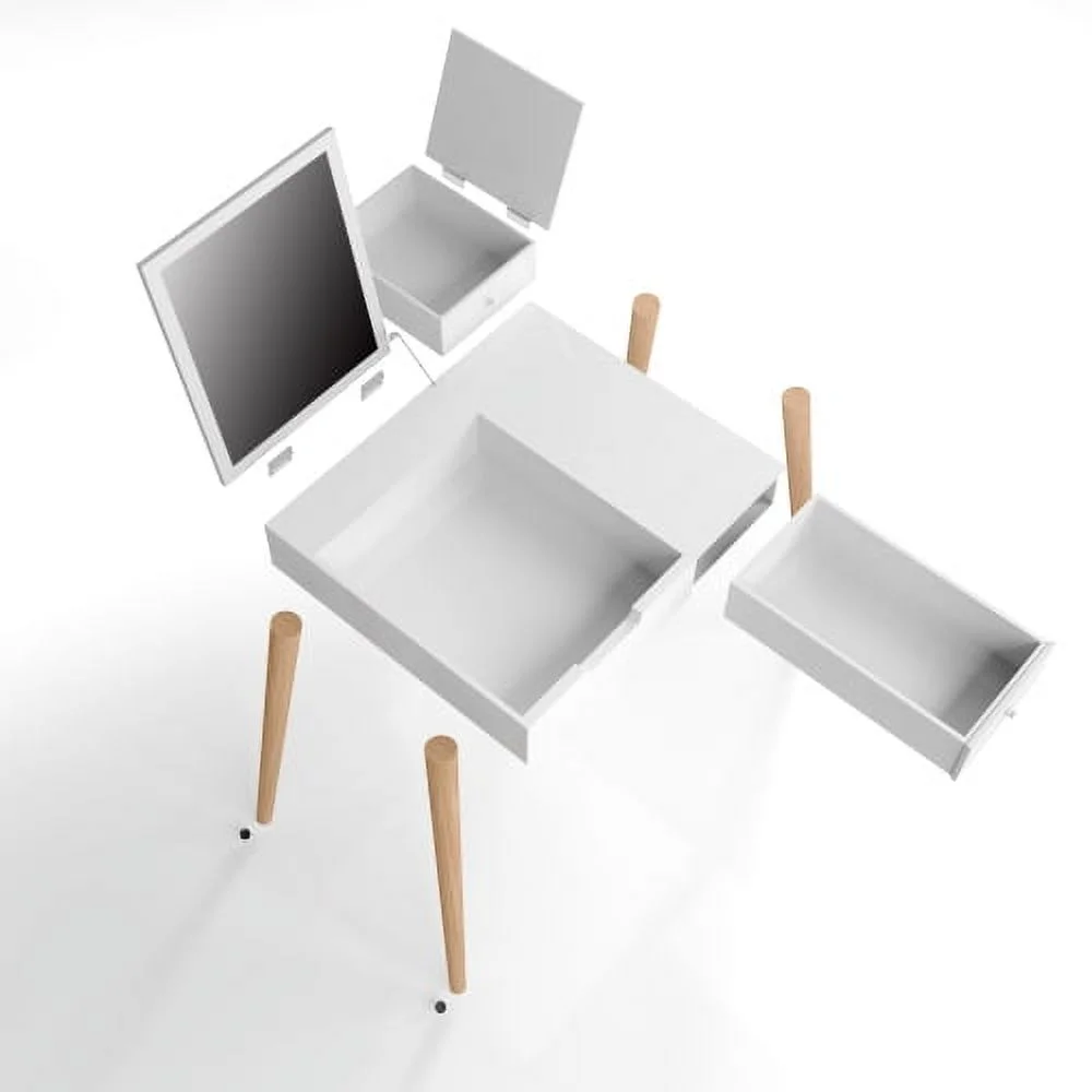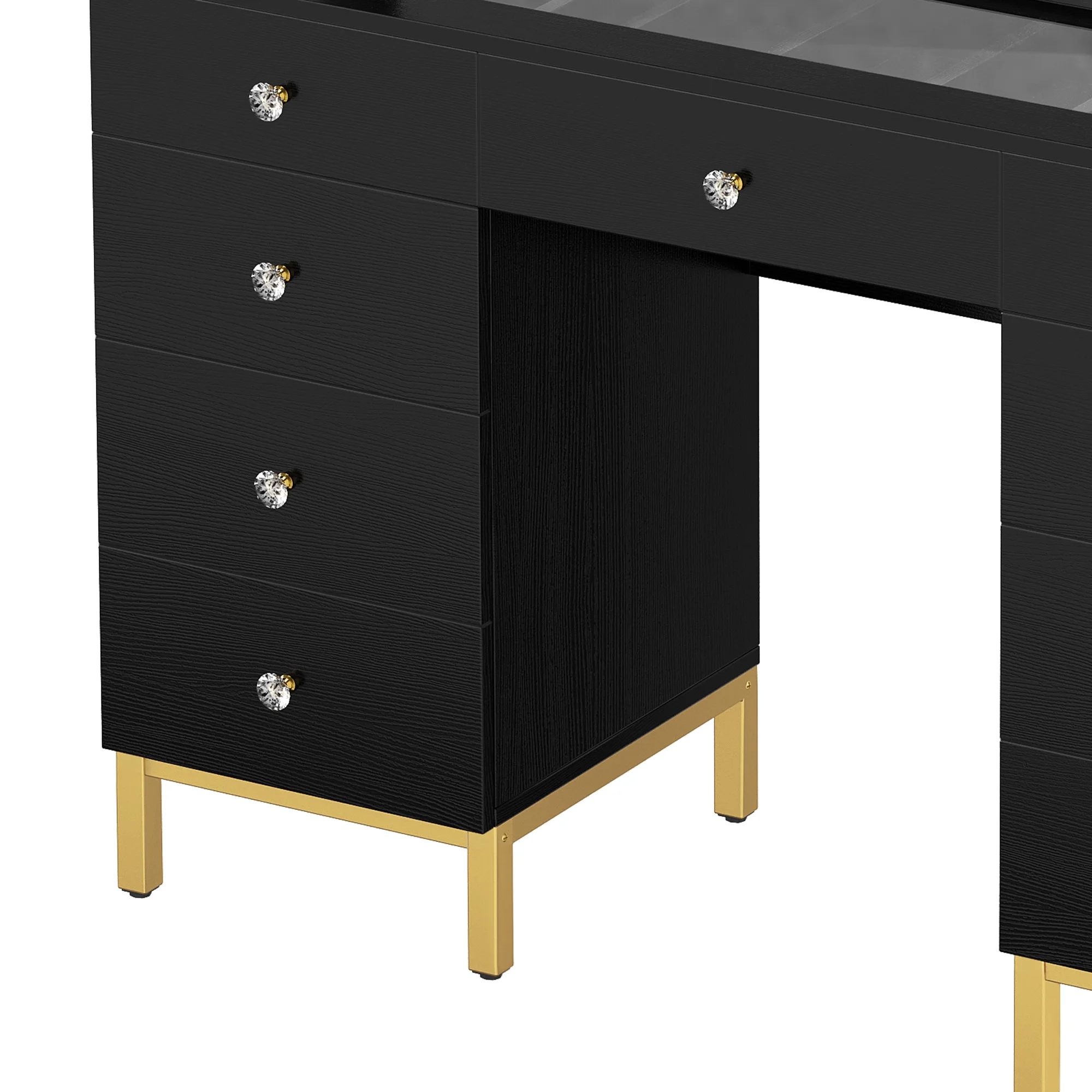 Boahaus Seraphine White Modern Vanity Desk with Mirror, LED Lights, 7 Drawers, Crystal Ball Knobs, for Bedroom